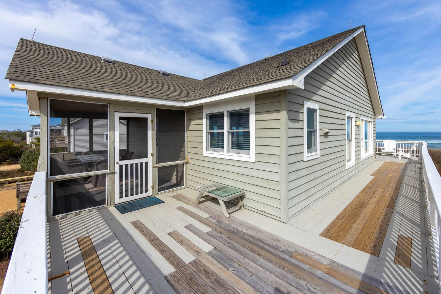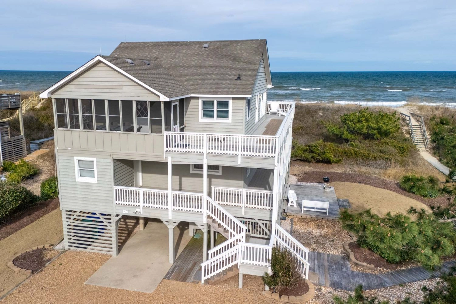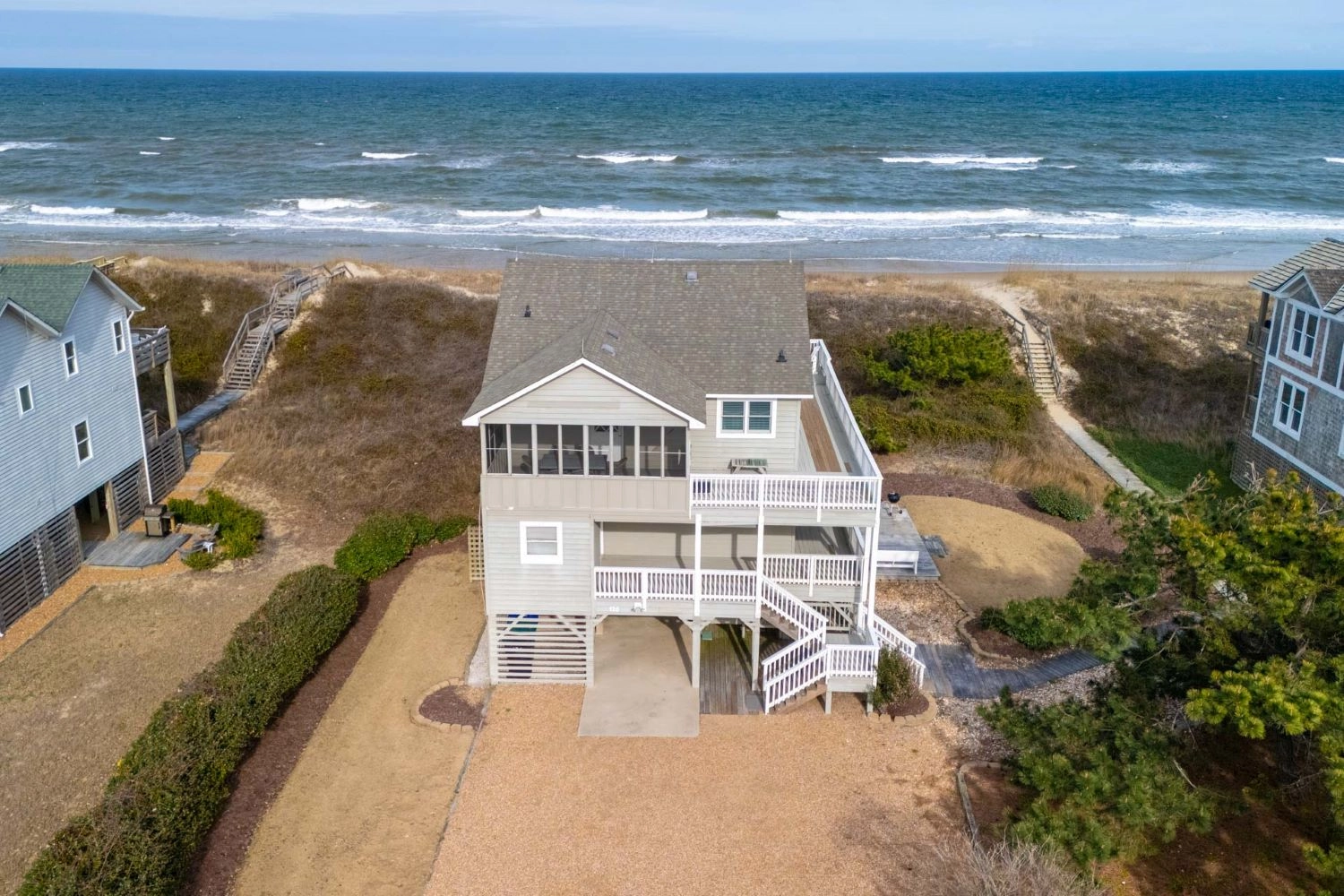 "Lovely stay at this well maintained beachfront home. Great location in the Sanderling Community, just minutes from Duck’s central shopping district. I can’t think of a better town to stay in on OBX. The main floor of the house is spacious, open and comfortably furnished. Beautiful light and ocean views, adjacent to a direct path over the dunes to the beach. The bedrooms are simply but nicely appointed and we appreciated the firm mattresss and new linens. Slept great. Two parents, two teens and grandma had a very happy and memorable week."