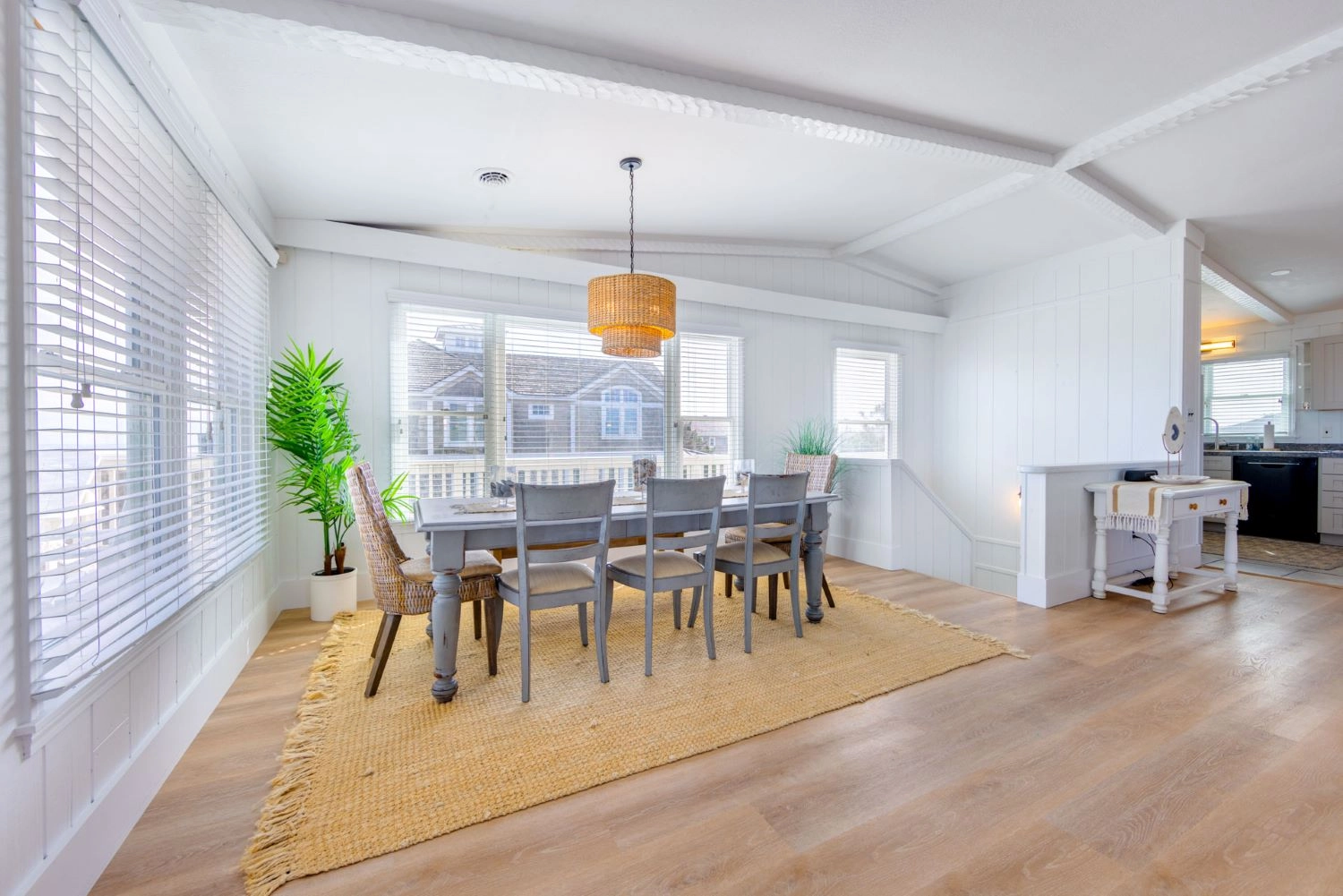 "This house was a good choice for our family getaway. The carpeted floors are little kid friendly. Great room had nice views, a big 10-person table with room for crafts and puzzles, and a new TV. Beach access is a short walk away over the dunes. Next time we will bring kitchen rags, towels, and spray cleaner for tidying because the house had only two kitchen towels. There was no dish drain, but otherwise the kitchen was well stocked with silverware, dishes, and glasses. We didn't discover until halfway through the trip that the house has TWO thermostats, so the bedroom floor was chilly for several nights until we figured that out. A "guide to this house" would have been nice. The open showers in the master bedrooms are a little odd -- a shower curtain would be welcome. Overall this house had a great location close to the beach and was well-worn enough to make us feel at ease with kids."