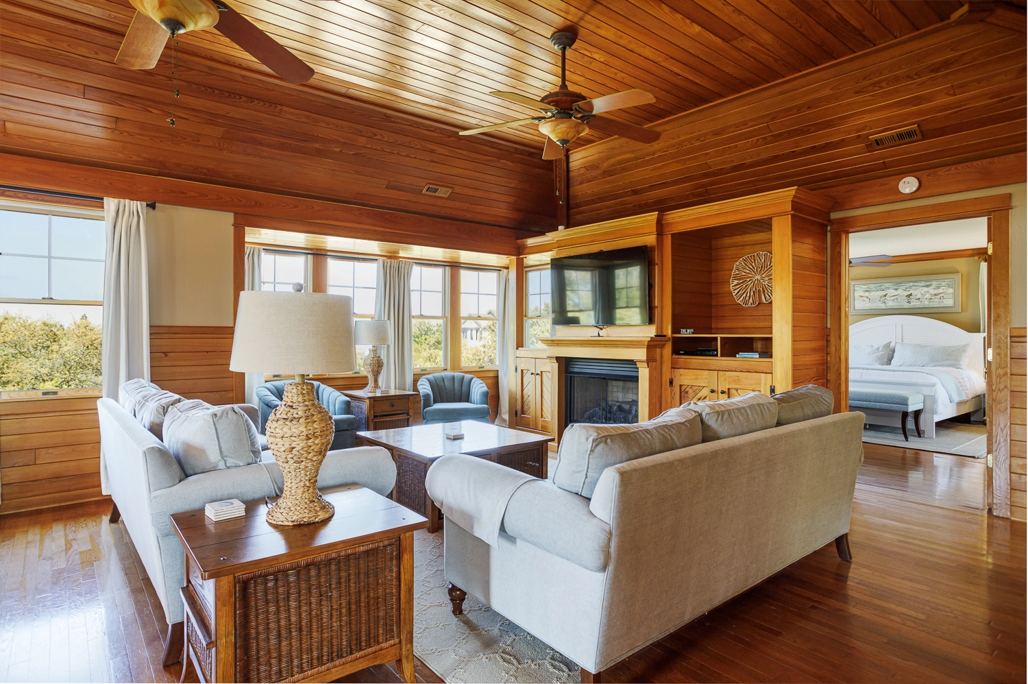 Den; sitting area; laundry with kitchenette, refrigerator, and microwave; screened porch.
