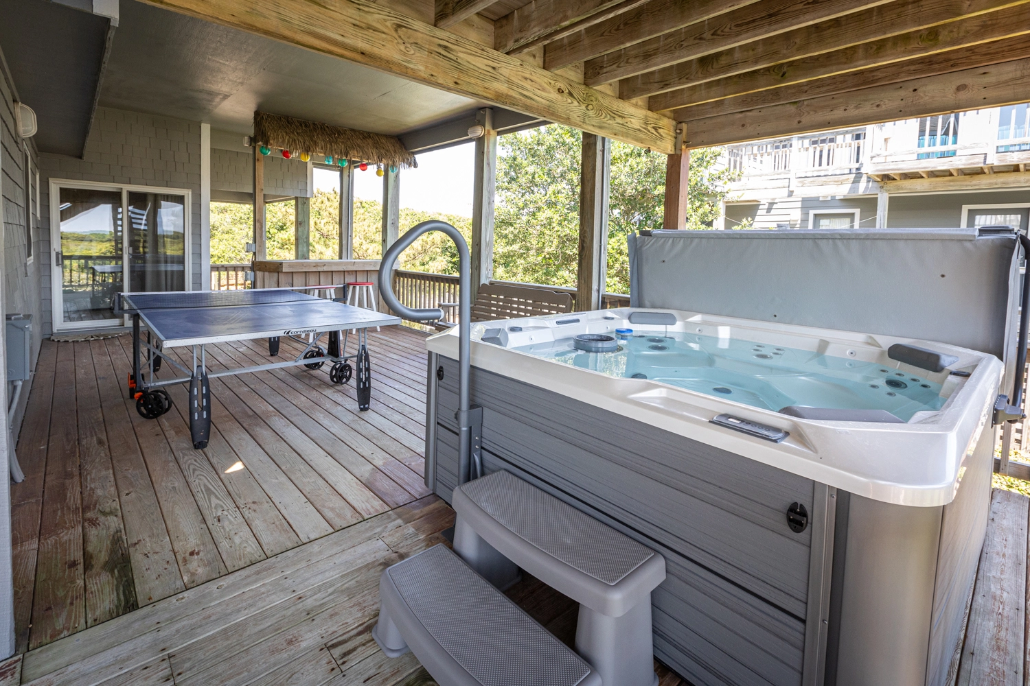 Hot tub, outside ping pong table; tiki bar, community pool and tennis access. Electrical Vehicle Charger- tesla universal wall connector with a NACS plug and a J1772 adapter. This is located on the right side carport on Level 1.