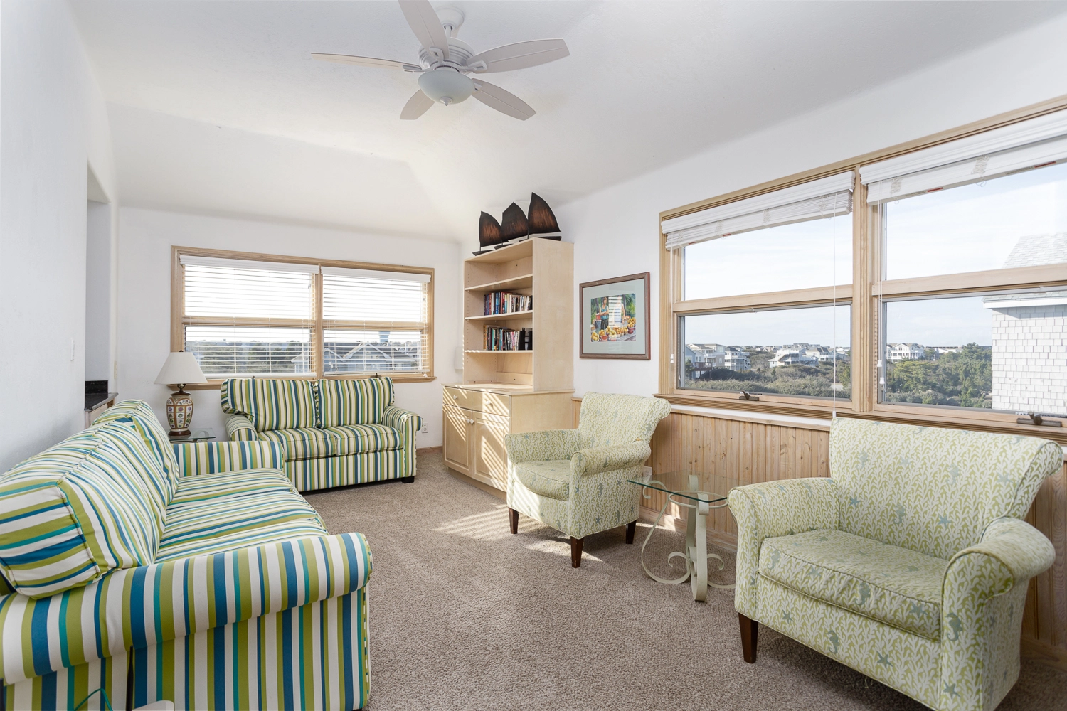 "the view is outstanding, the upper floor with all of the windows makes for a very bright and sunny living area."