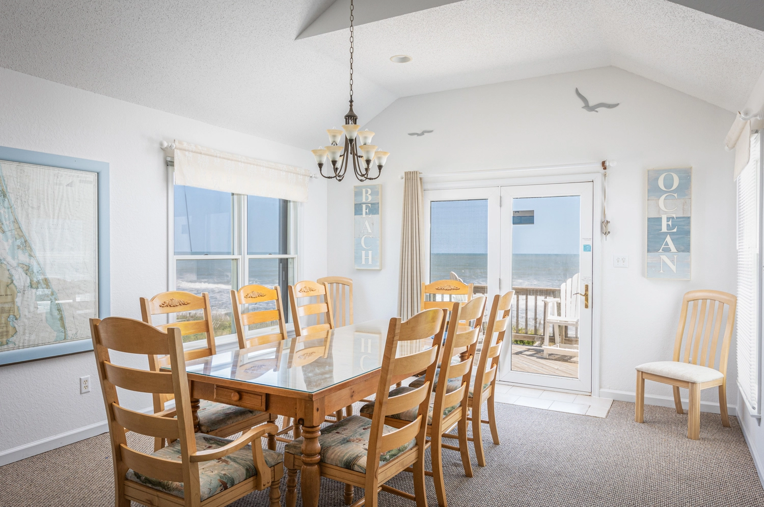 Great room; kitchen; dining area; decks and walkway to dune deck.