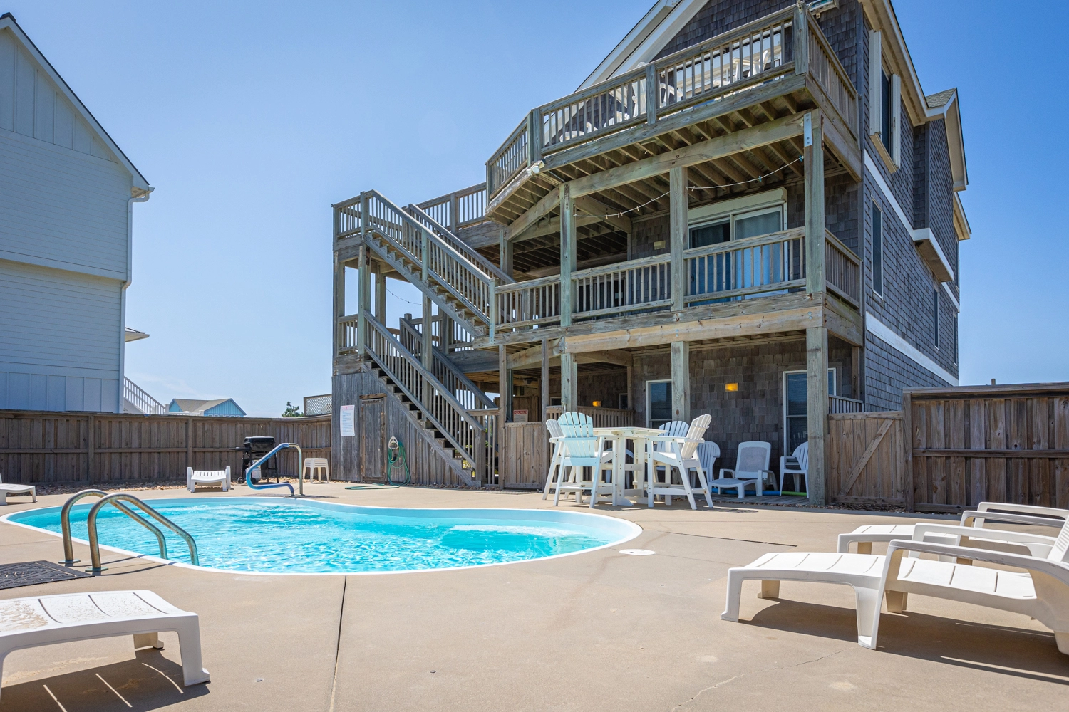 "This house had a great lay out. We thoroughly enjoyed the view of the ocean off the third floor deck. We liked having the primary bedroom on that top floor and all the others on the second or bottom floor. This house has great amenities: pool, hot tub, outdoor shower, kitchen walk-in pantry, ice makers, and great game room with pinball, pool table, air hockey and more. It is also in a great location in Duck. We drove to stores in Duck, but you could walk to some places. Air conditioner and ceiling fans worked well. When it rained, the game room provided entertainment."