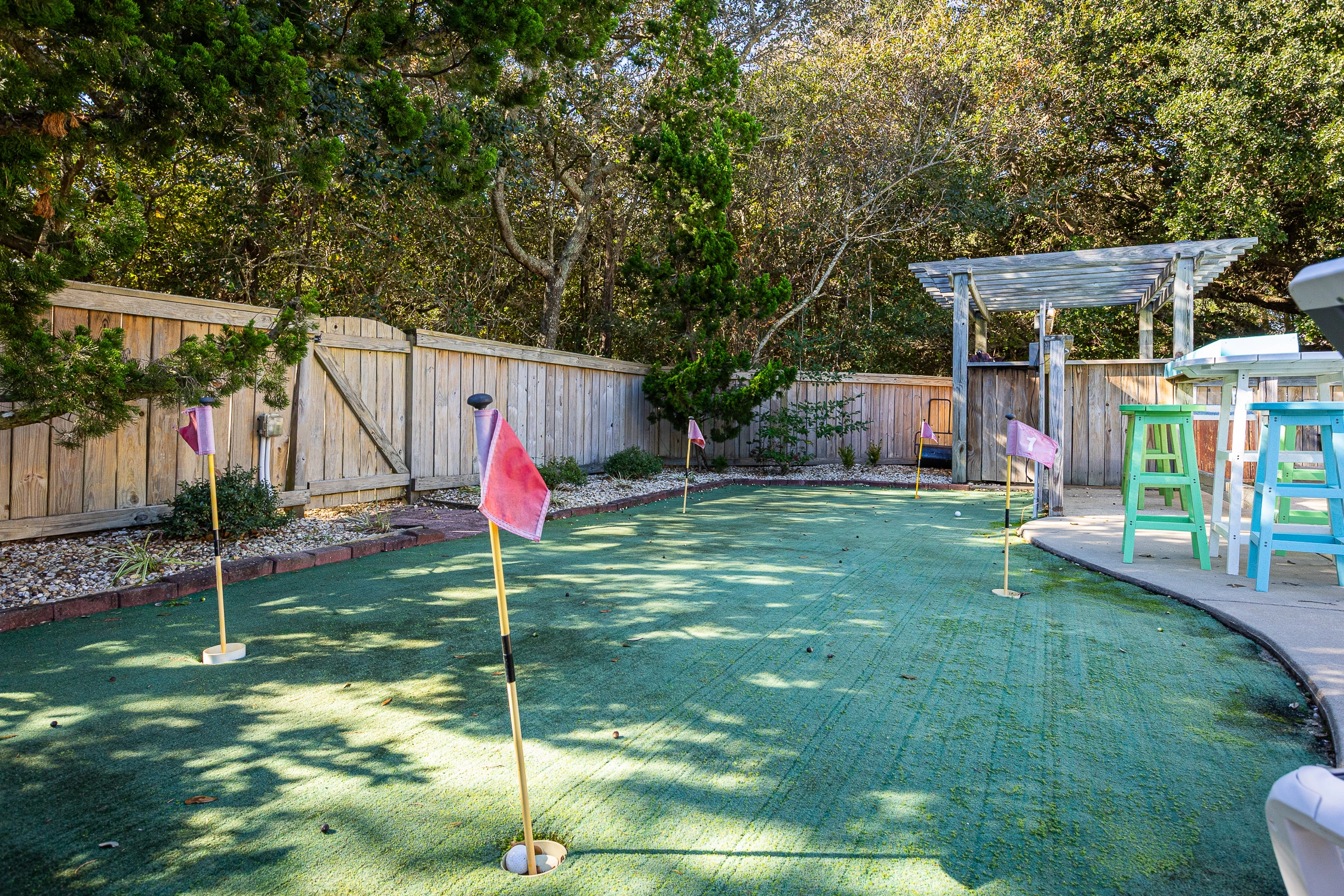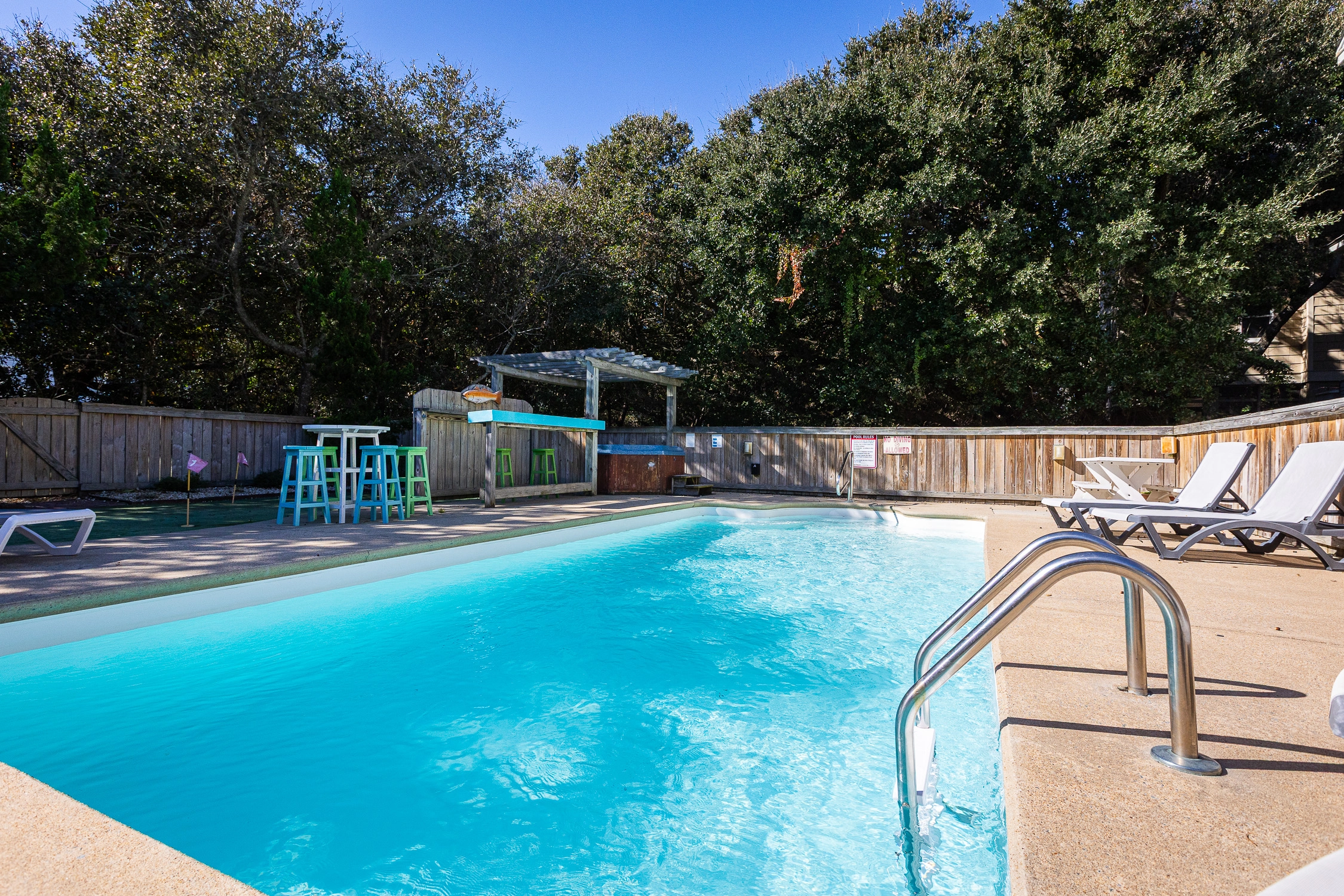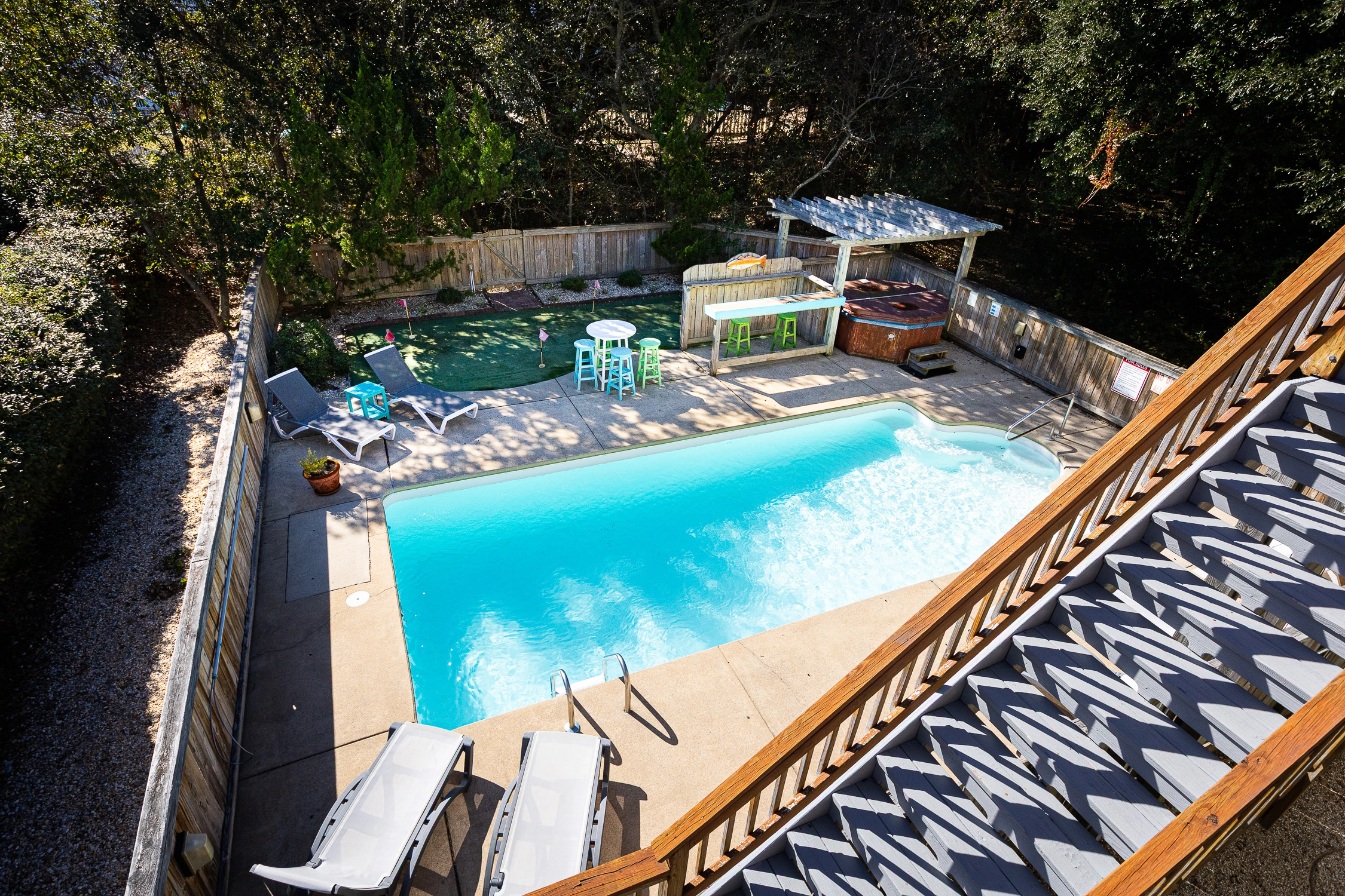 Private pool, hot tub, tiki bar, putting green, charcoal grill.
