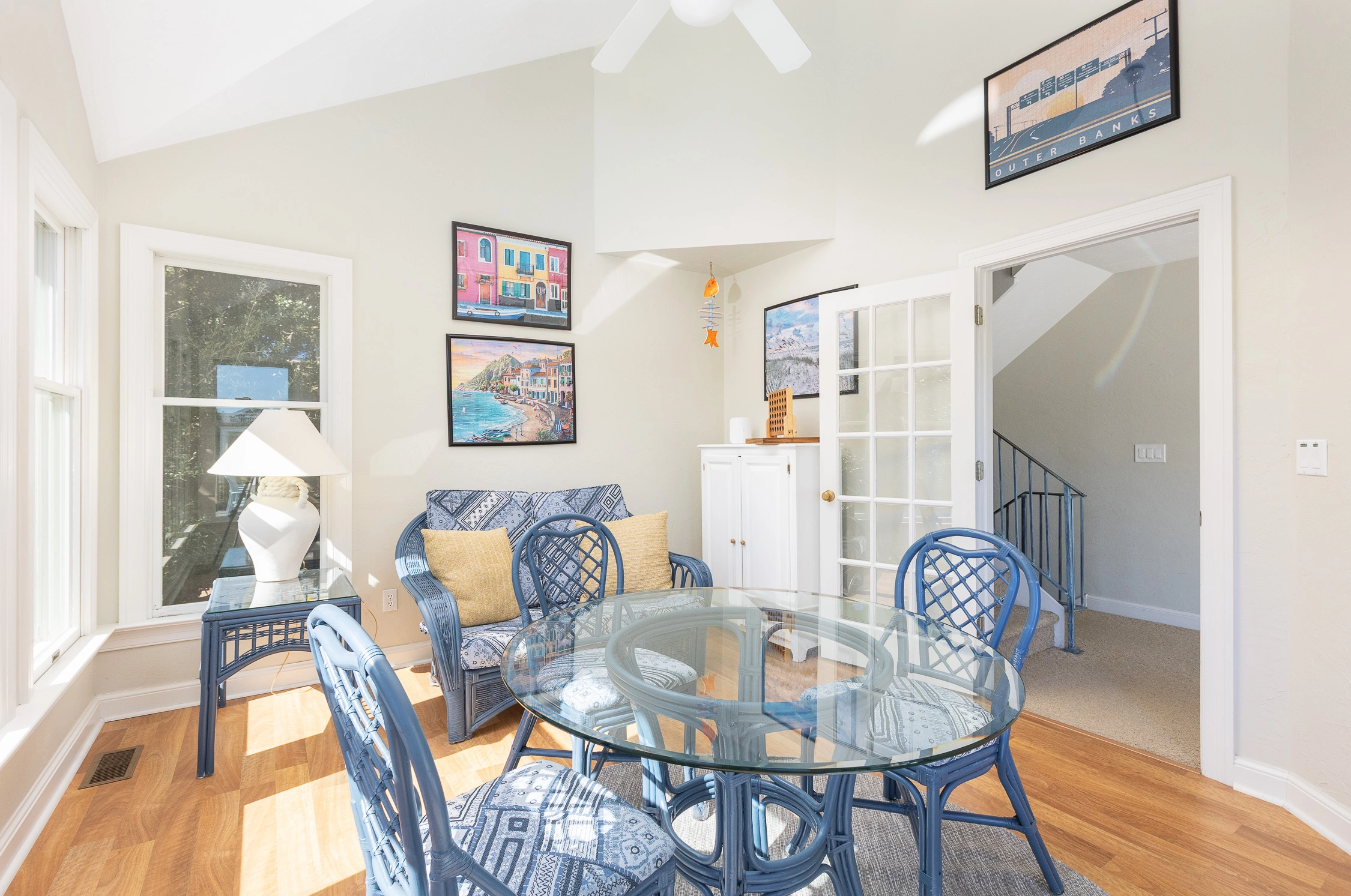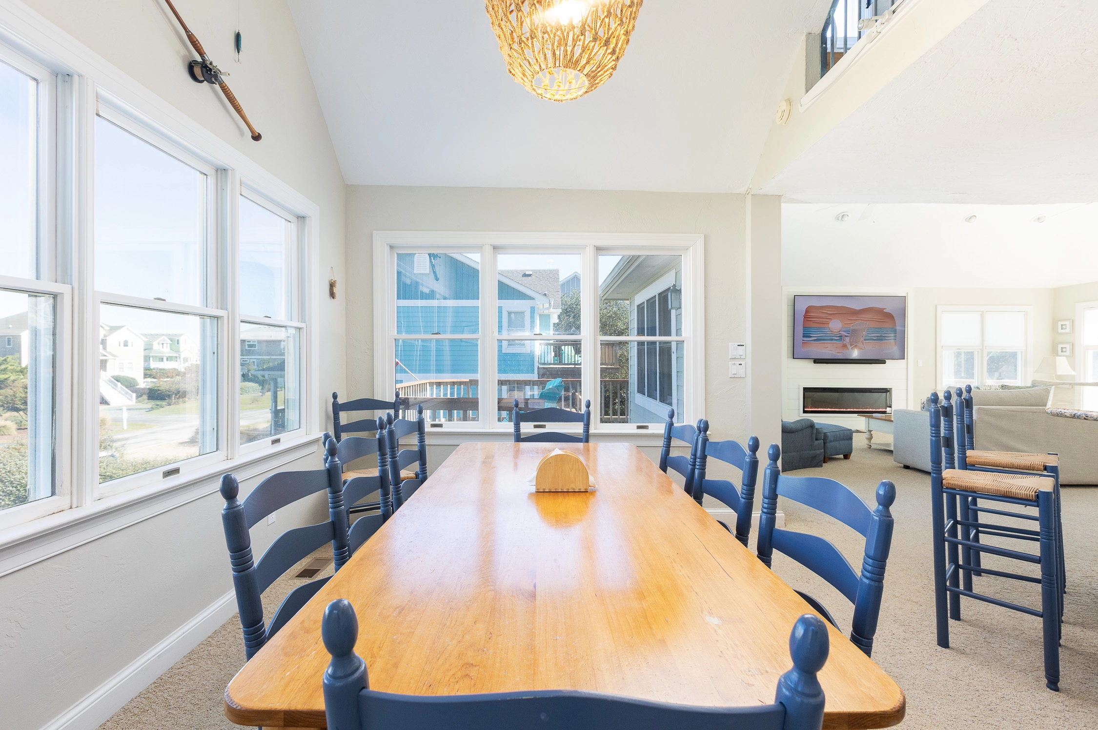 Great room with electric fireplace; kitchen; dining area; den.