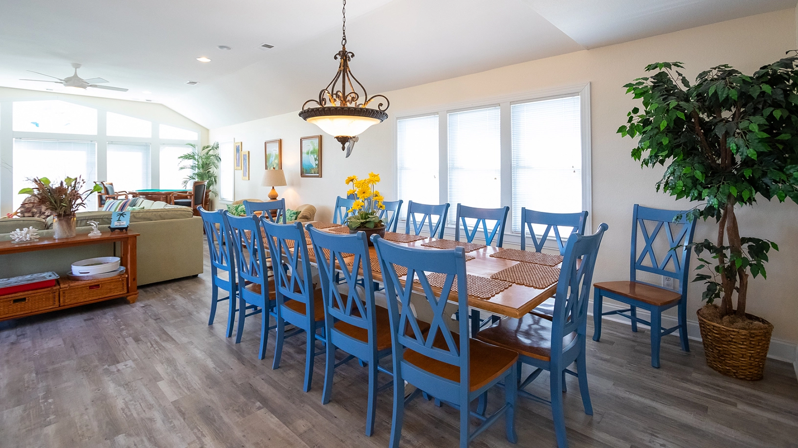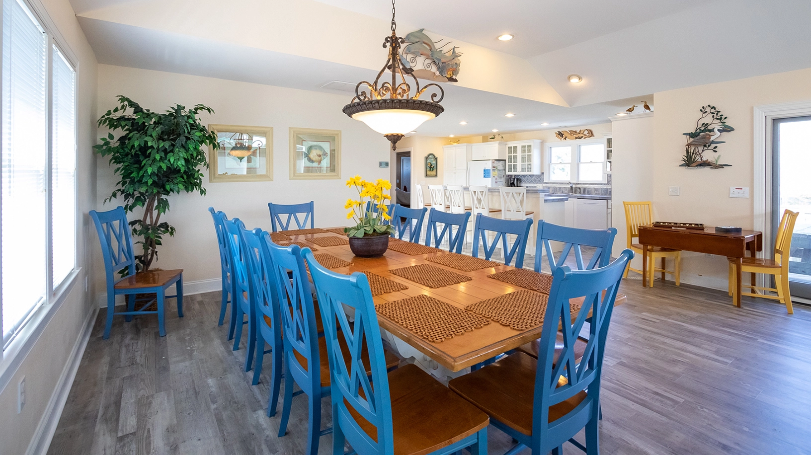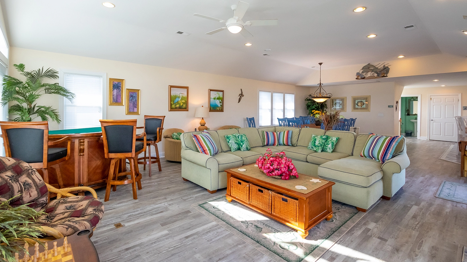Great room with gas fireplace, home theater system, casino table, chess table, and deck access; kitchen with 2 dishwashers, 2 ovens, microwave, and breakfast bar; dining area.
