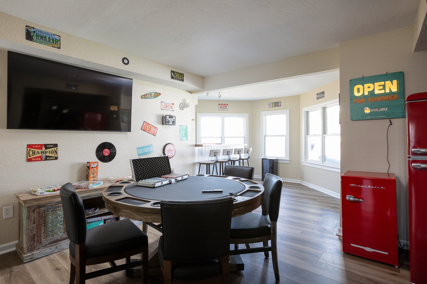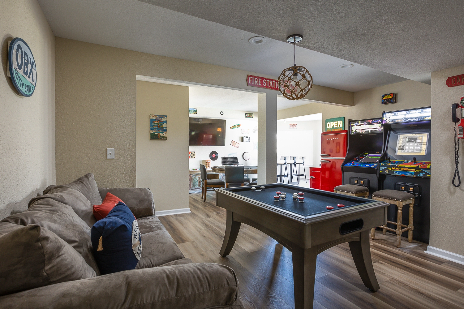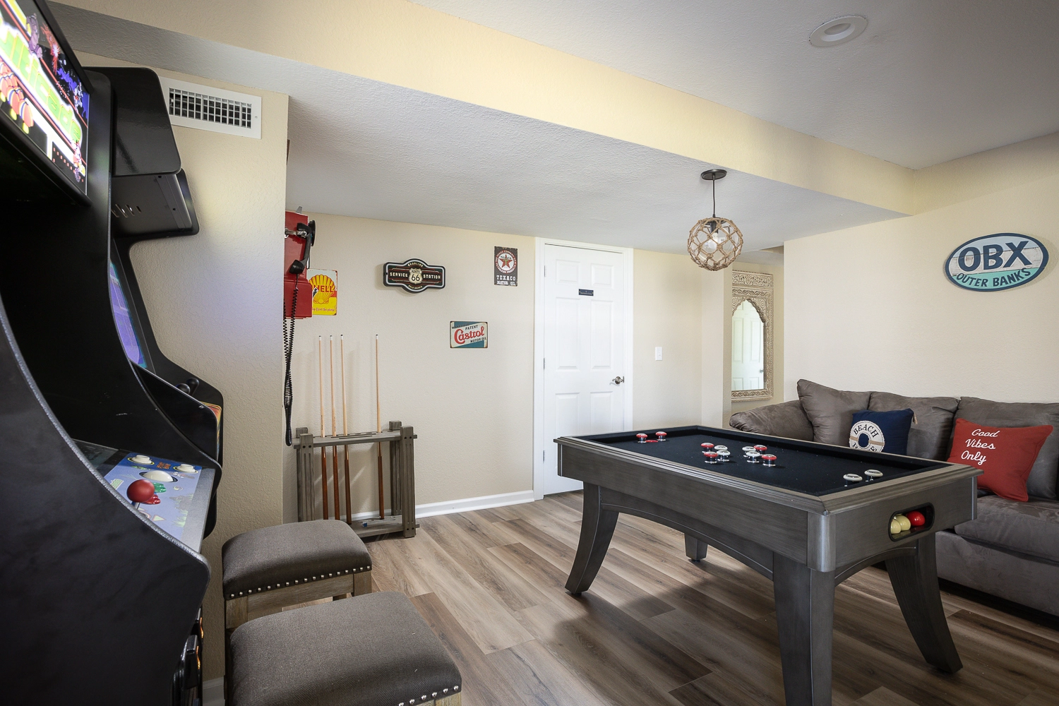 Rec room with bumper pool table, foosball, and sitting area.