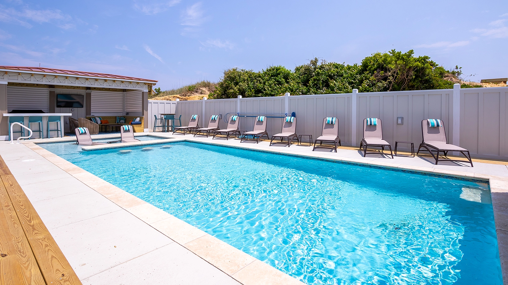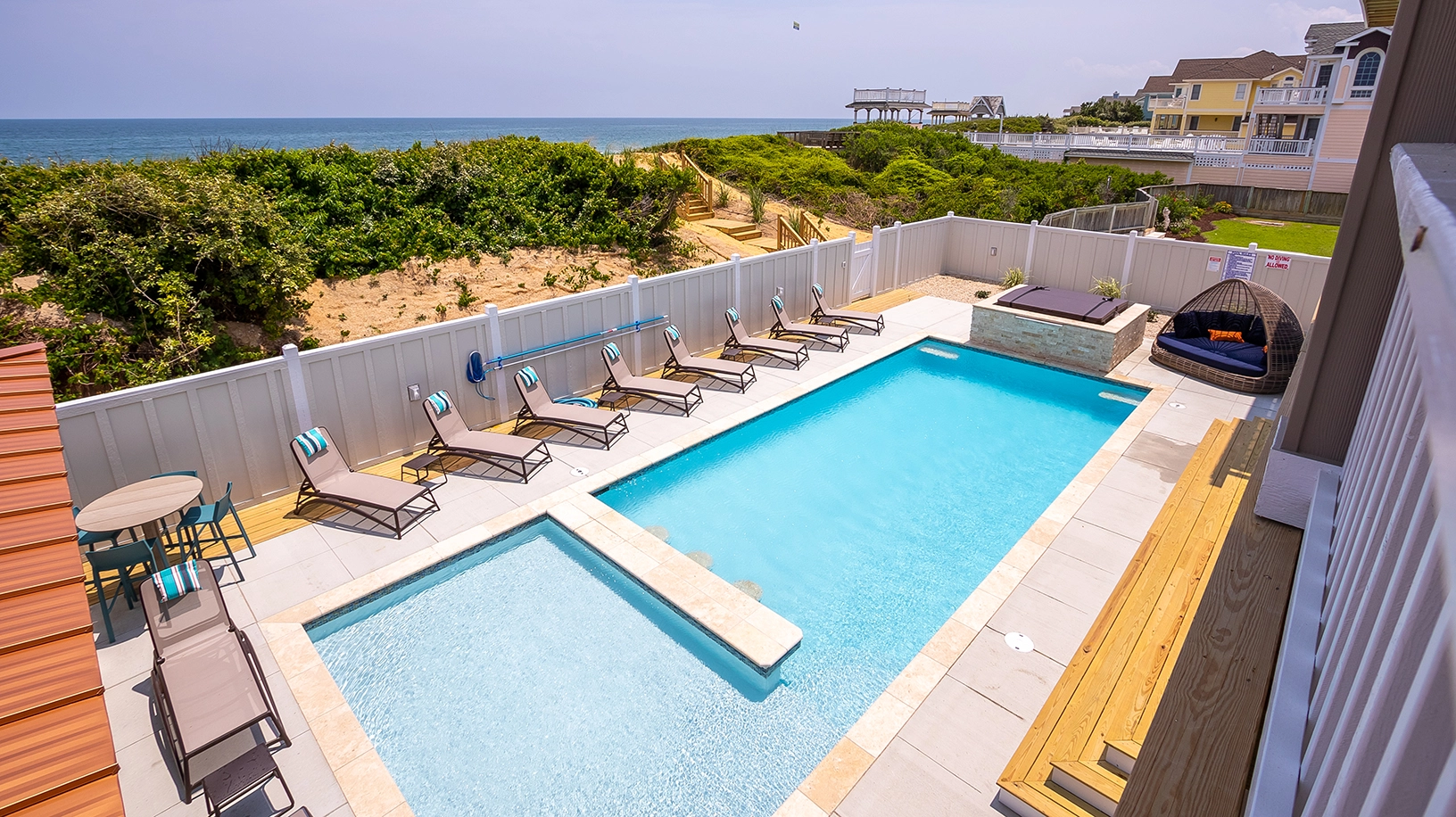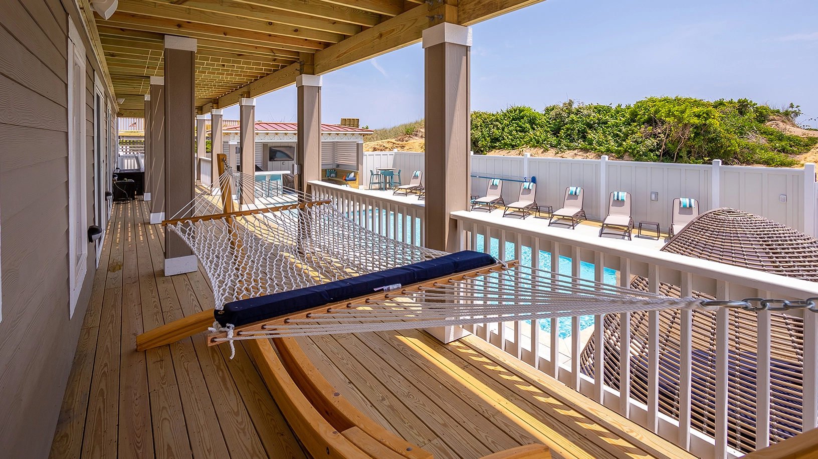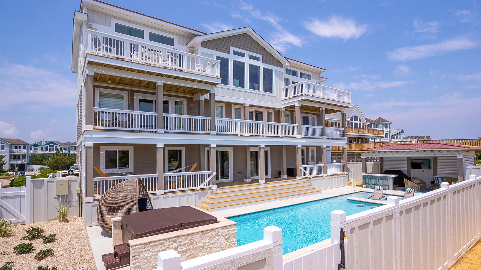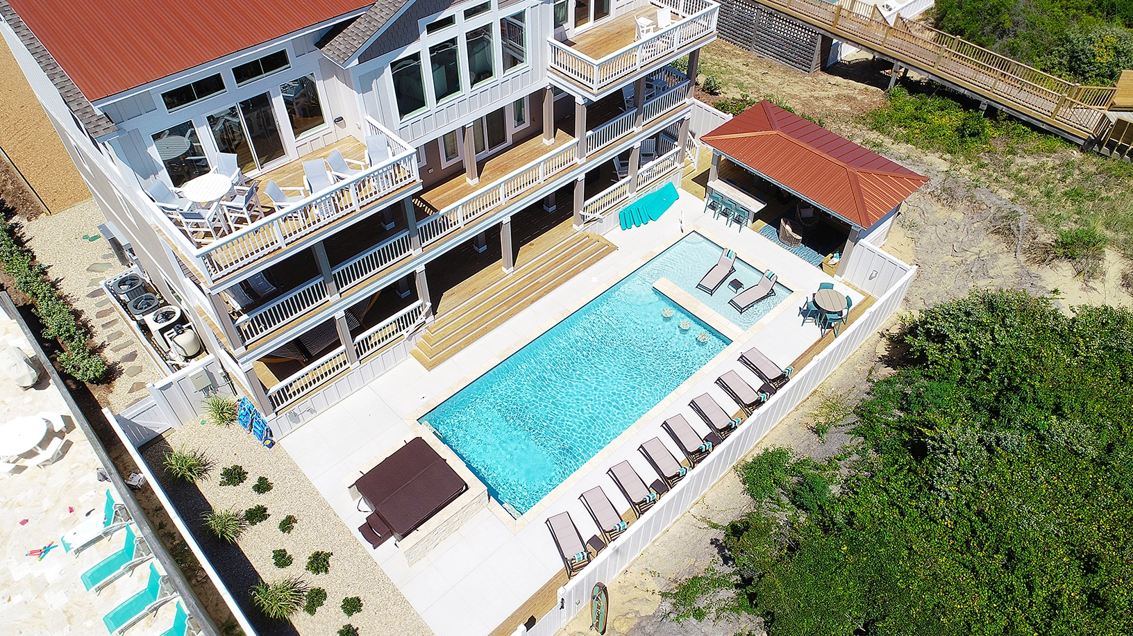 Private pool with poolside cabana, pool table, shuffleboard, guest house is connected by a covered exterior deck, 2026 beach cabana service provided from May 25 - September 12 only (provides morning set-up and afternoon take-down of two umbrellas and six beach chairs on the beach).