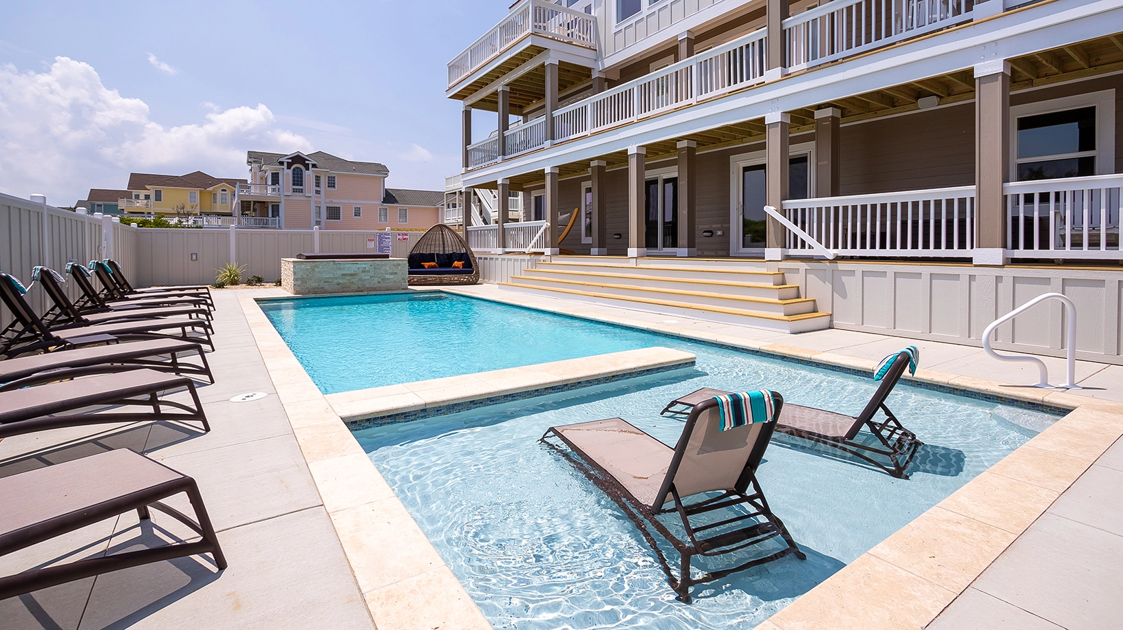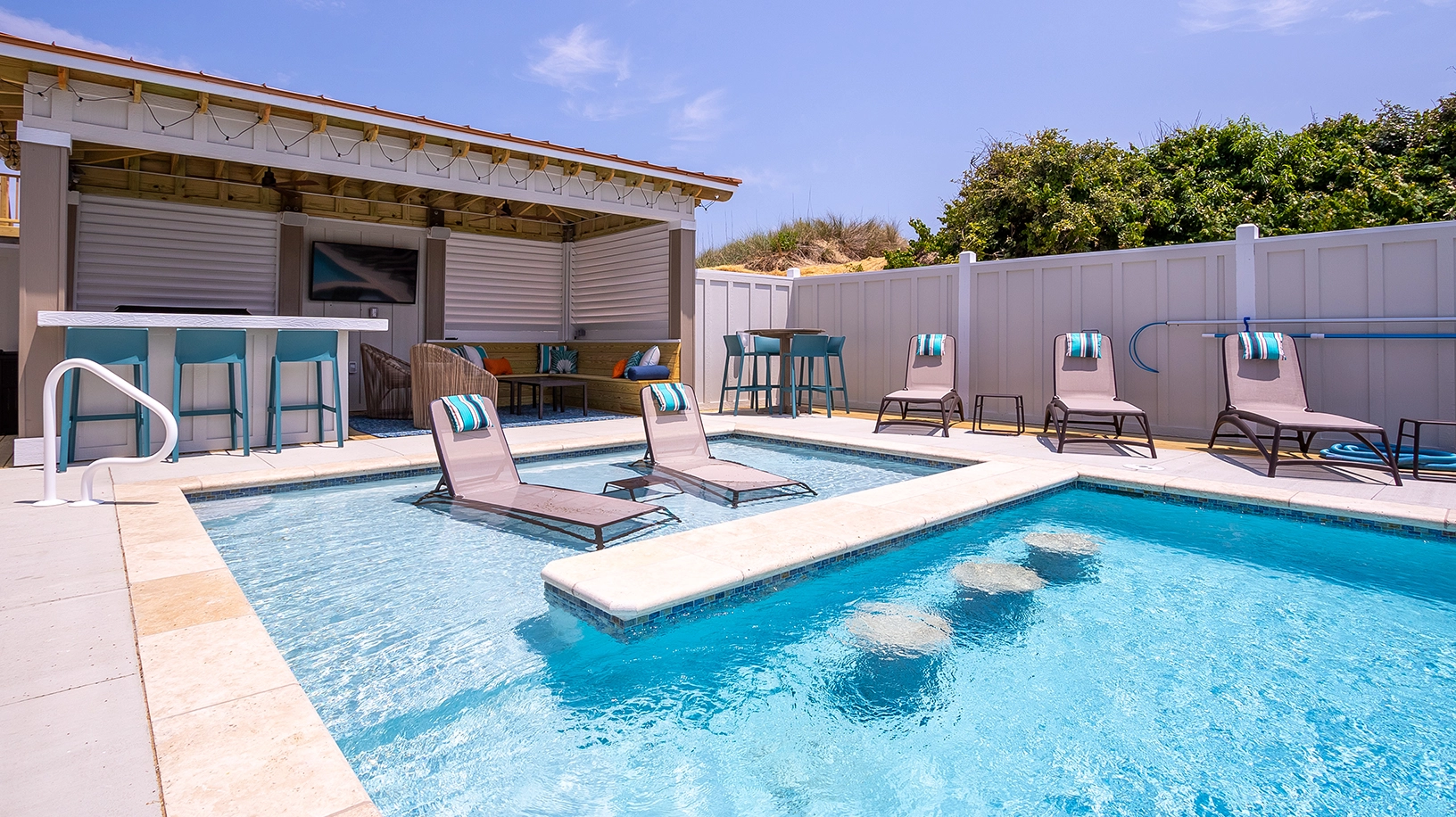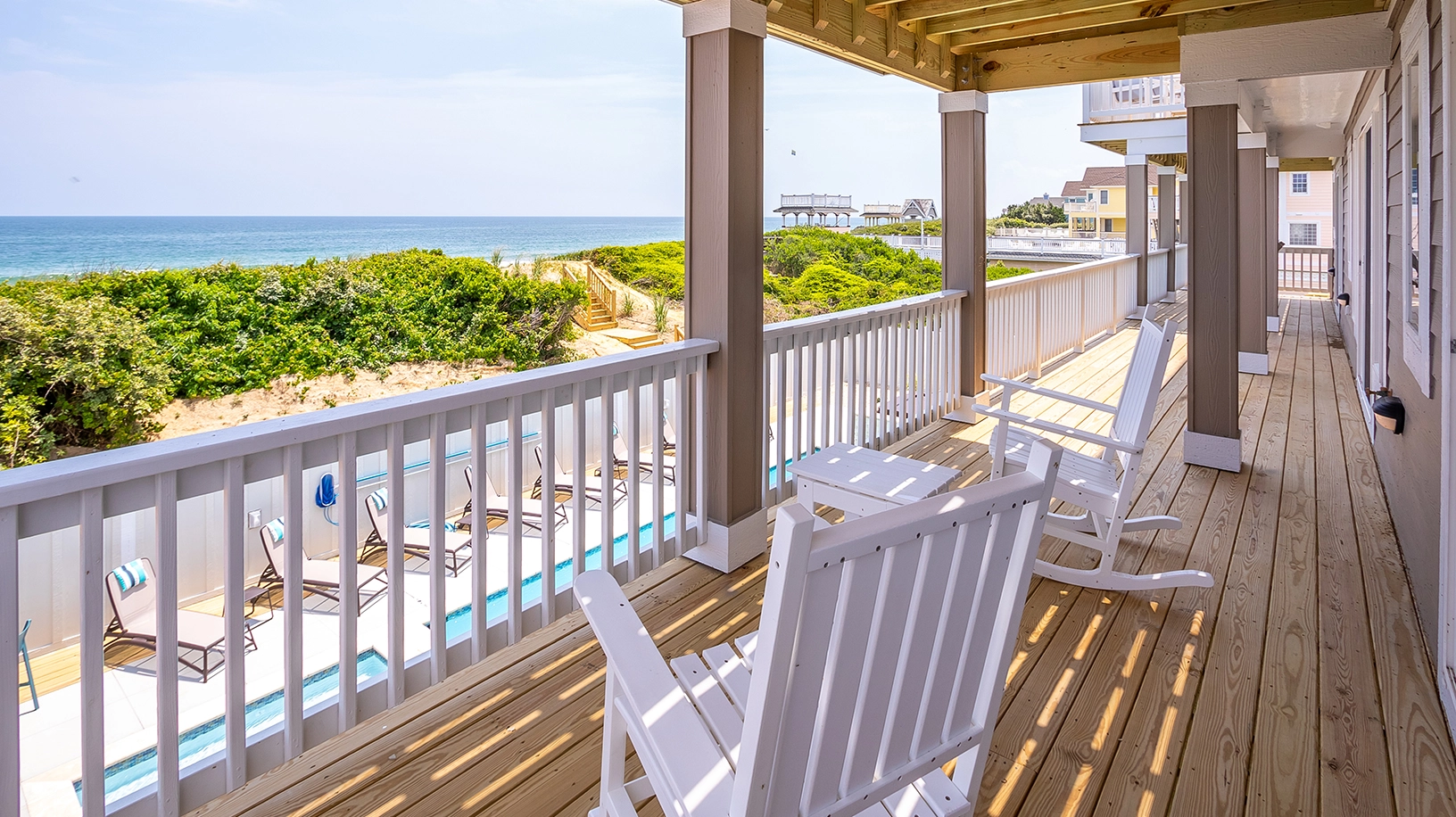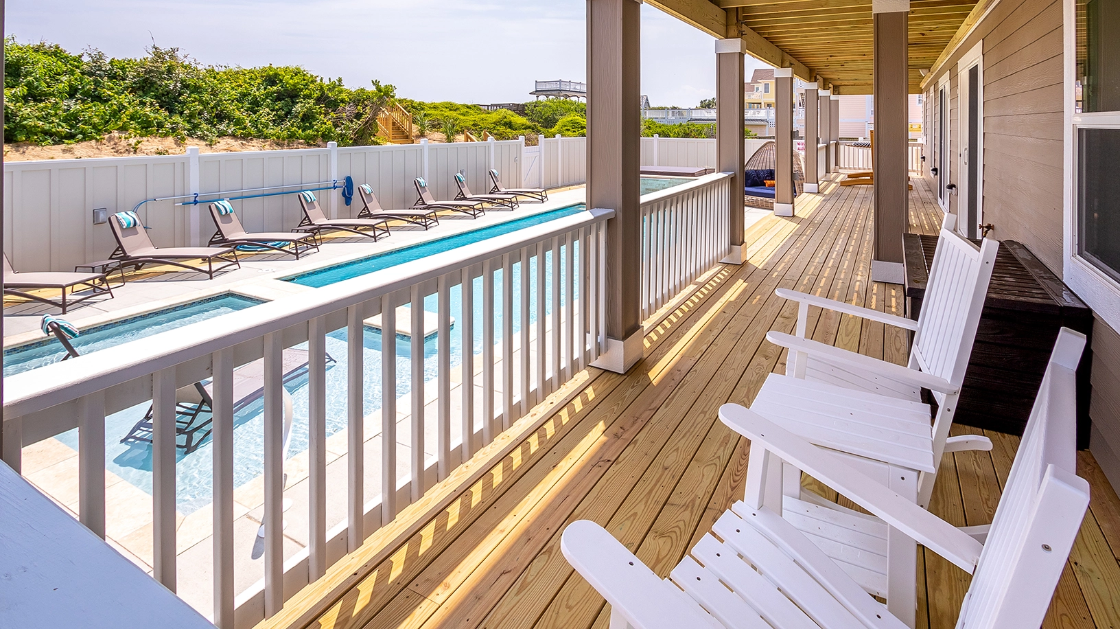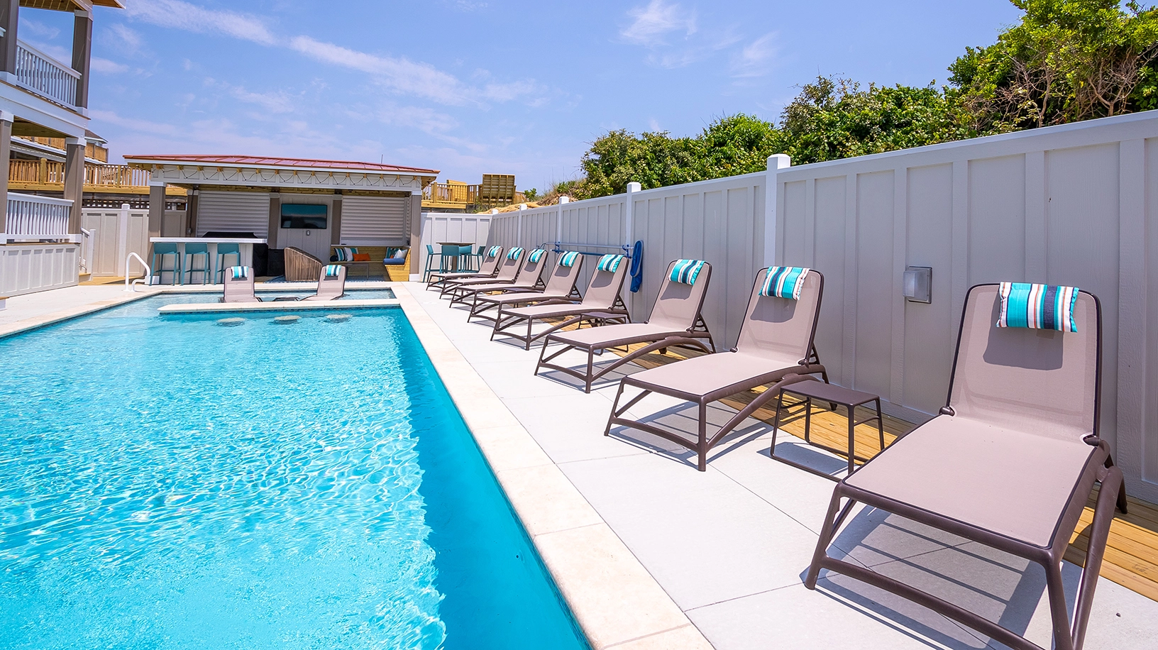 Private pool with poolside cabana, pool table, shuffleboard, guest house is connected by a covered exterior deck, 2026 beach cabana service provided from May 25 - September 12 only (provides morning set-up and afternoon take-down of two umbrellas and six beach chairs on the beach).