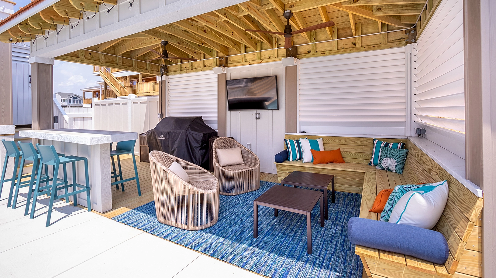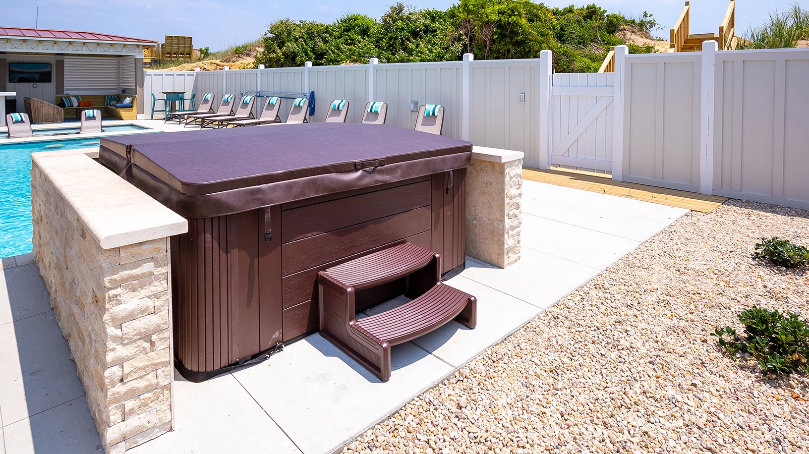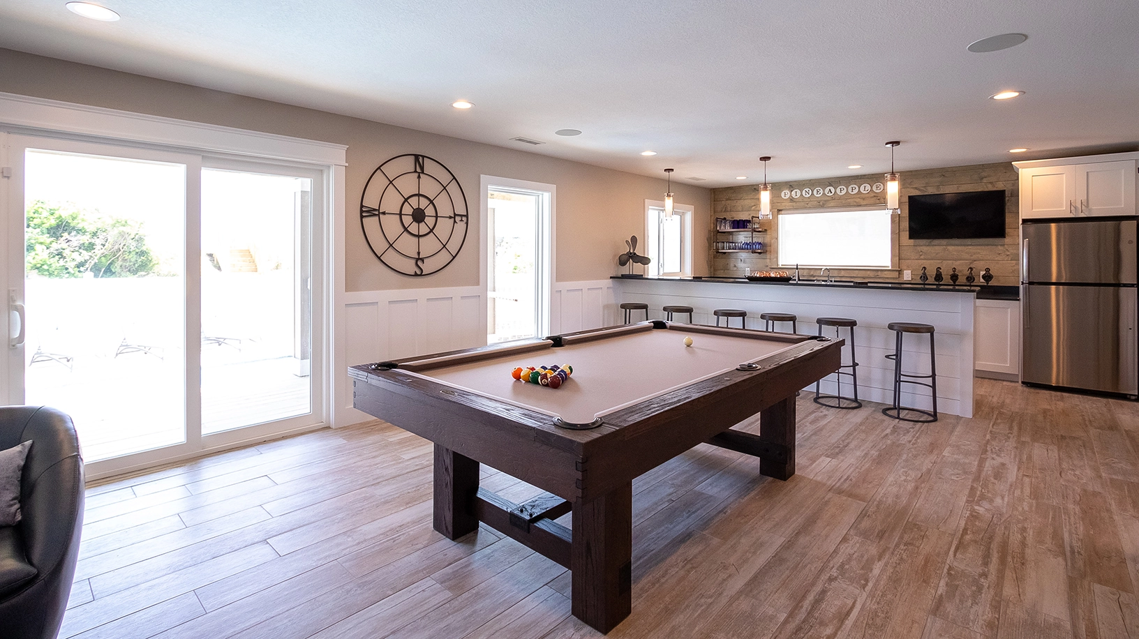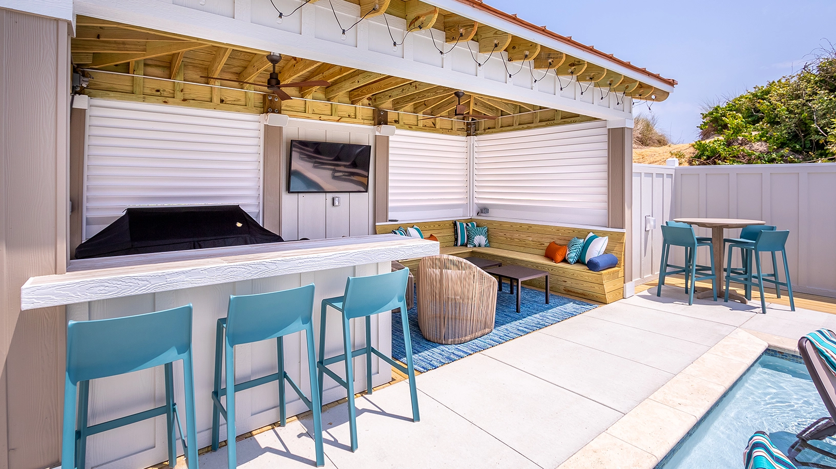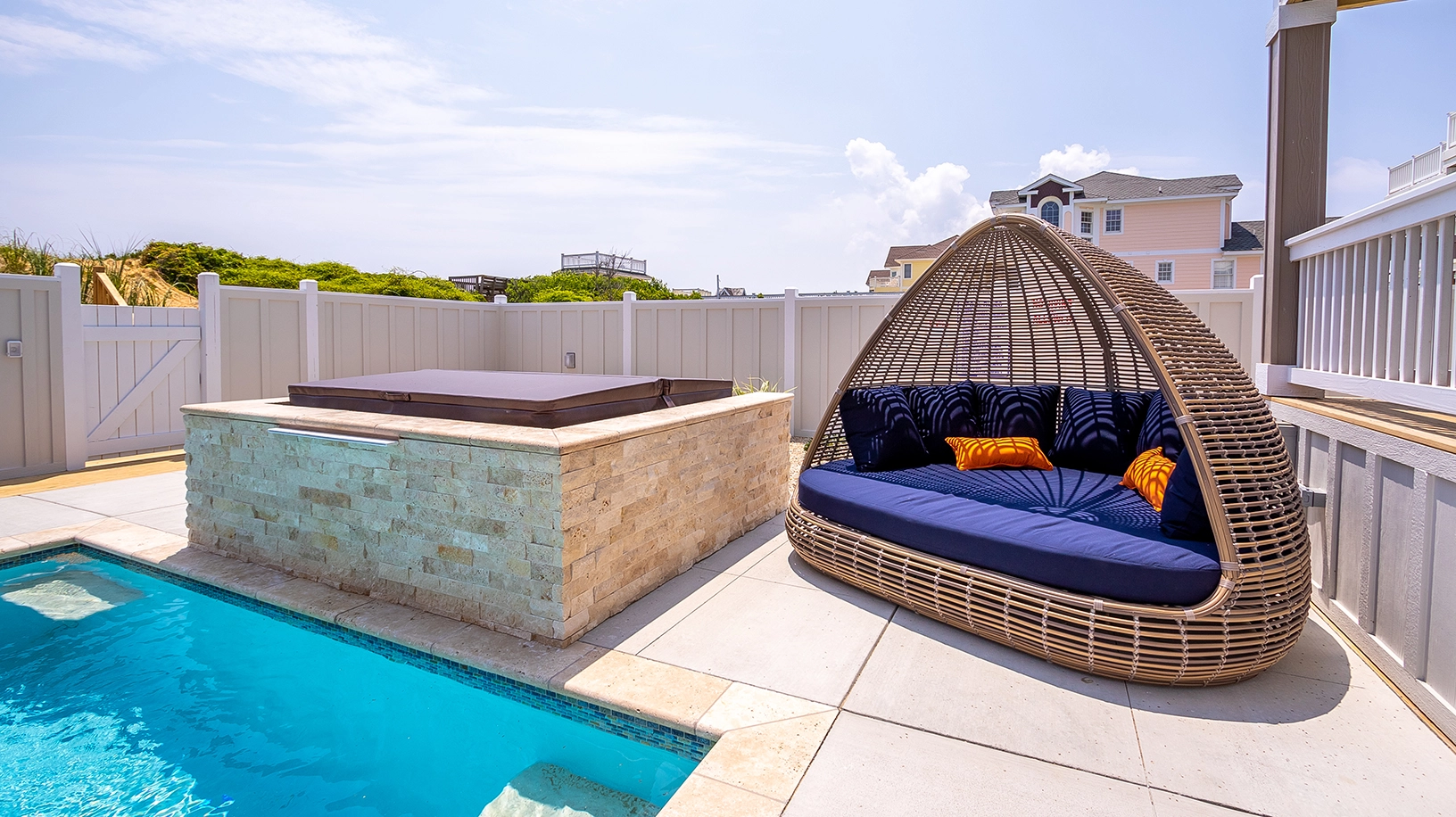 Private pool with poolside cabana, pool table, shuffleboard, guest house is connected by a covered exterior deck, 2026 beach cabana service provided from May 25 - September 12 only (provides morning set-up and afternoon take-down of two umbrellas and six beach chairs on the beach).