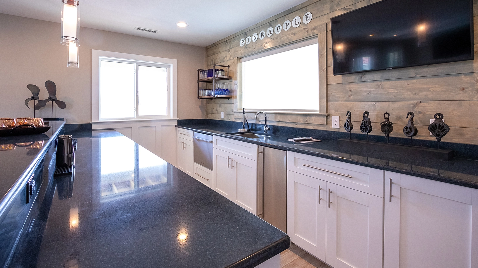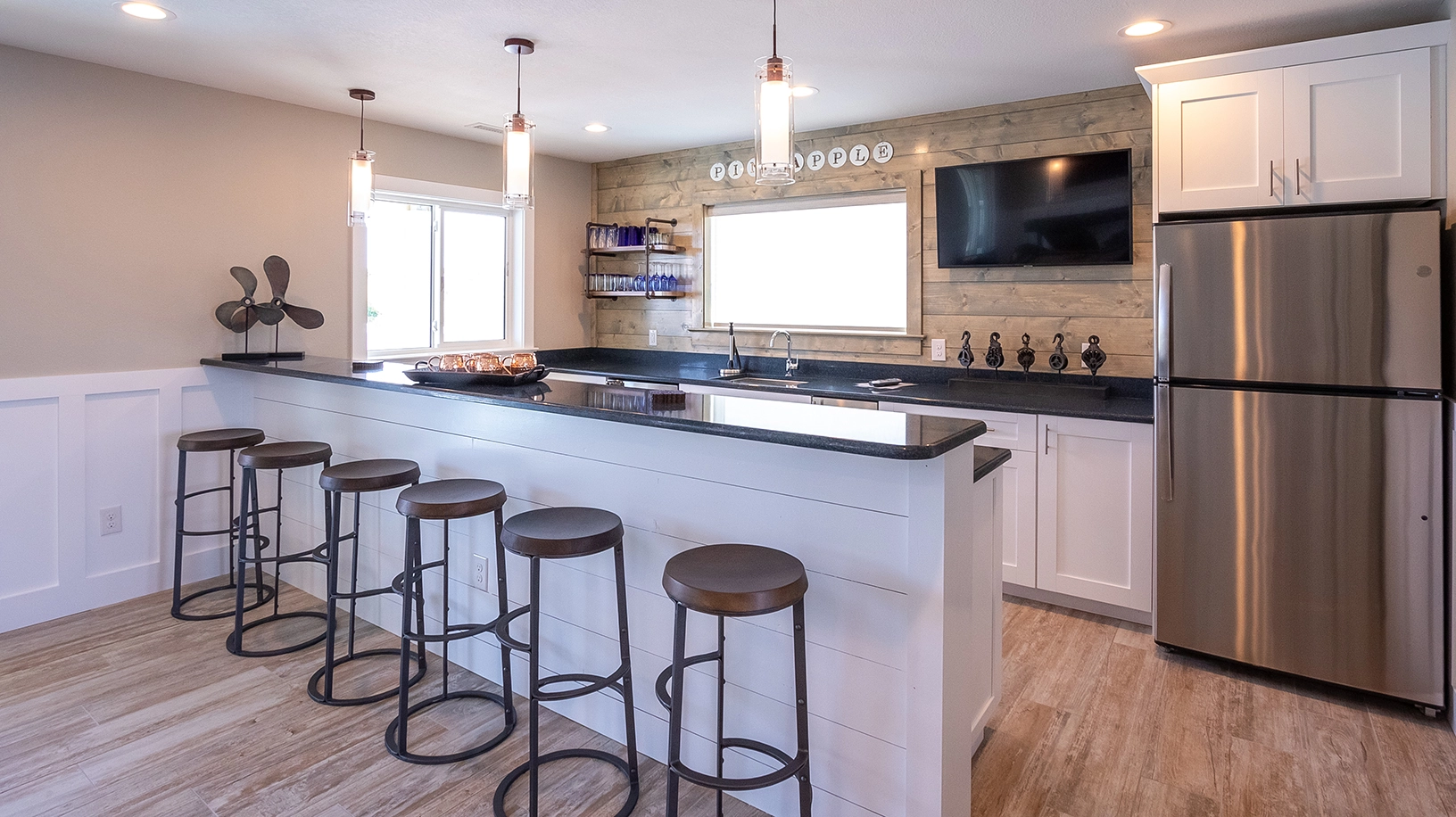 Sitting area with wet bar.