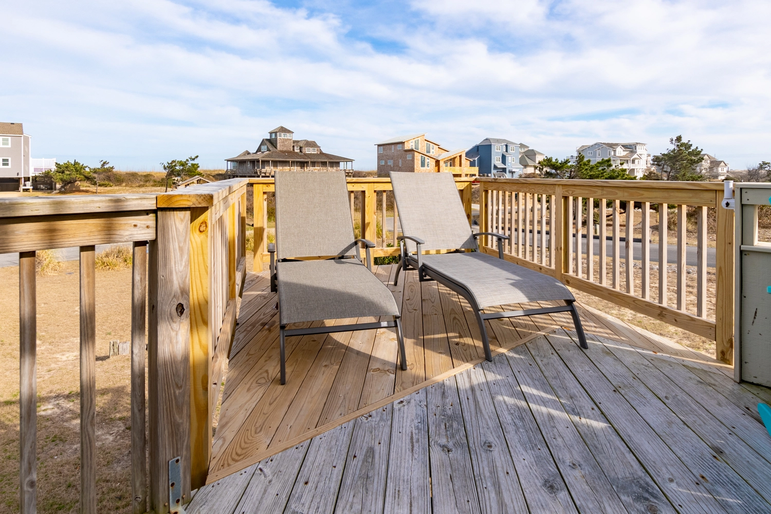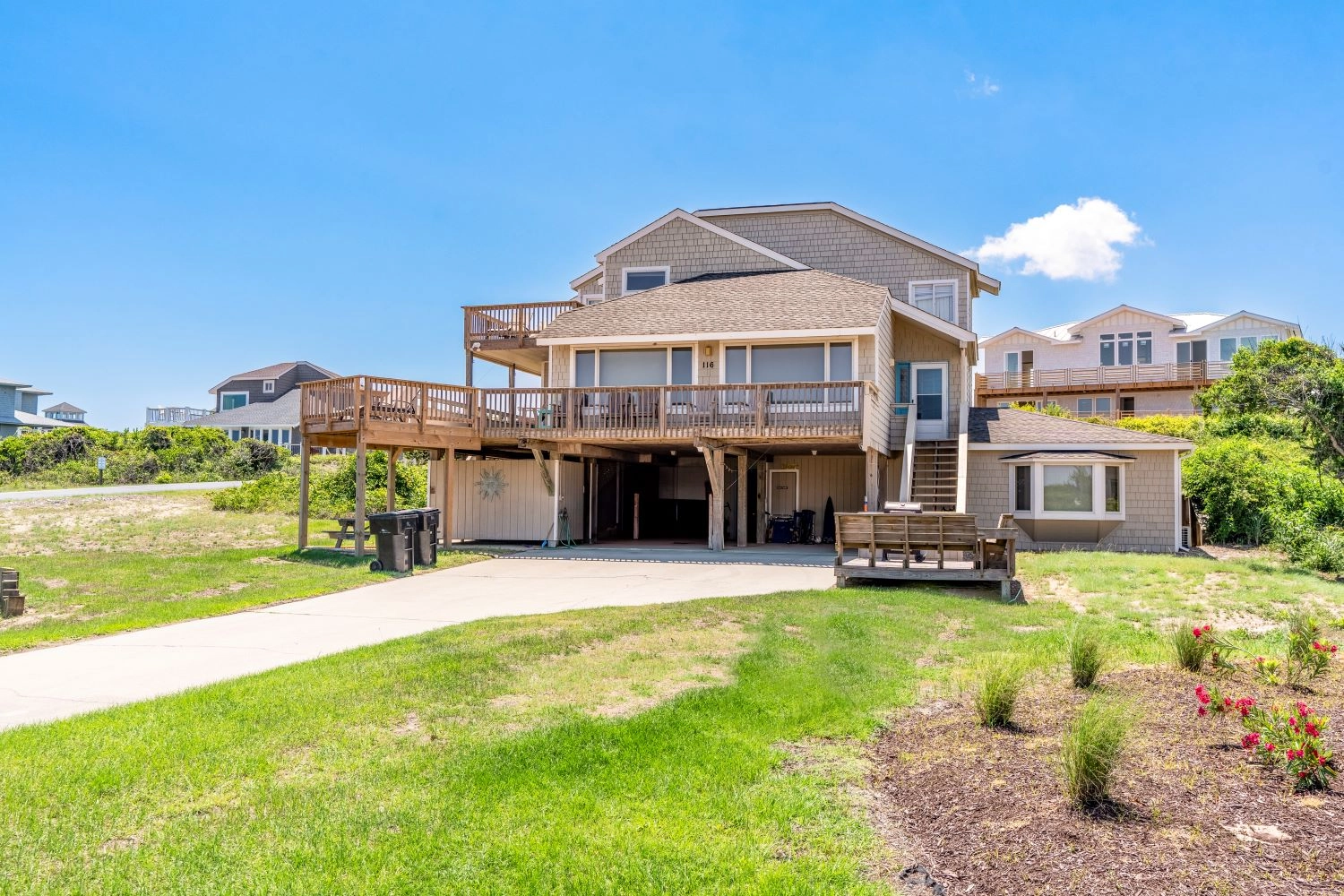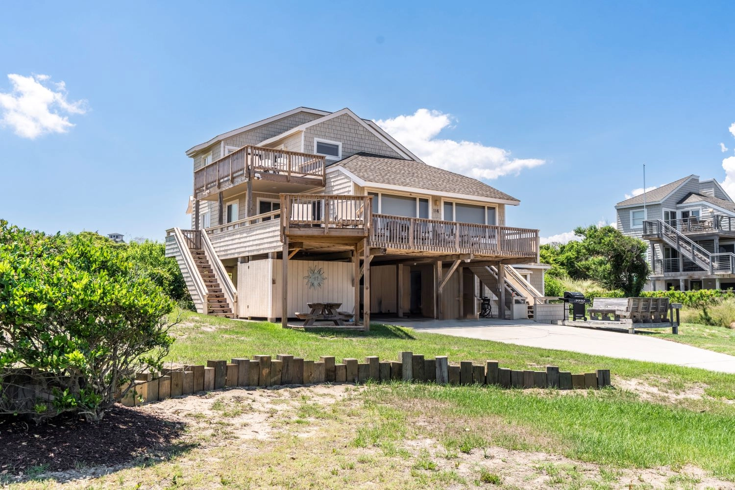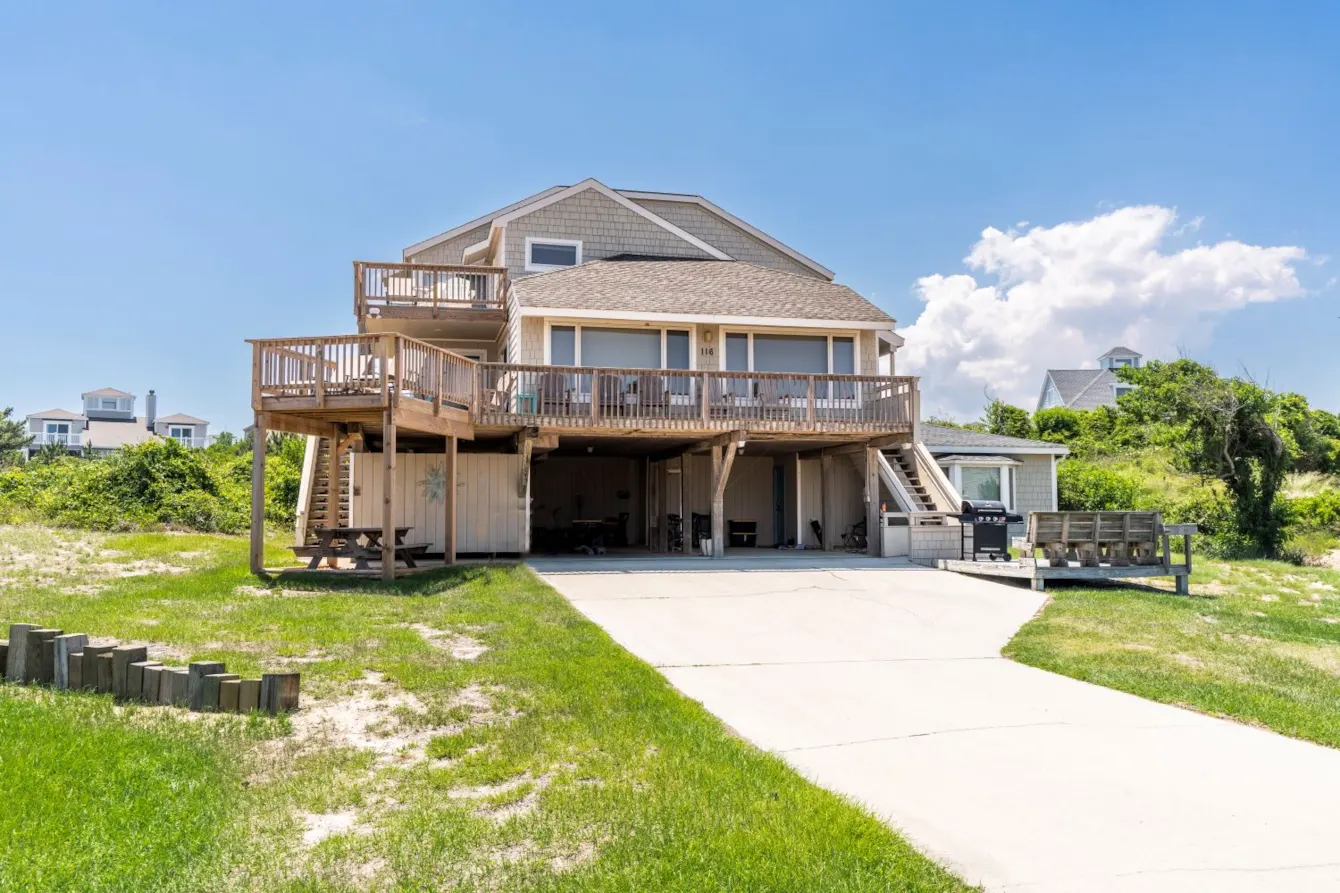 "Convenient to beach access. Views of ocean from decks. Five bedrooms. Reasonably priced. Quiet neighborhood. Convenient to town of Duck, Corolla Restaurants and shops."