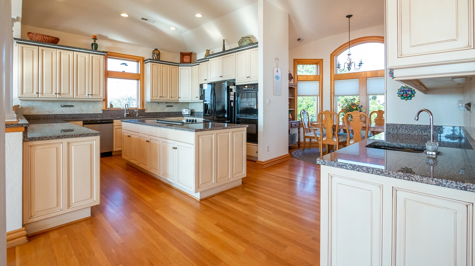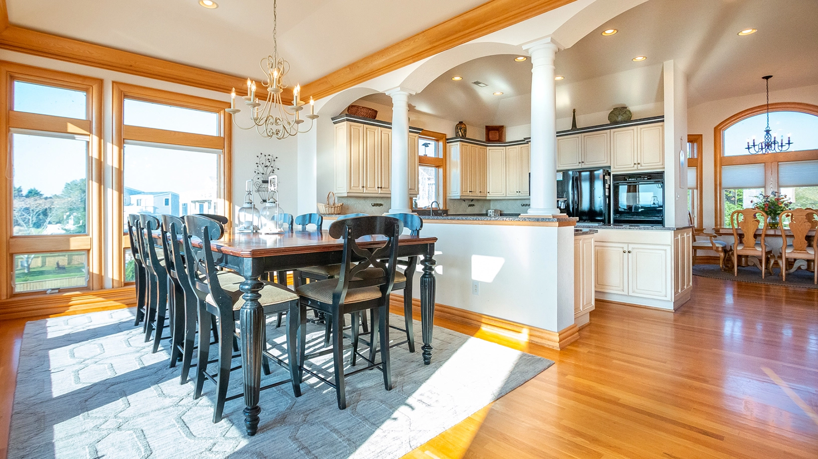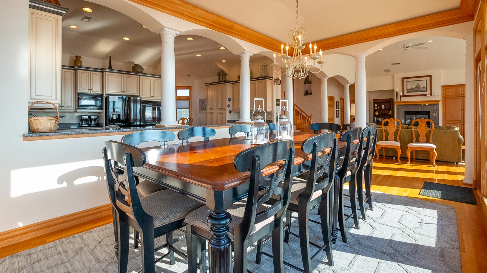 Great room with gas fireplace; kitchen with double wall ovens; dining area.
