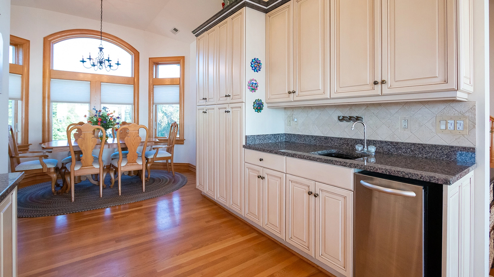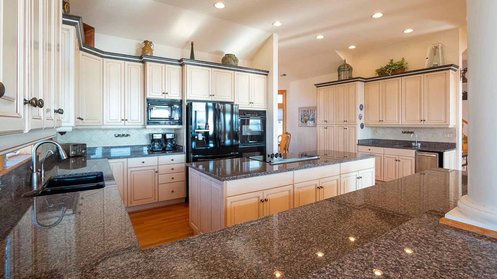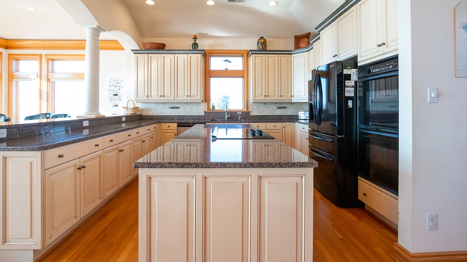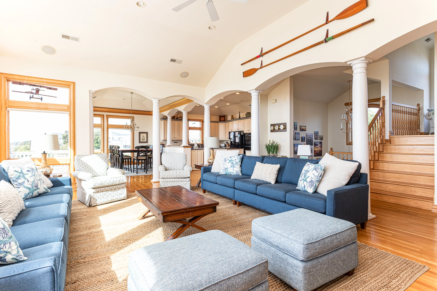 Great room with gas fireplace; kitchen with double wall ovens; dining area.