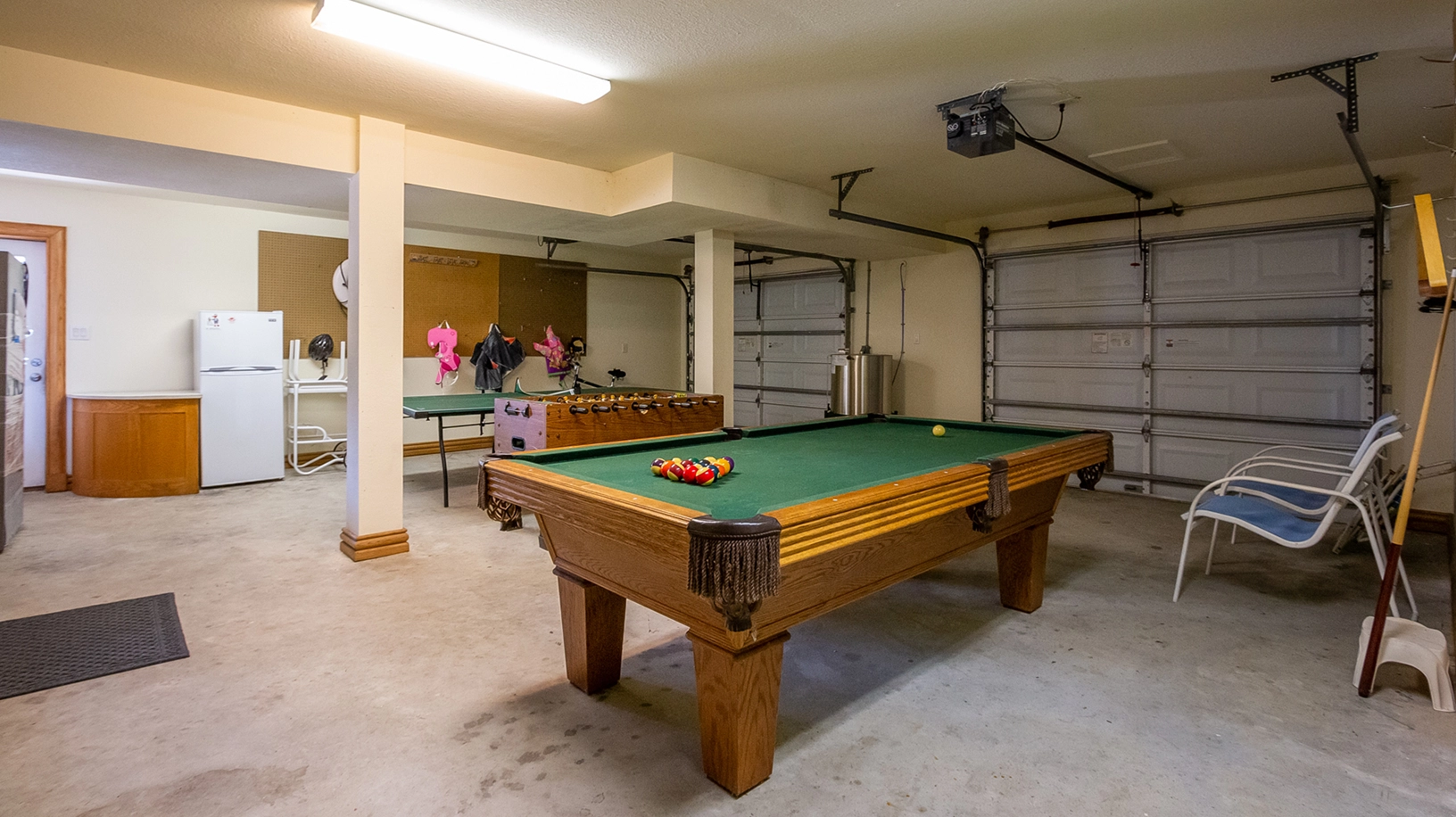Garage/game room with pool table, ping pong, and foosball.