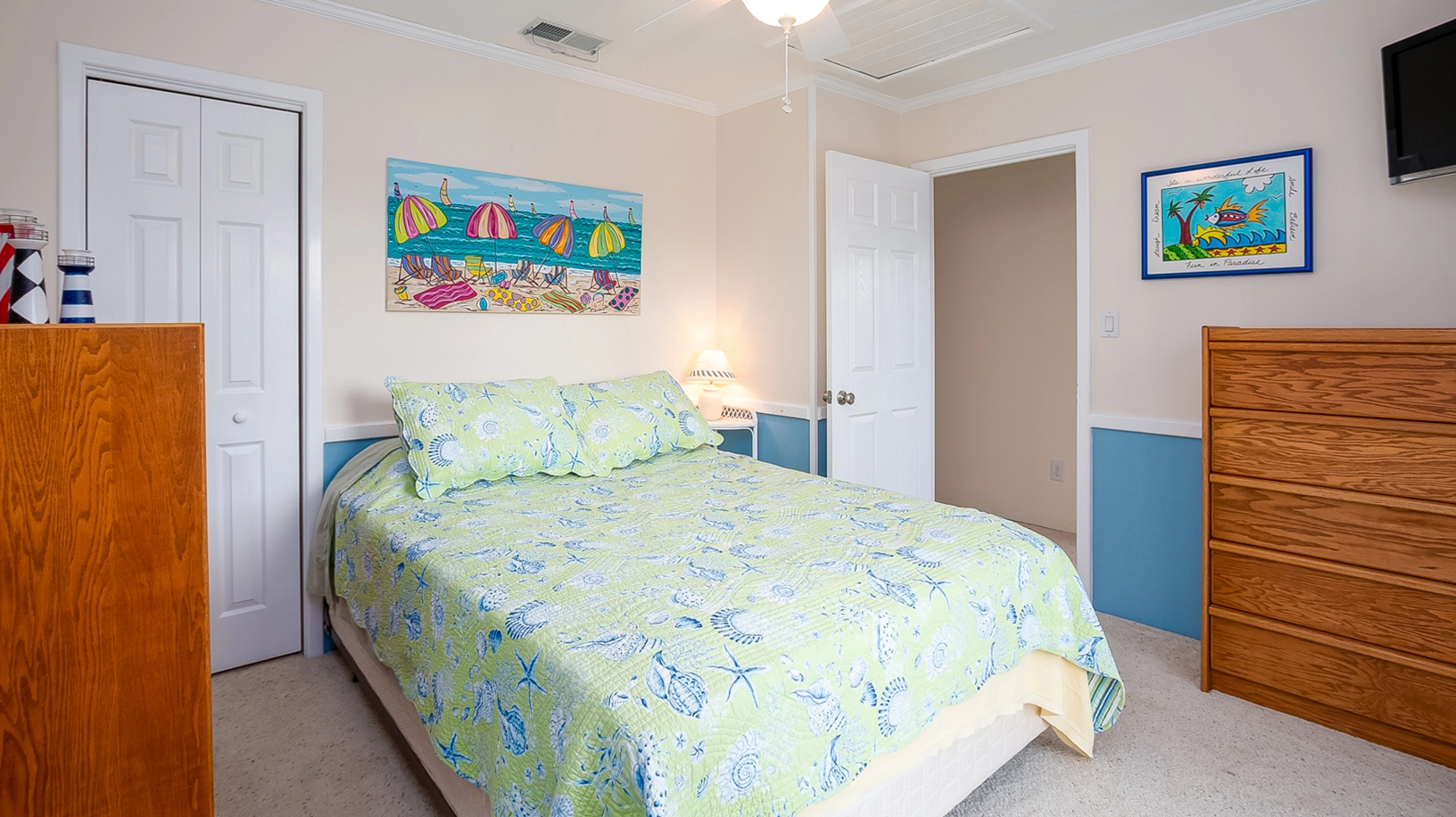 "The house is nicely outfitted with furniture and kitchen supplies. Decorated nicely for the beach. A very short walk to the beach."