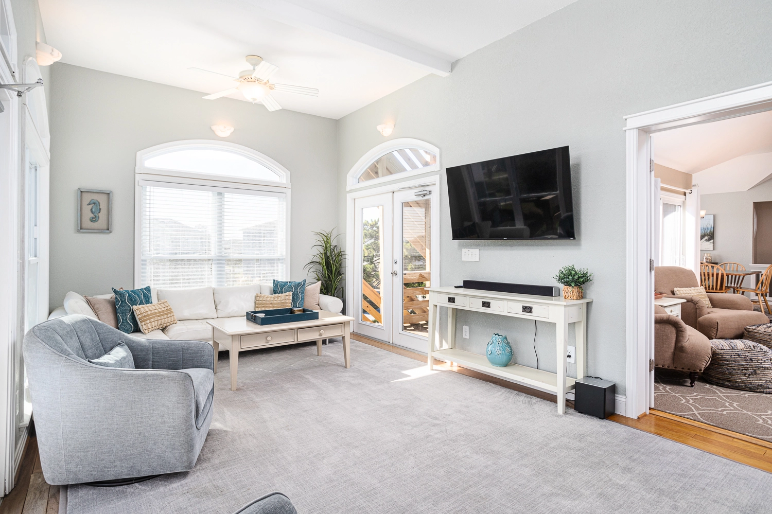 Great room; kitchen; dining area; sunroom.