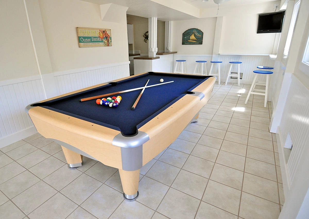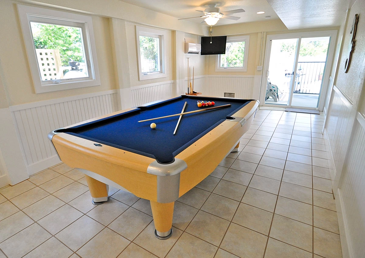 Gameroom with pool table, refrigerator, and sink.