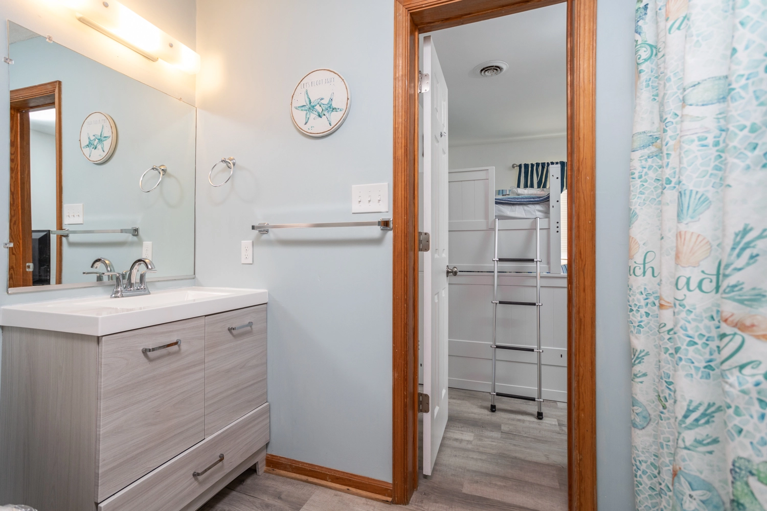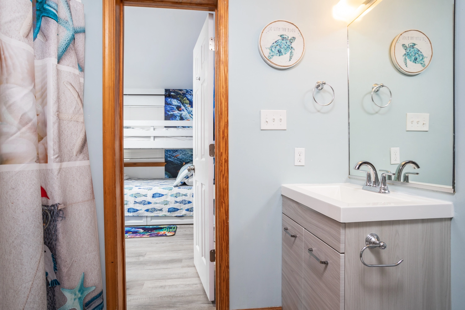 "Enjoyed the new kitchen and appliances. And the cleanliness of the home was exceptional in comparison to every other homes we've rented in the past. Actually, no home at the beach should have carpeting, especially a home that allows dogs. As I stated in my other comment to Twiddy, this home needs hooks and/or racks to hang and put things in the tiny bathrooms. The master bathroom could be renovated to use space from the master bedroom to enlarge it. It is too small to manage anything. No place to put anything."