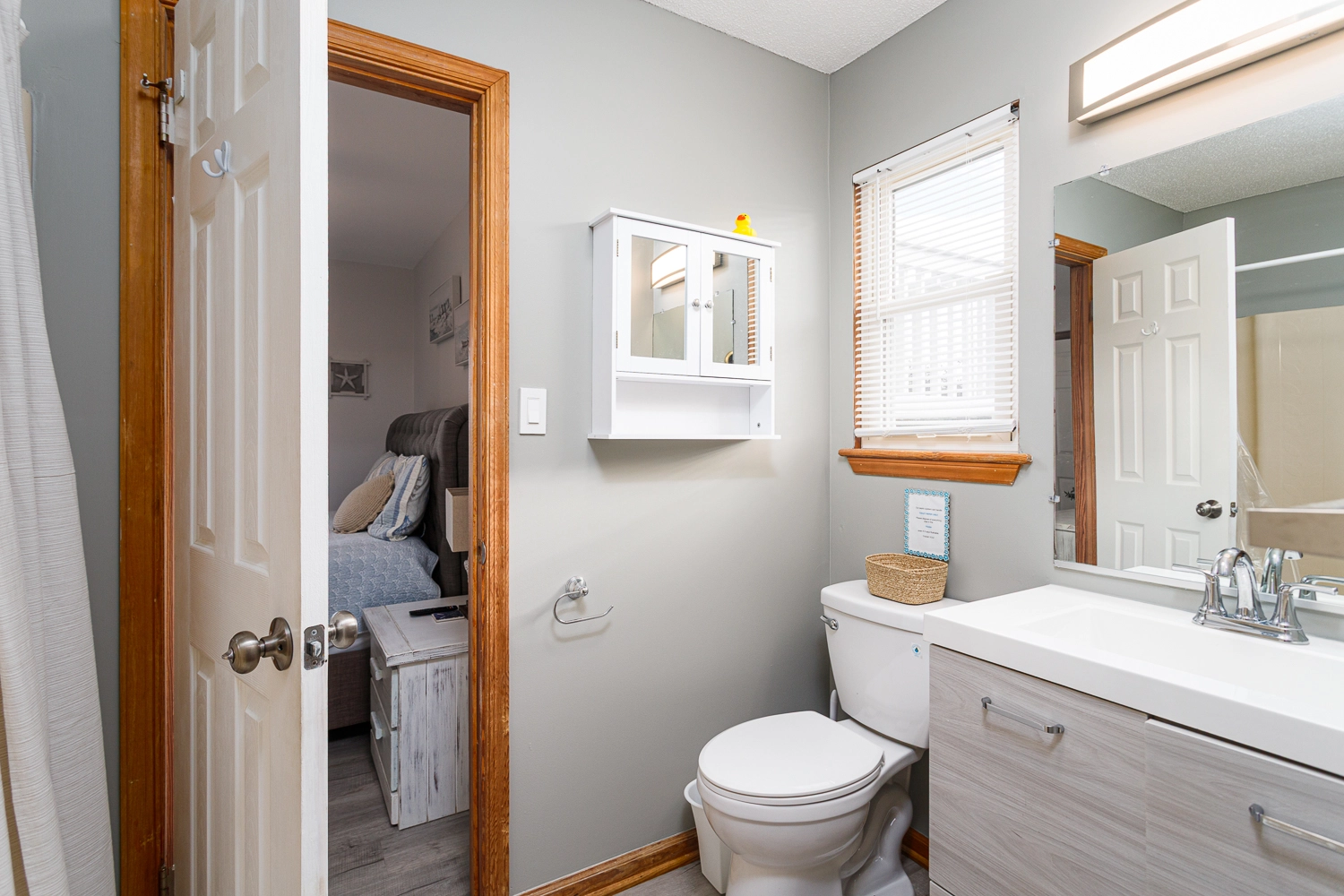 Queen, Shared bath with room 4, Shower/tub combo, Deck access