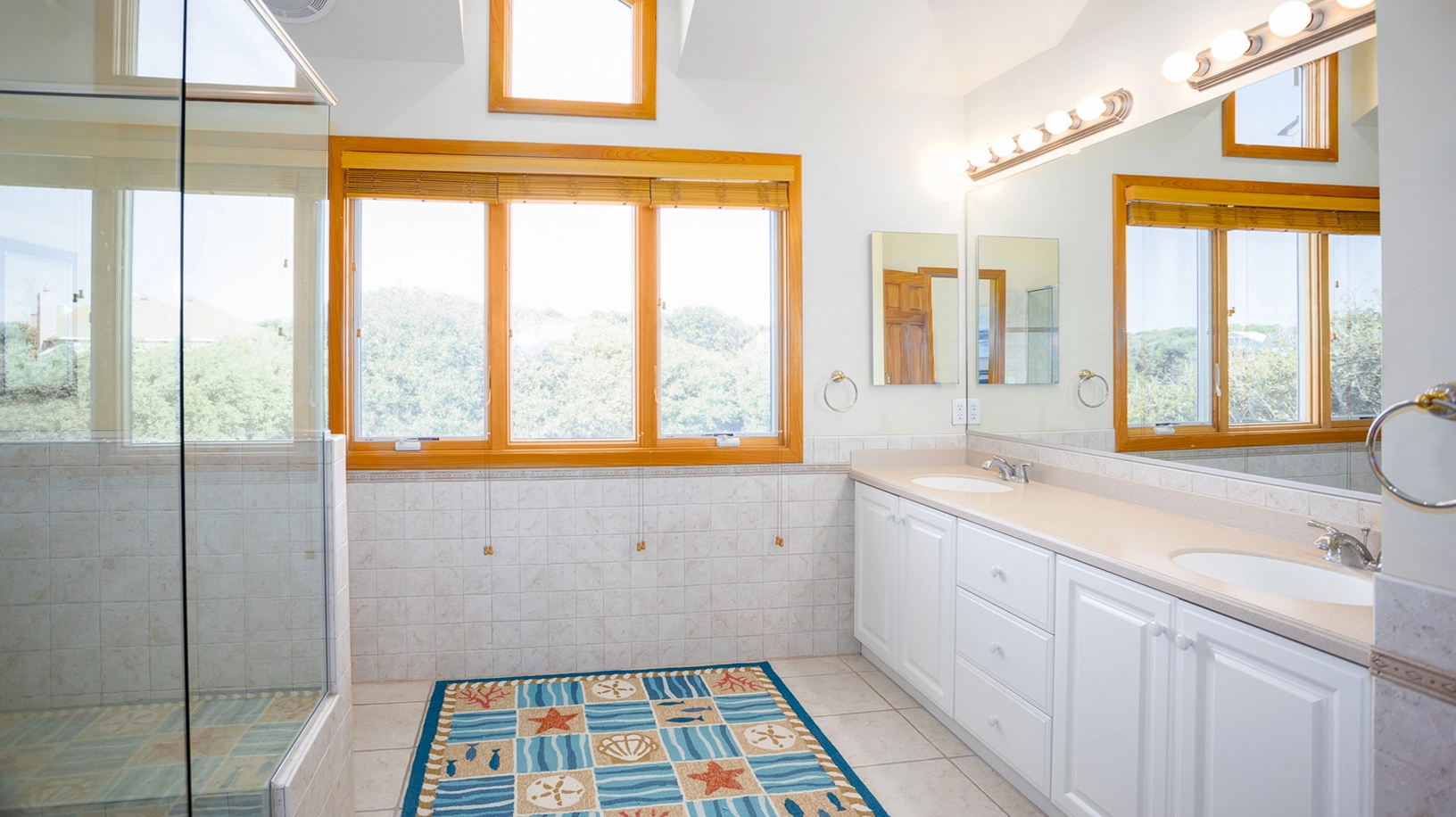 "We really enjoyed Osprey. Great location for the beach, Duck shopping and access to other towns. House was well appointed. We loved the bright and airy feeling of the house. Lots of outdoor seating. The pool and spa were perfect after hanging out at the beach all day. We used the bikes, the grill, some of the sand toys, the beach wagon and chairs… nice to have on site. I am very picky about staying in a hotel or rental. So, I would have liked to see the kitchen a little cleaner, including some of the dishes in the cabinet and cleaner carpet in the bedrooms and on the stairs. The extra room was great for late night guitar playing and the arcade golf game was a hit. In general the area felt very safe and the neighbors friendly. We got to see deer and bunnies on the property amongst the oak trees. Would definitely recommend and stay here again. Twiddy gets 5 stars for their attention to our questions and quick responses. We spent so much time at the beach and pool, we did not get to explore as much as we planned."