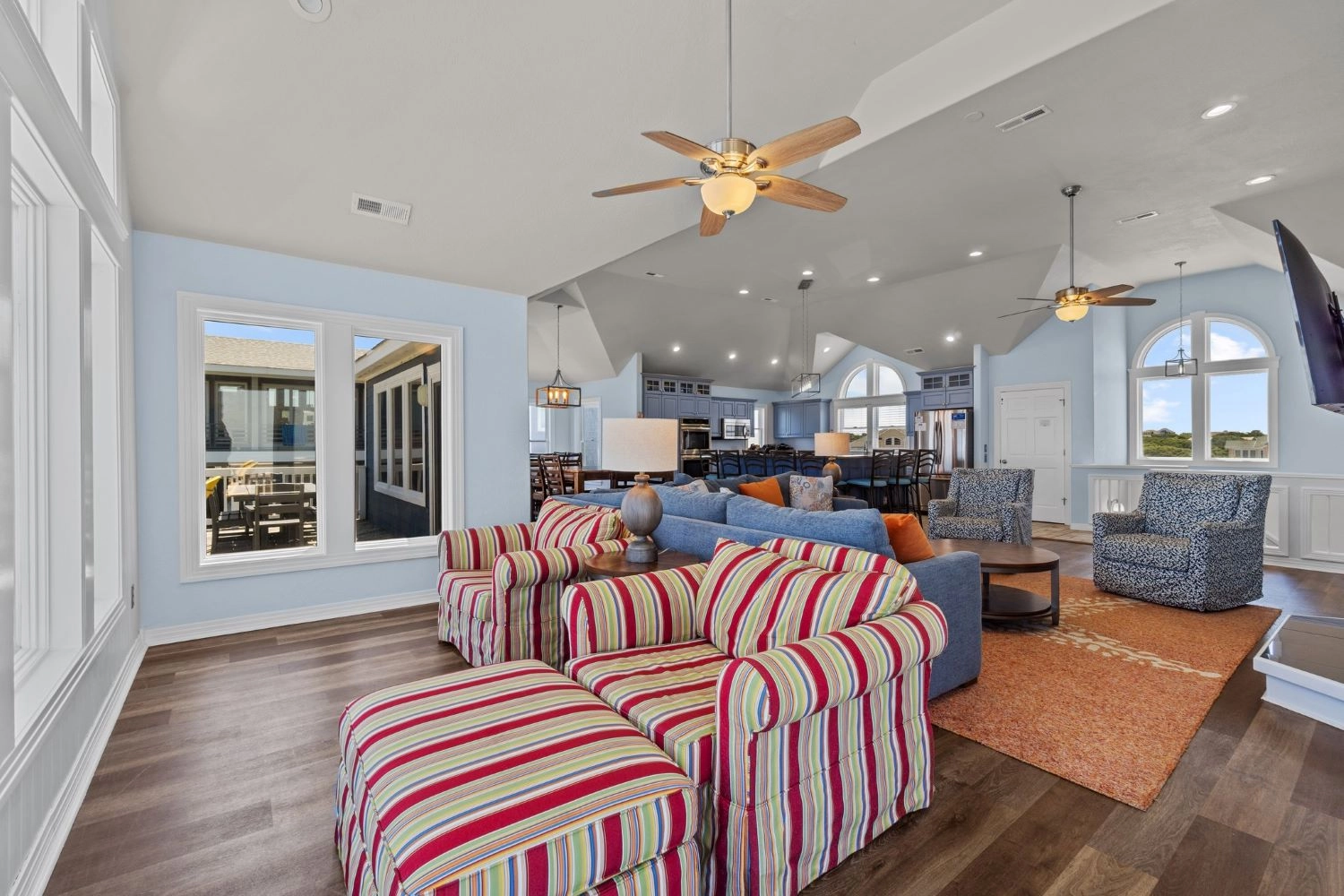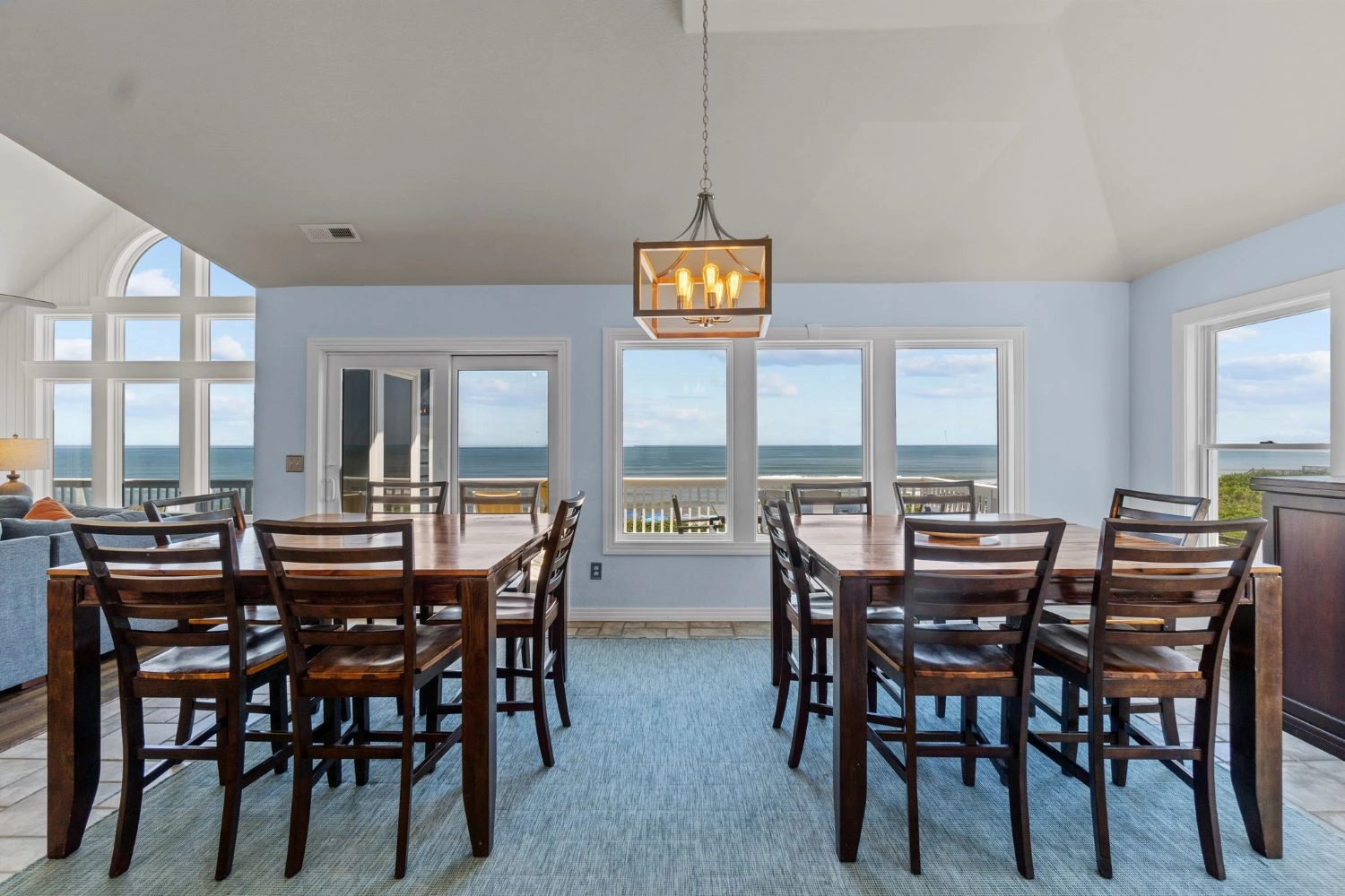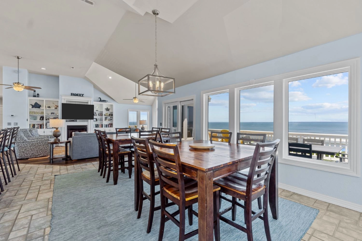 "There was plenty of space for our large family! We loved the open layout of the kitchen/dining/living area. The bedrooms were also very spacious; even the ones that had multiple beds in them (which was perfect for the many little ones we had in our group). There were multiple tv/living areas which gave everyone in our group plenty of space to spread out when they wanted to. The kitchen was well stocked for all of our cooking needs (my only suggestion would be adding more long handled cooking utensils). We loved the home's location and proximity to Duck. We rented bikes and enjoyed biking there daily for the park, boardwalk and shops. And that oceanfront view can't be beat! This is our 2nd year in this neighborhood, and we love this stretch of beach. Seas and Quackers was a perfect fit for our adults/teen/big kids/toddlers/infant group."