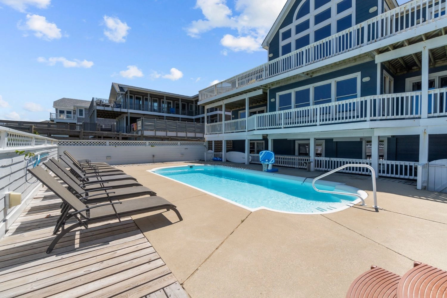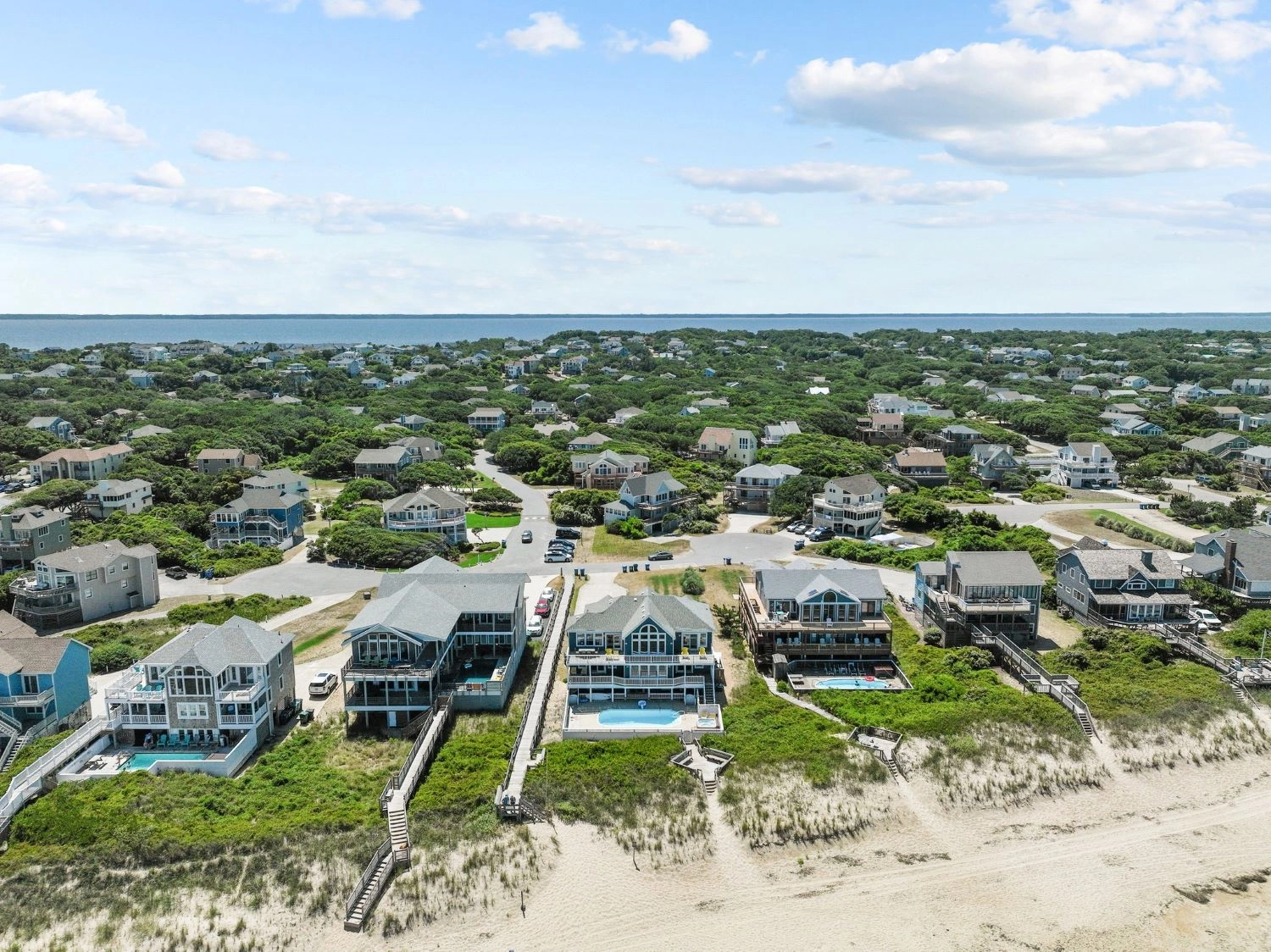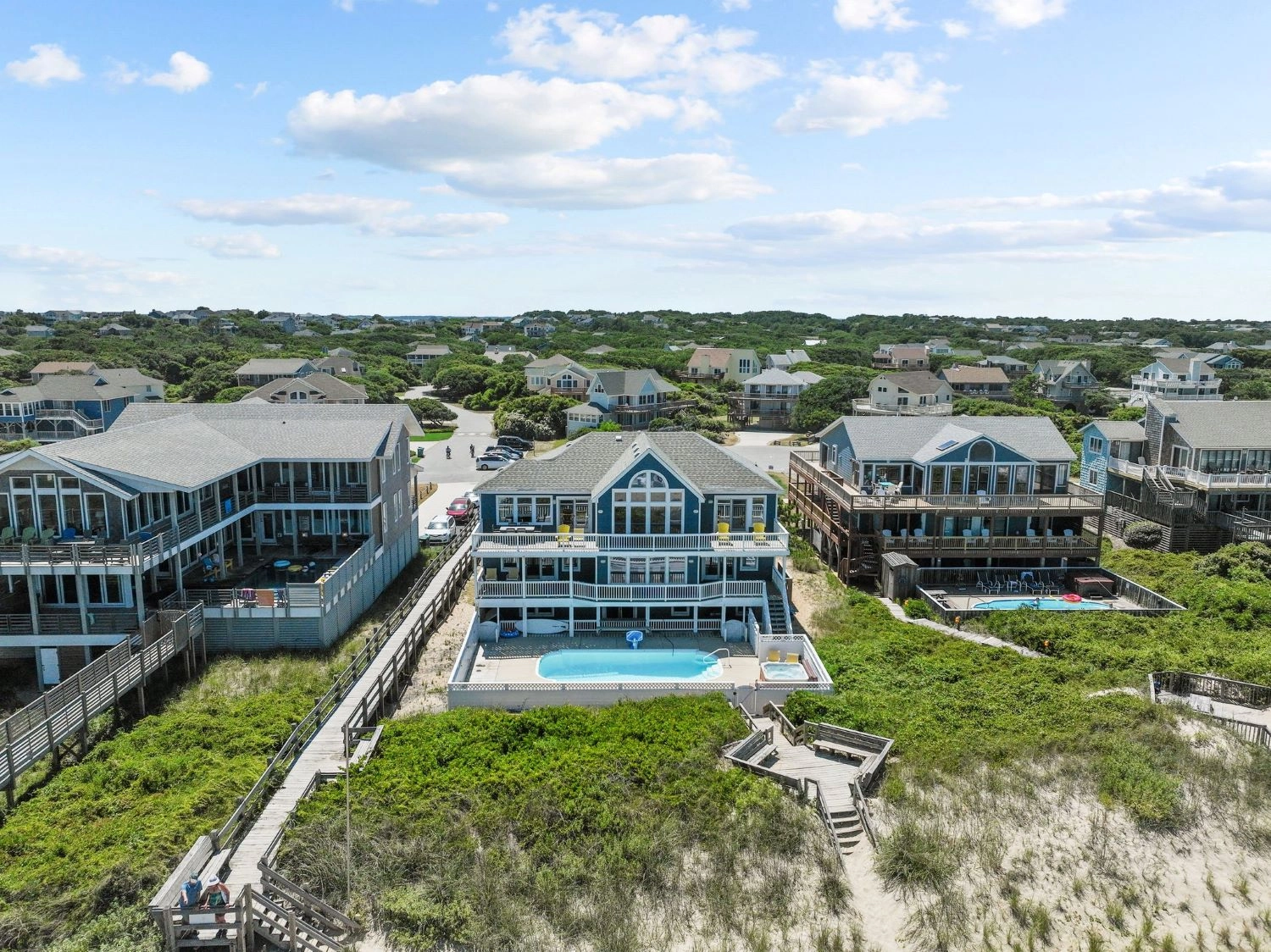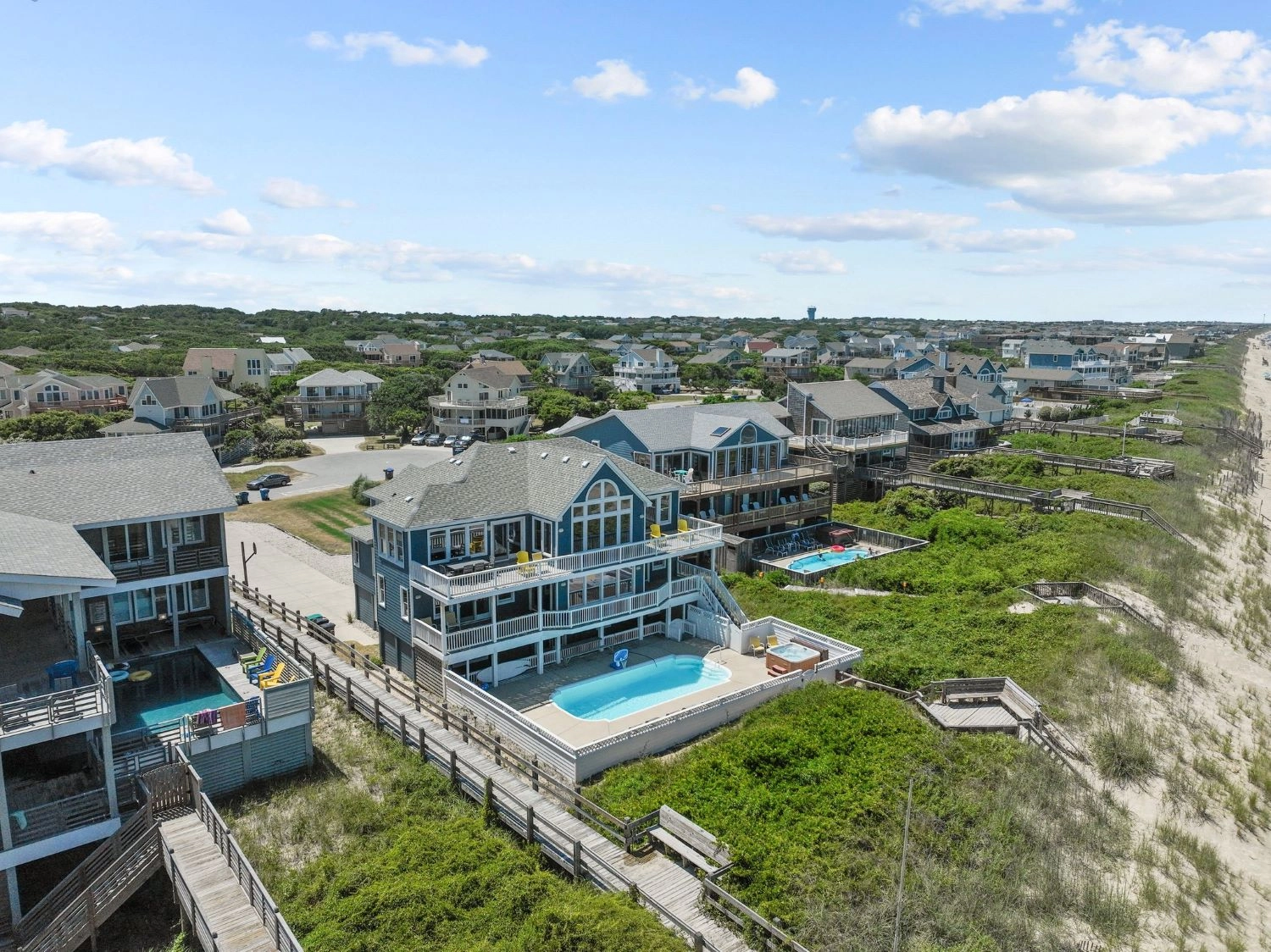 "Large home right on the beach and close to Duck shops and restaurants. Well equipped kitchen. Our second stay here since it accommodates so many people and has an elevator that can assist aging family and friends. Also has a nice pool."