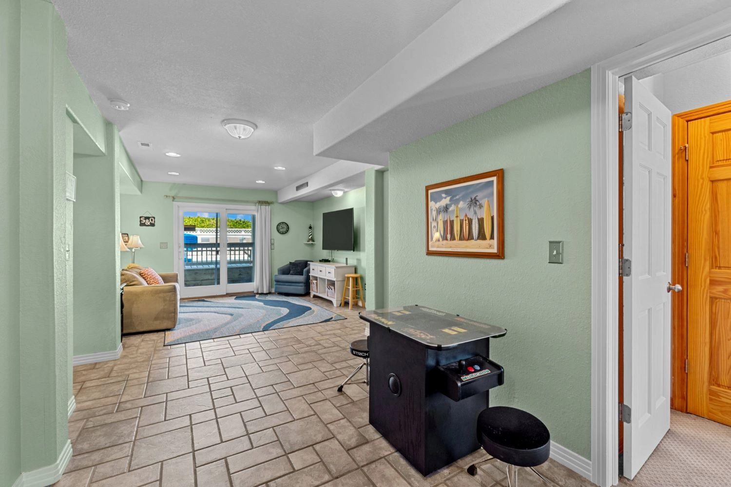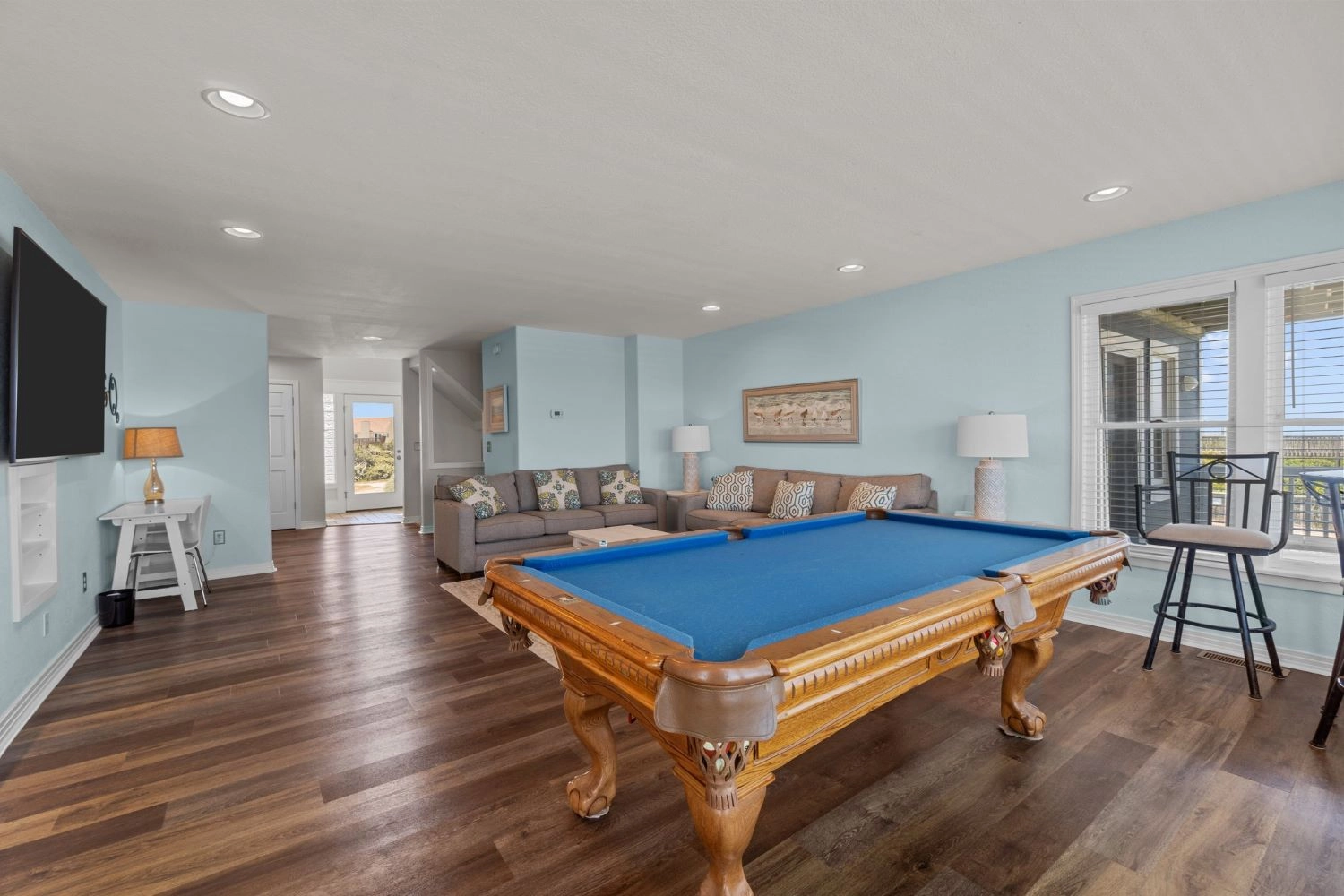 Den with pool table and wet bar.