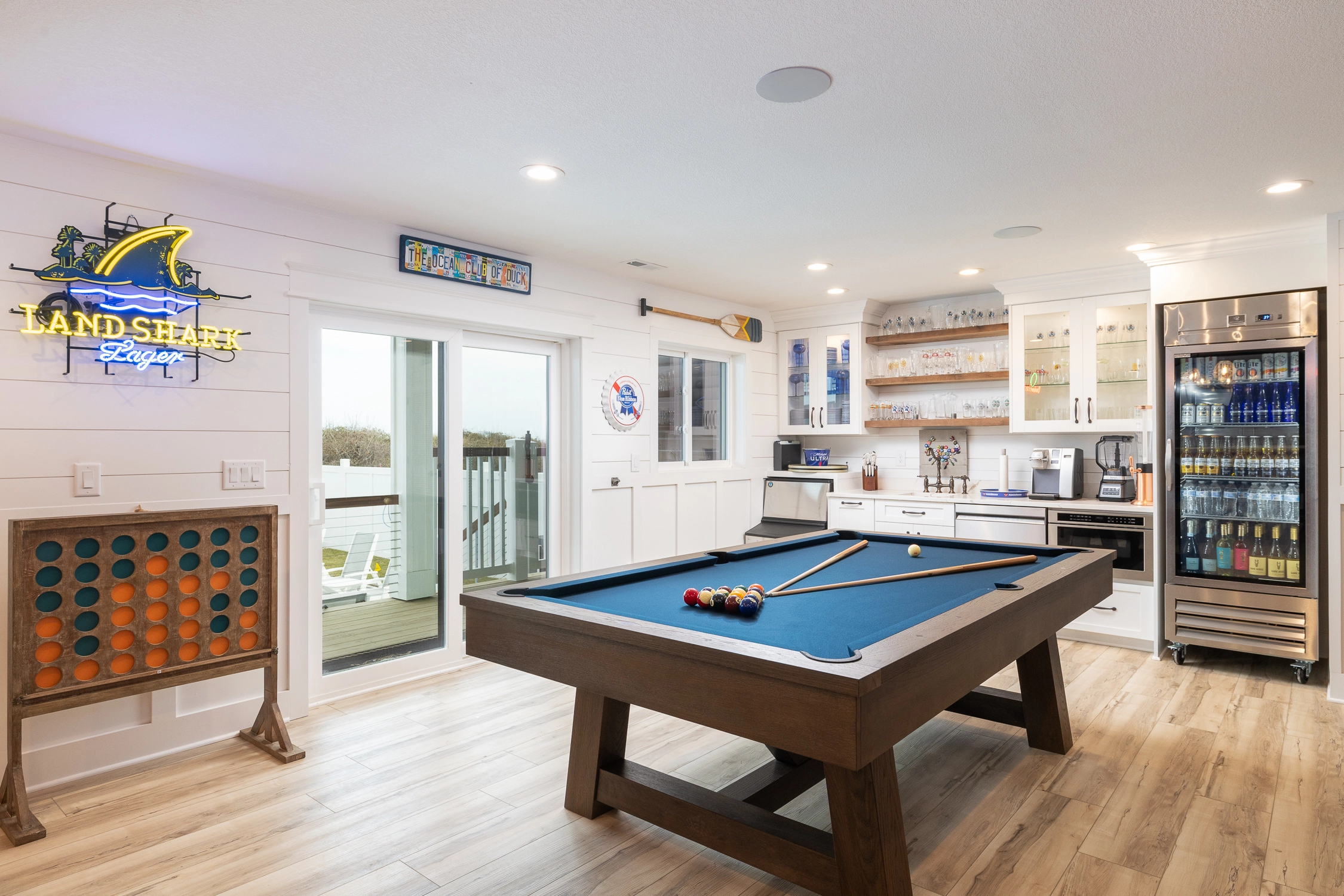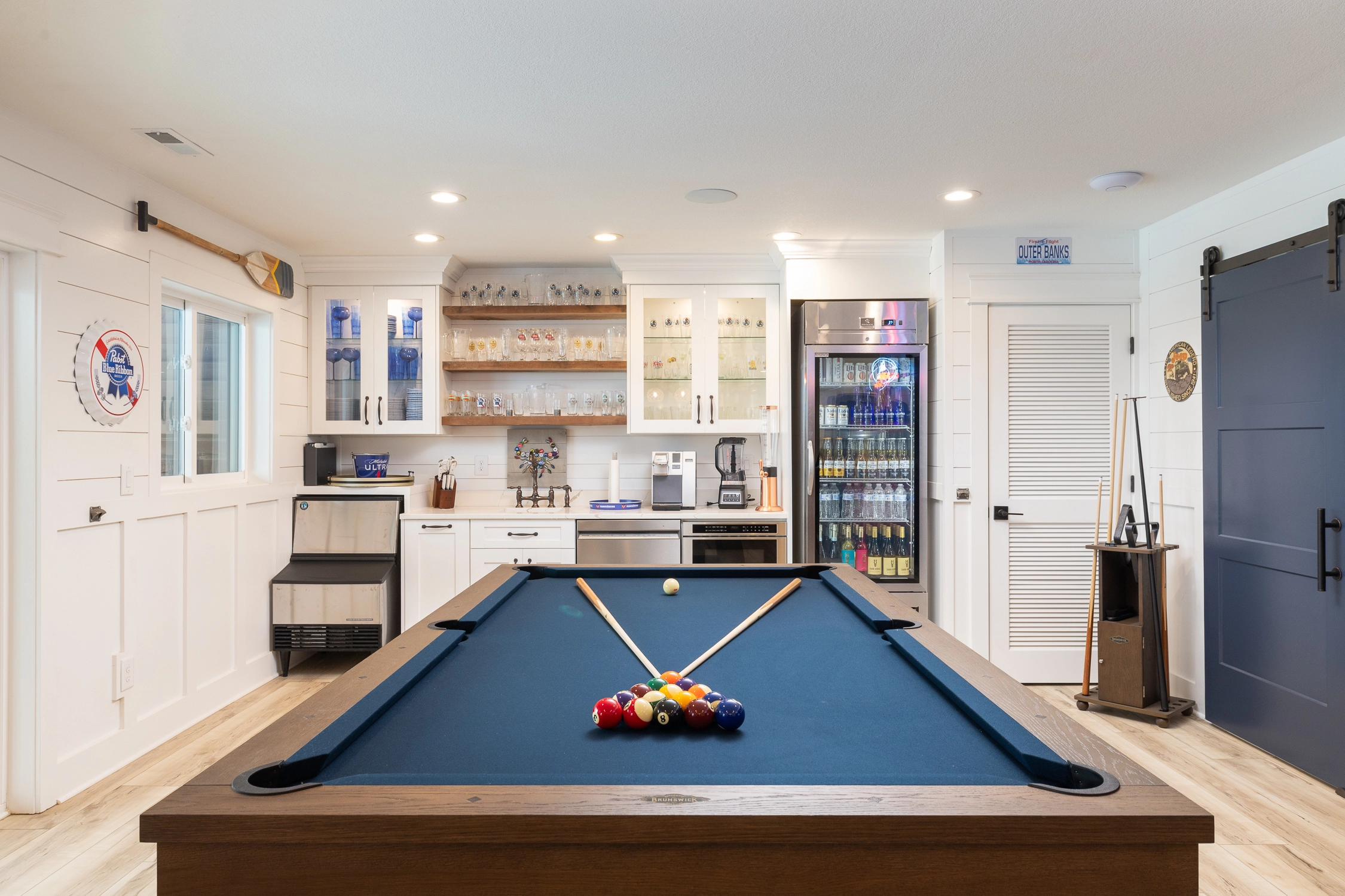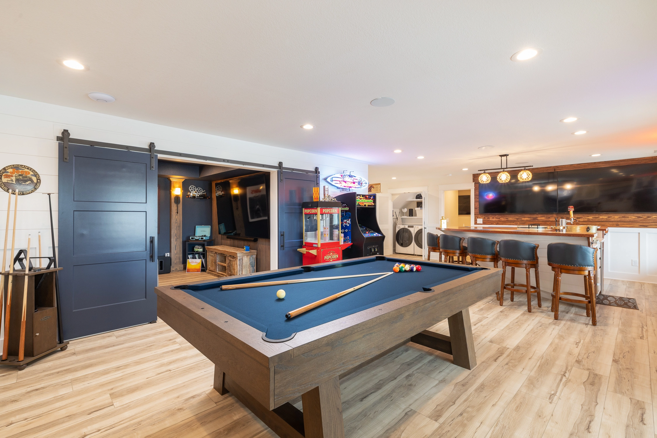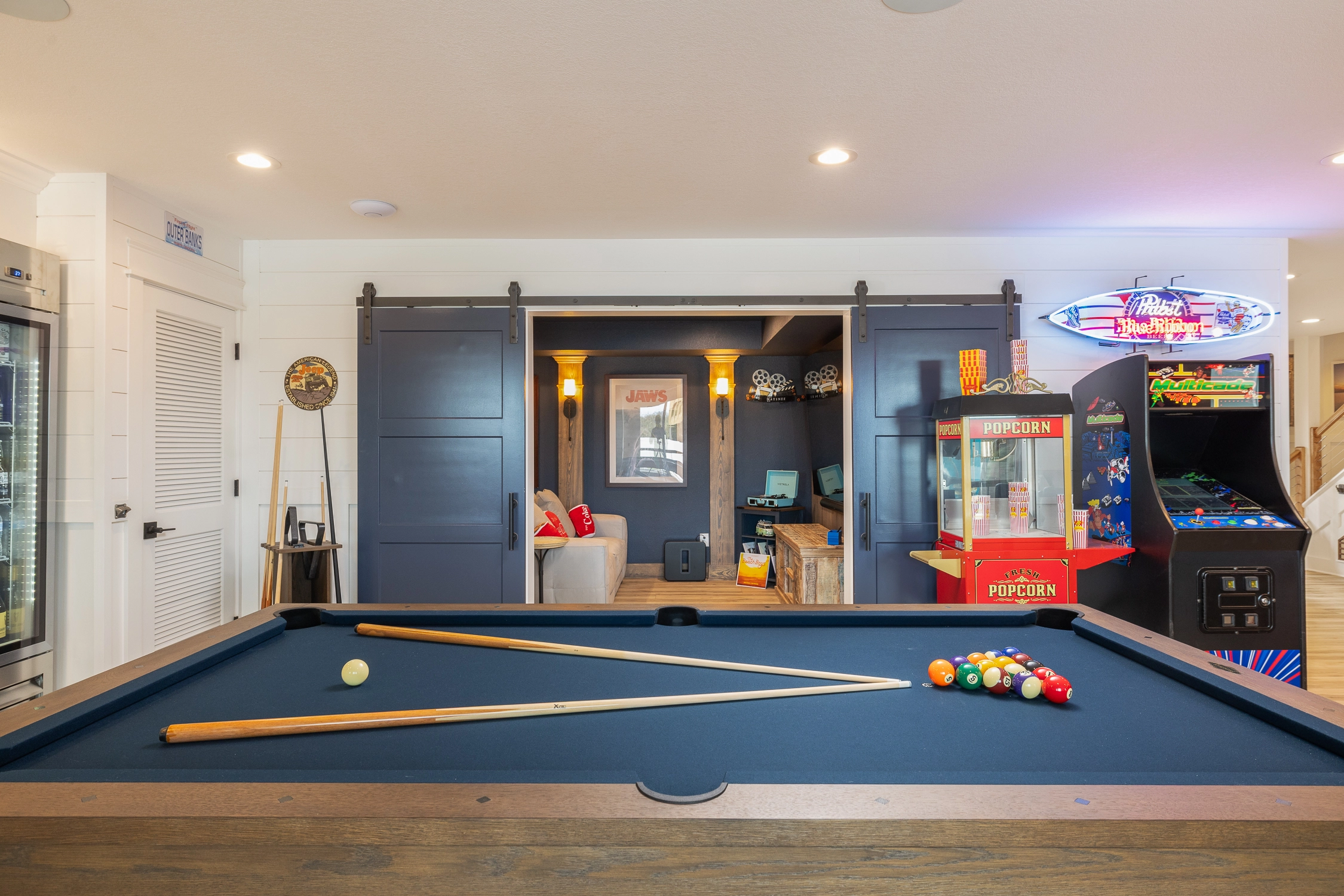 Theater room; rec room with pool table, boat bar with wet bar and refrigerator; laundry.