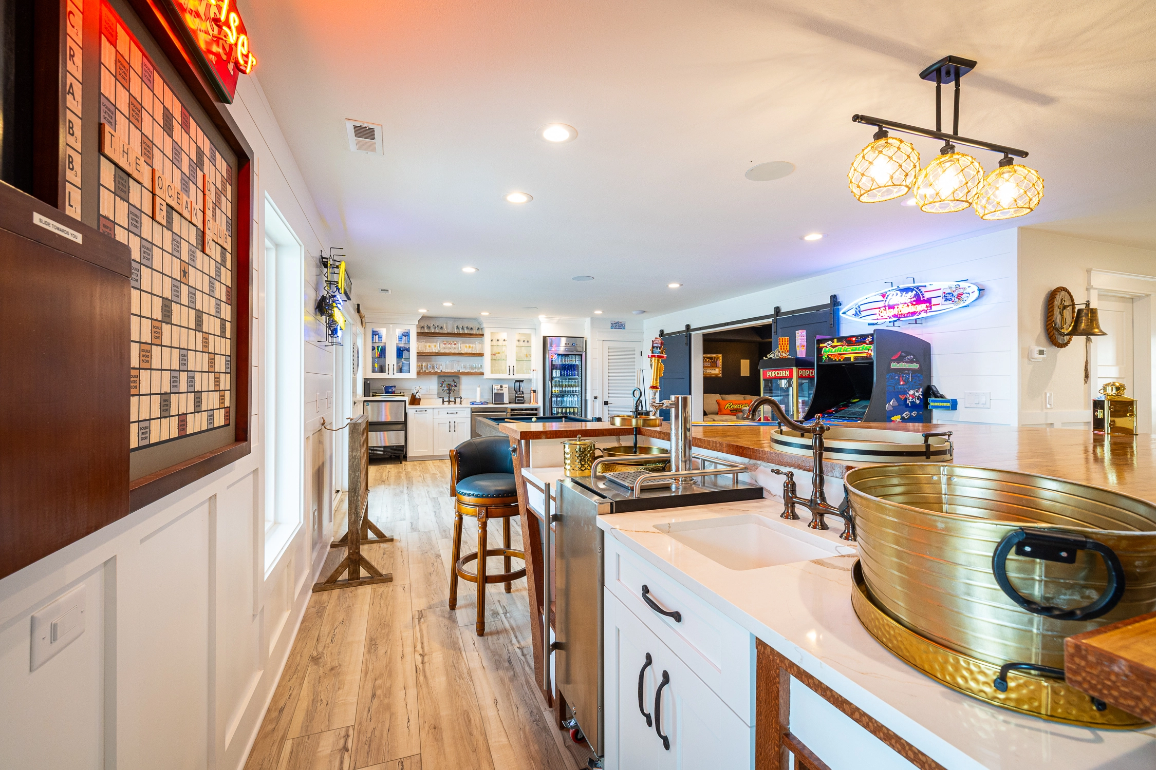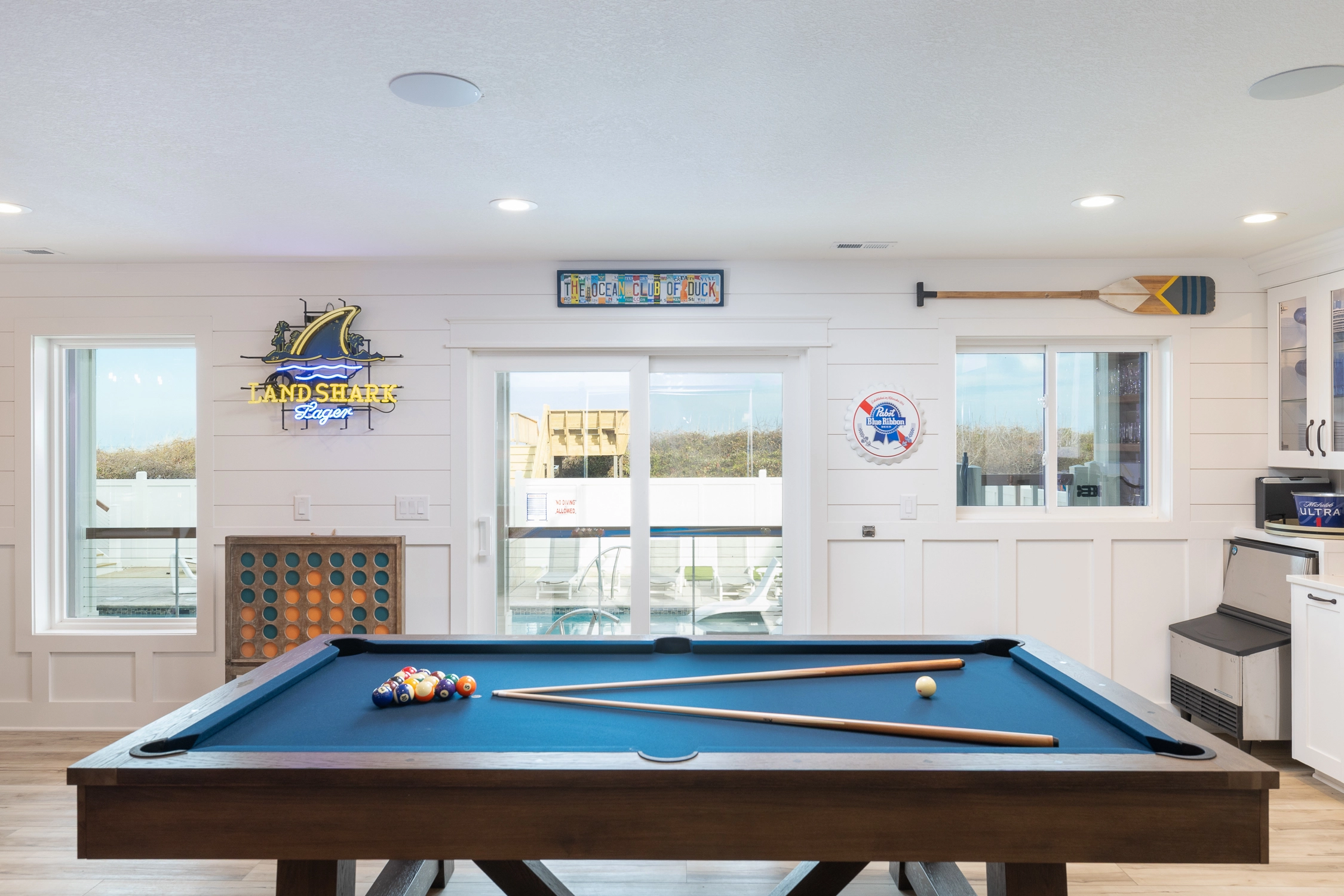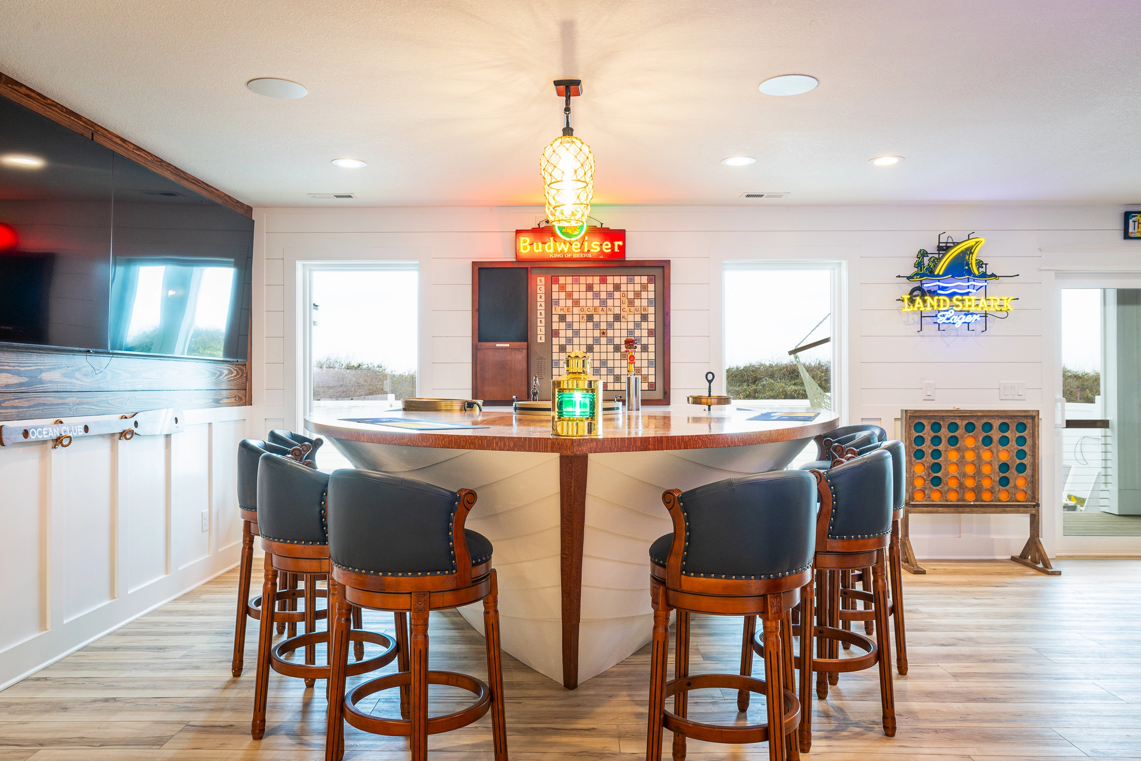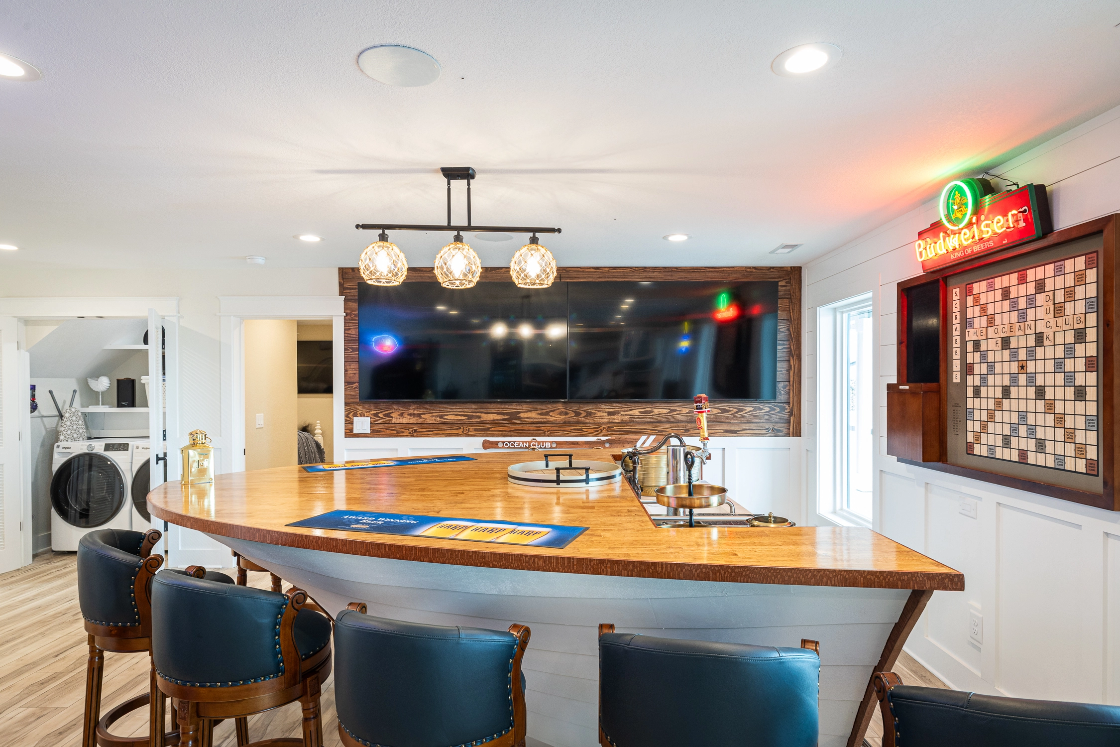 Theater room; rec room with pool table, boat bar with wet bar and refrigerator; laundry.