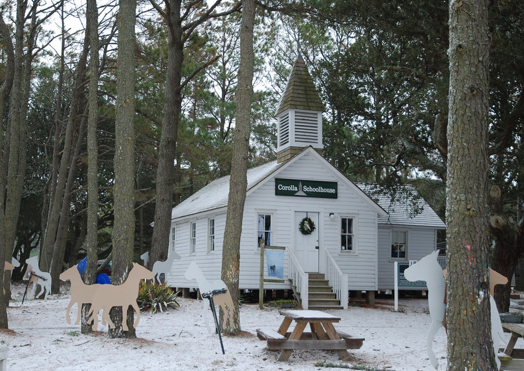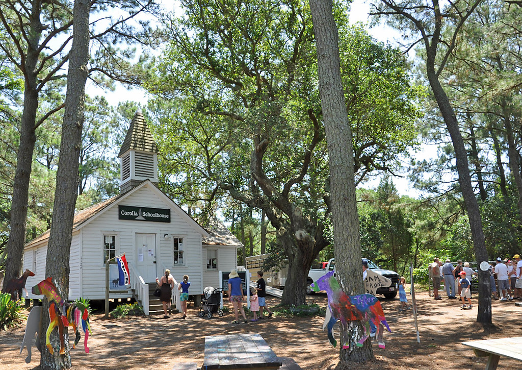 While the exact date of construction is unknown, some say the schoolhouse was built as early as 1890 and others estimate that it was built around 1905 by Corolla residents Sol Sanderlin and Val Twiford. Norris Austin, Corolla’s postmaster of 33 years, attended the school when he was a child and shared his thoughts before he passed away in 2017. He believed his father and uncles attended the school as early as 1896, when the school was private. Some historians claim their research has led them to Board of Education meeting minutes that mention the school as early as 1890. This one-room schoolhouse was the first unified Corolla school created by the Currituck County School system in 1905. School was in session until 1958 when the schoolhouse was closed due to lack of students. In the meantime, the Schoolhouse was privately owned and used as a residence. The building was restored in 1999 by the Twiddys and hosted an interactive educational exhibit on the wild horses of the Currituck Outer Banks until 2012. The one-room schoolhouse was reopened in August 2012 as a multi-age charter school to educate the children of Corolla.
