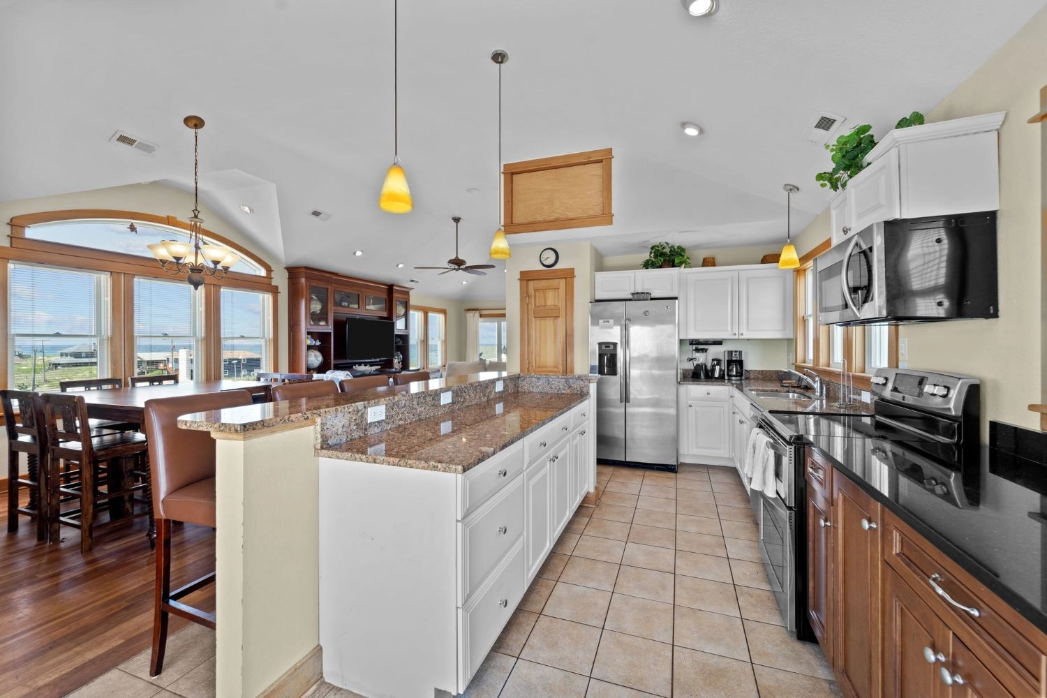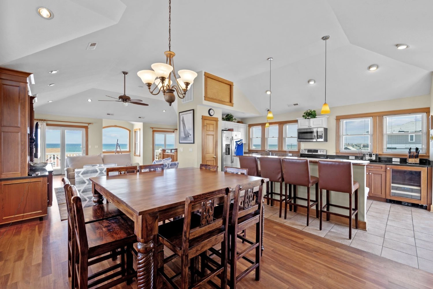 "Top floor great room provides breathtaking panoramic ocean views. Having lunch? Enjoy the view! Washing a dish? Enjoy the view! Scrambling eggs? Enjoy the view! Watching TV? You might be distracted by the view! Also beautiful are the wall hangings and art. Not your typical beach kitsch. Comfortably upscale!"