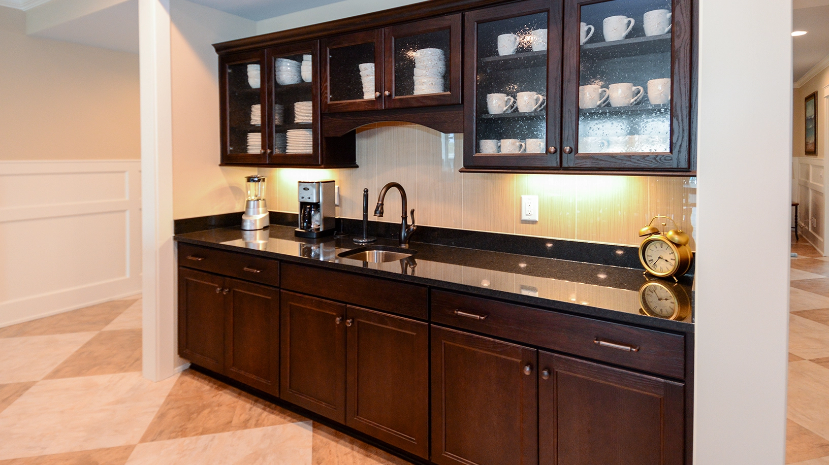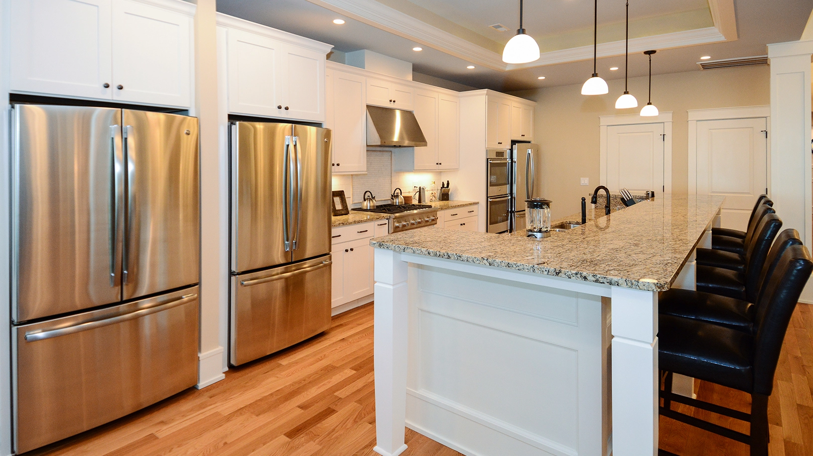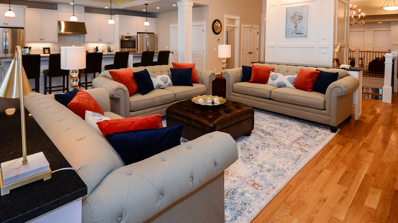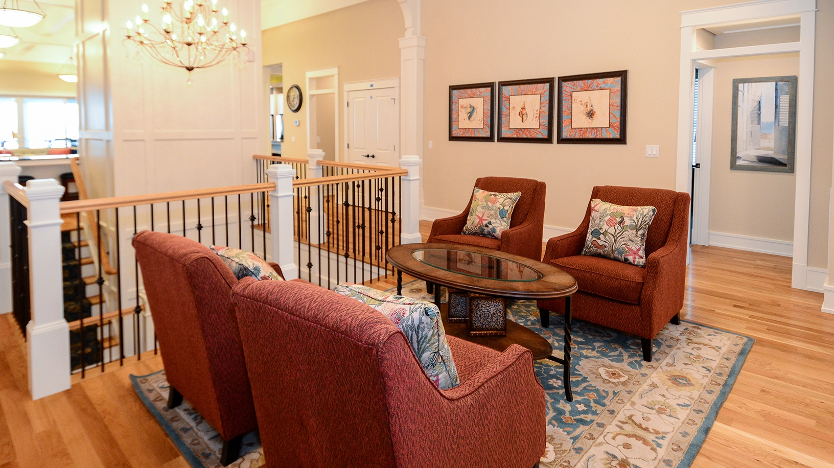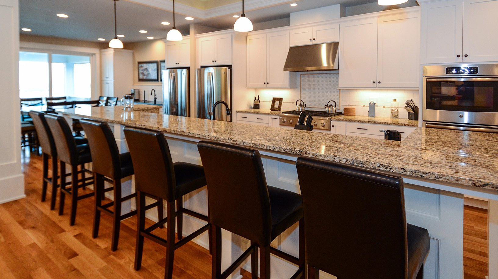 Great room with gas fireplace; kitchen with walk-in pantry, two dishwashers, two refrigerators; dining area; pub/bar area; sitting area.