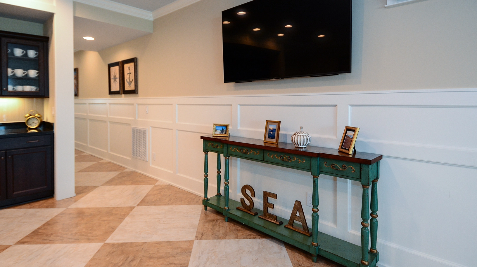 Rec room with pool table, game tables and bar area; sitting area; laundry.