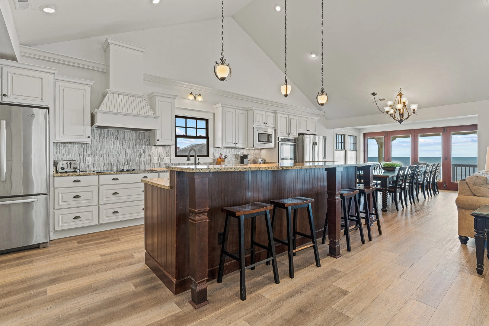 Great room with gas fireplace; kitchen with three refrigerators, two stoves, two ovens, and two dishwashers; dining area with kitchenette with refrigerator and dishwasher.