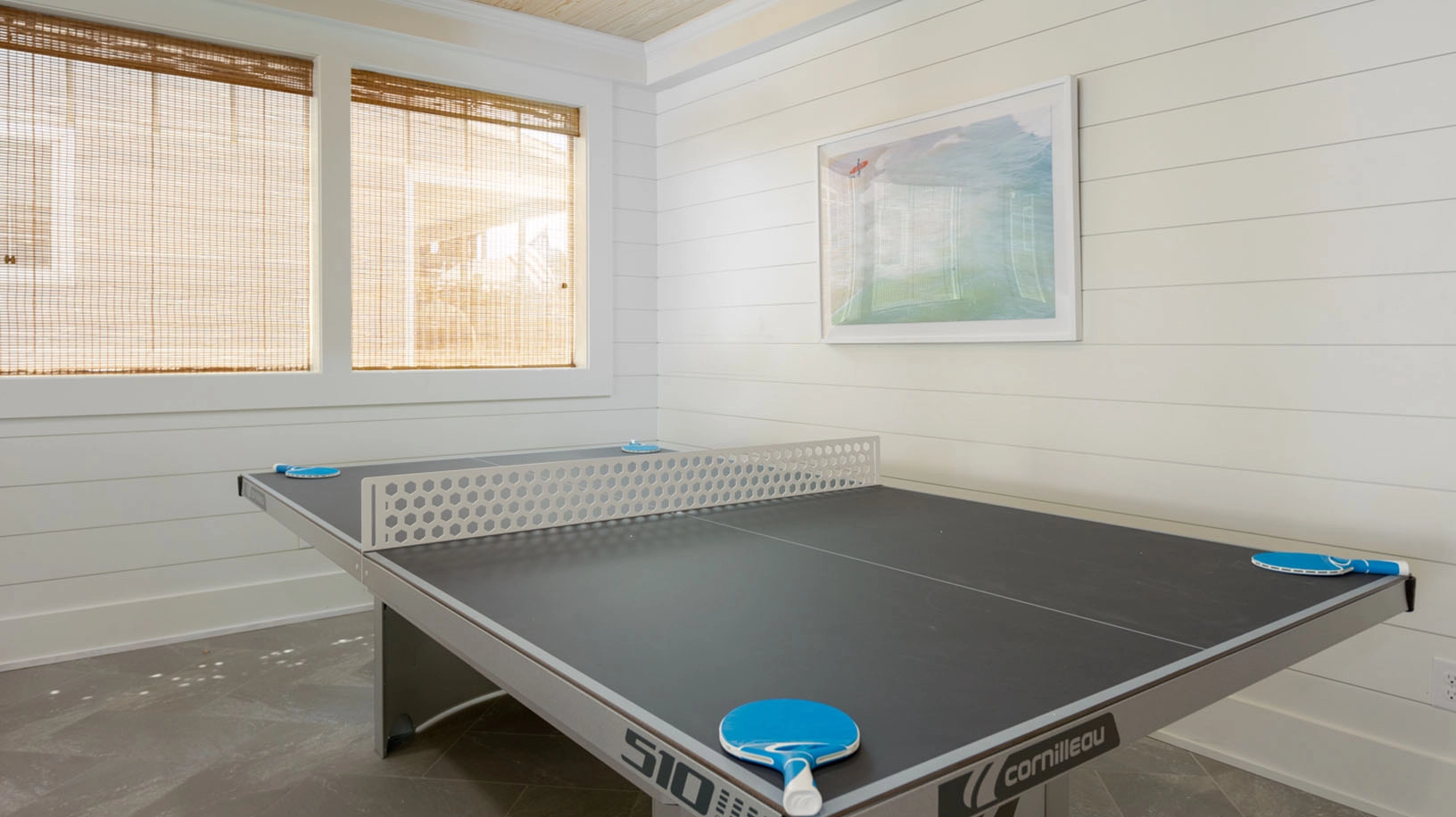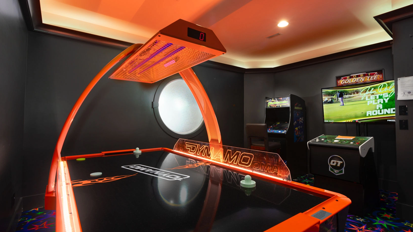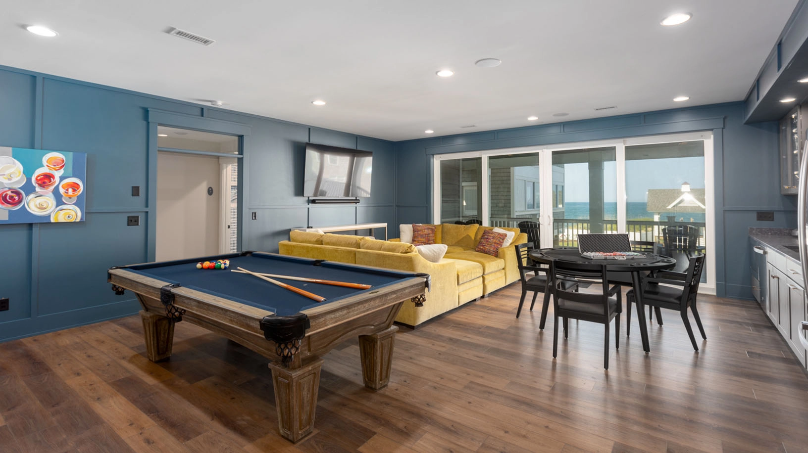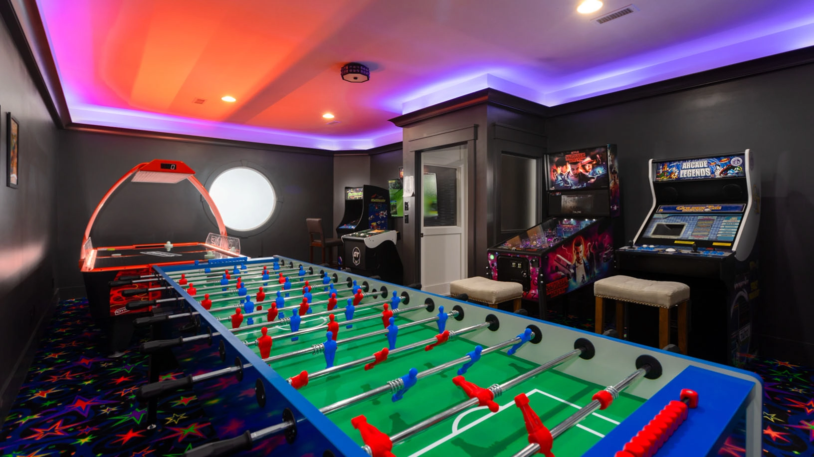 Rec room with pool table and wet bar; arcade room with air hockey; shuffleboard; laundry; exercise room with half bath accessible from exterior deck.