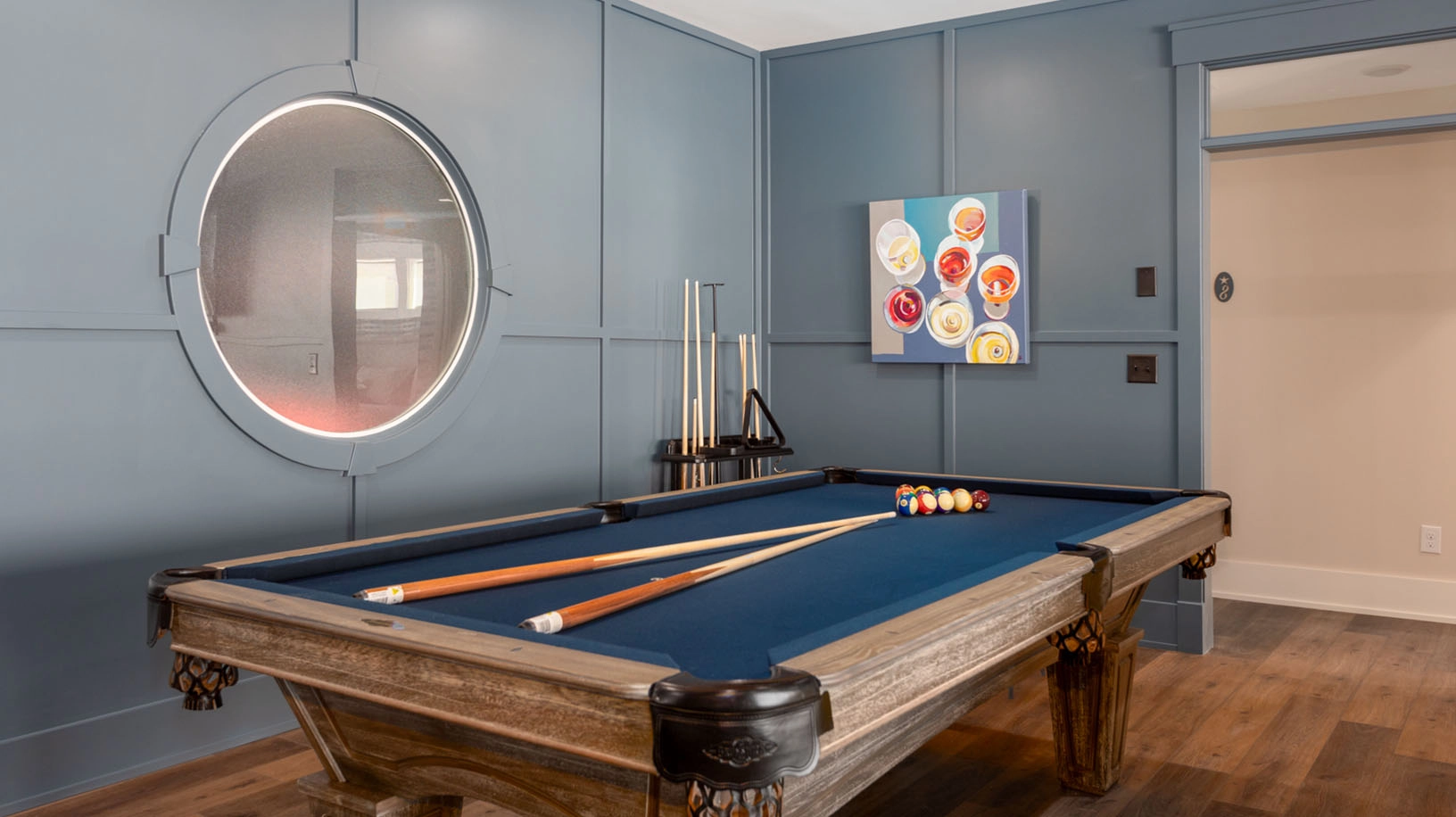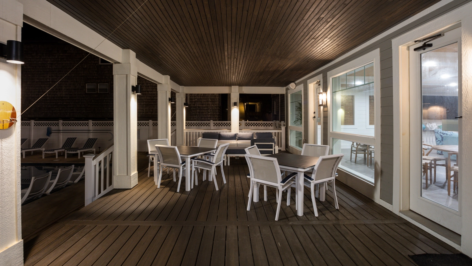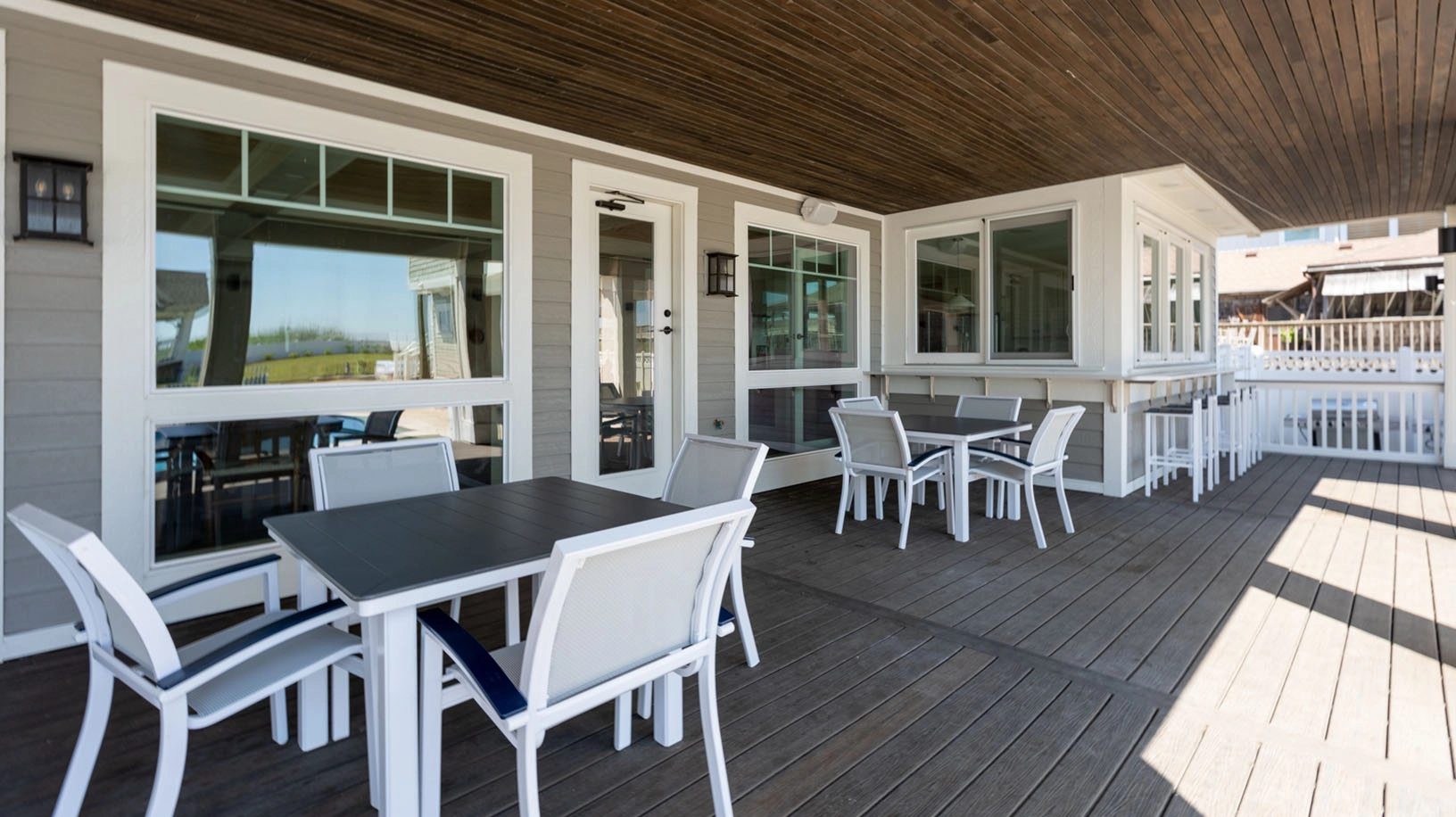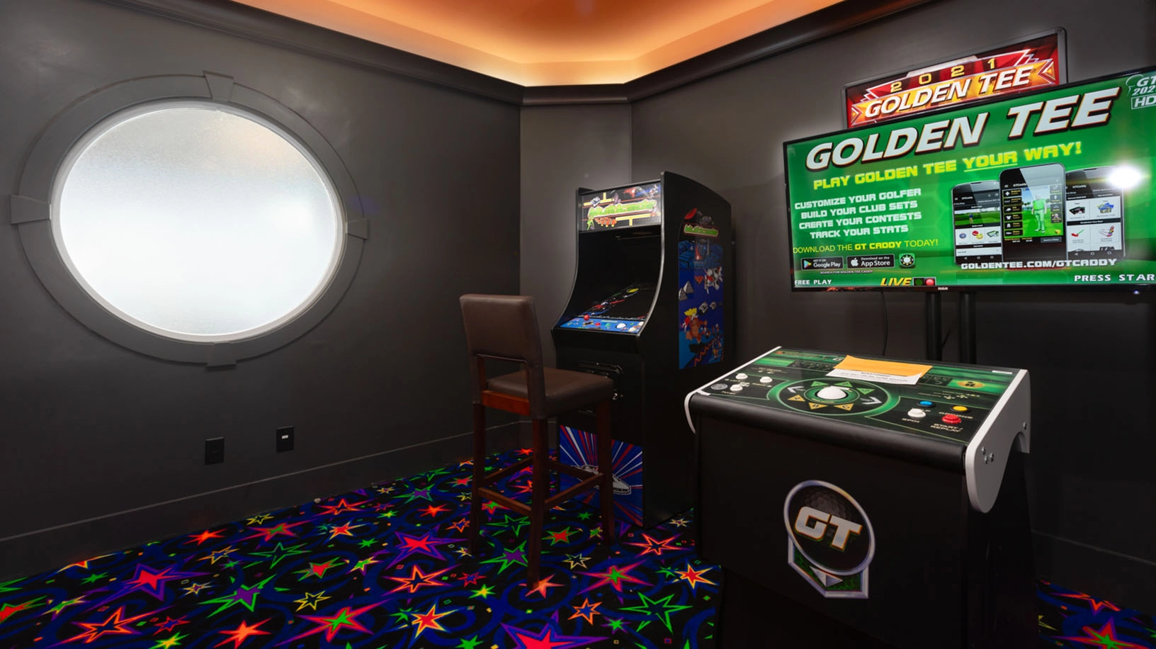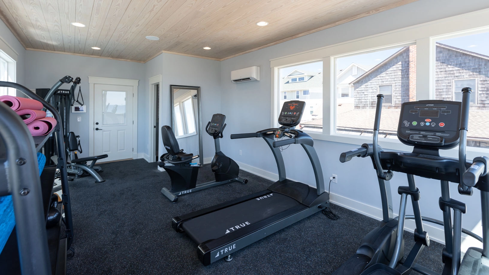 Rec room with pool table and wet bar; arcade room with air hockey; shuffleboard; laundry; exercise room with half bath accessible from exterior deck.