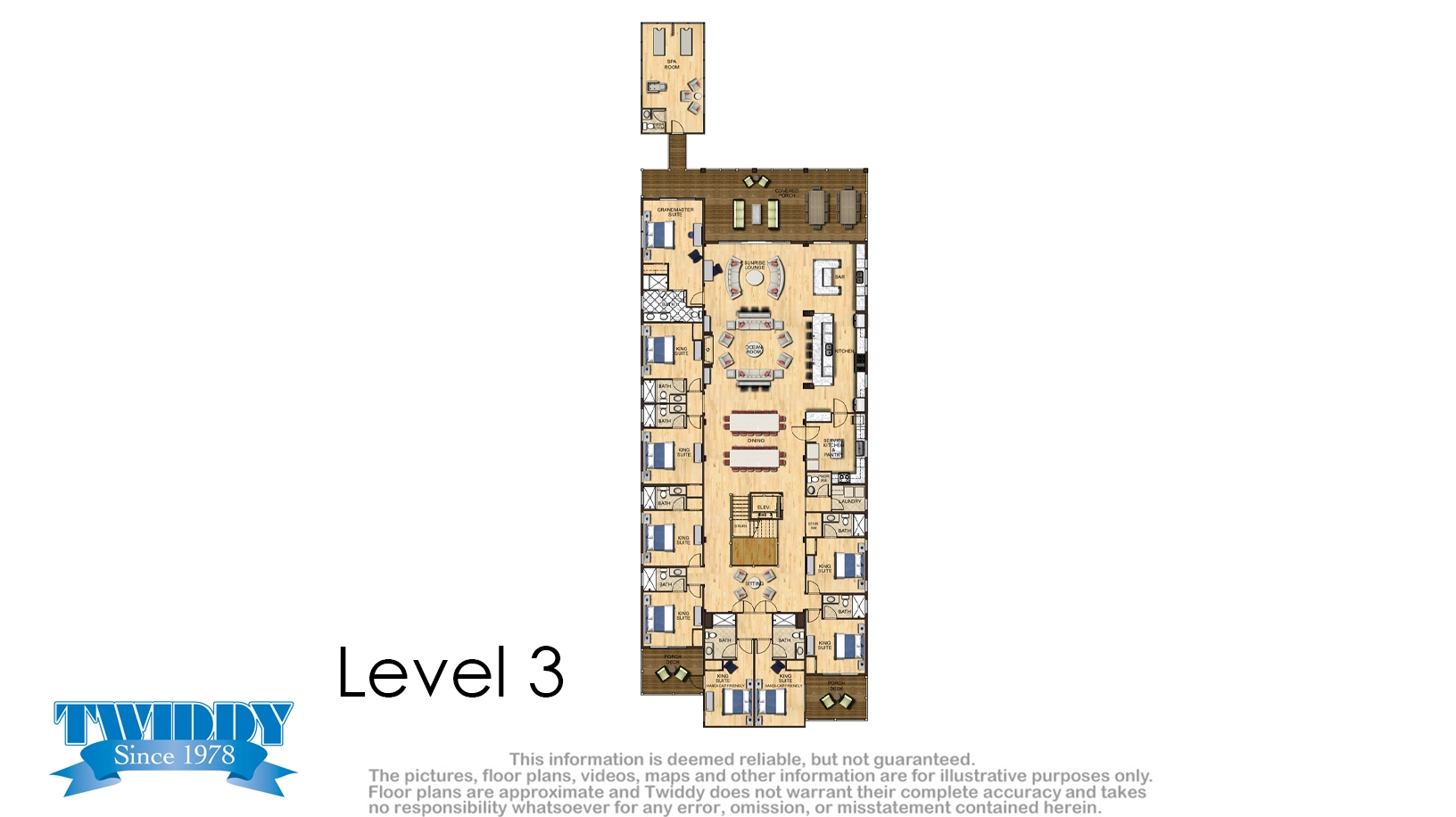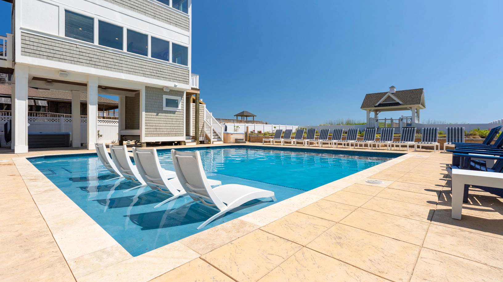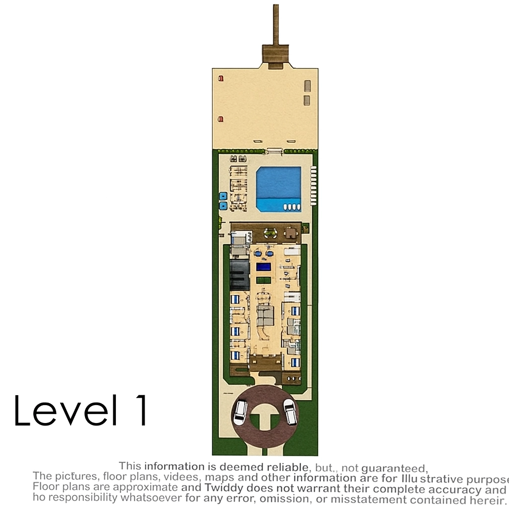 Elevator, private pool with tiki lounge, three hot tubs, event lawn, and two half cabana baths.