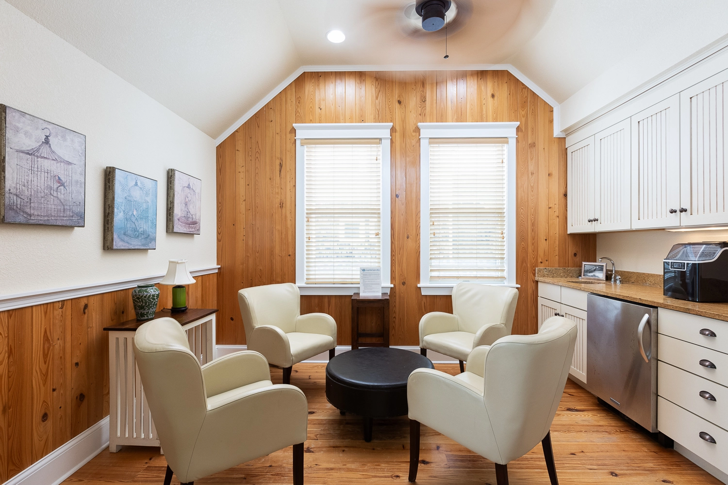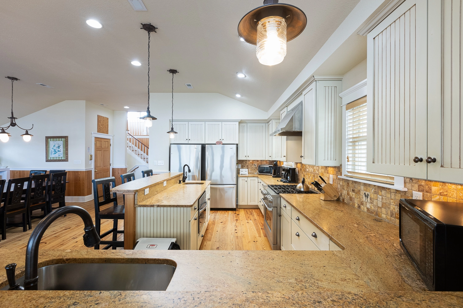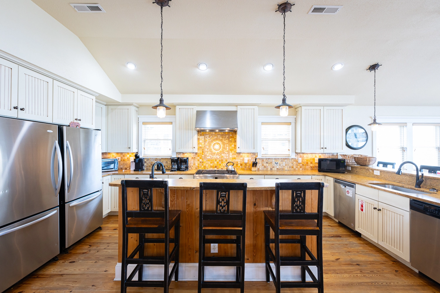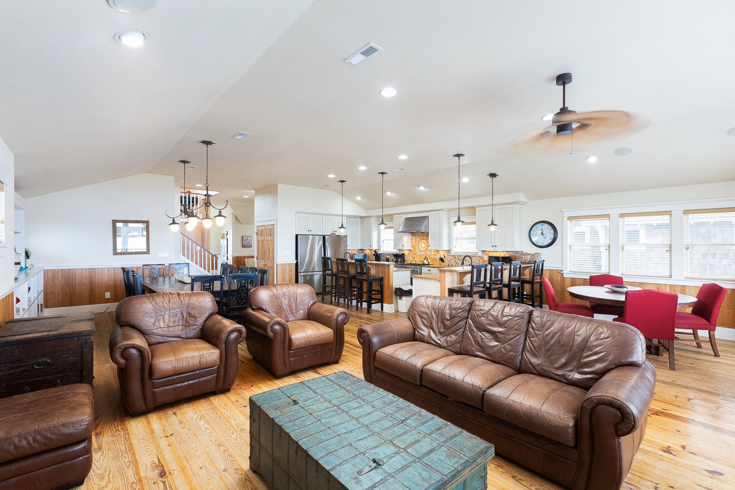 Great room; kitchen with gas stove; two refrigerators, and two dishwashers; dining area; sitting area with wet bar with dishwasher and icemaker.