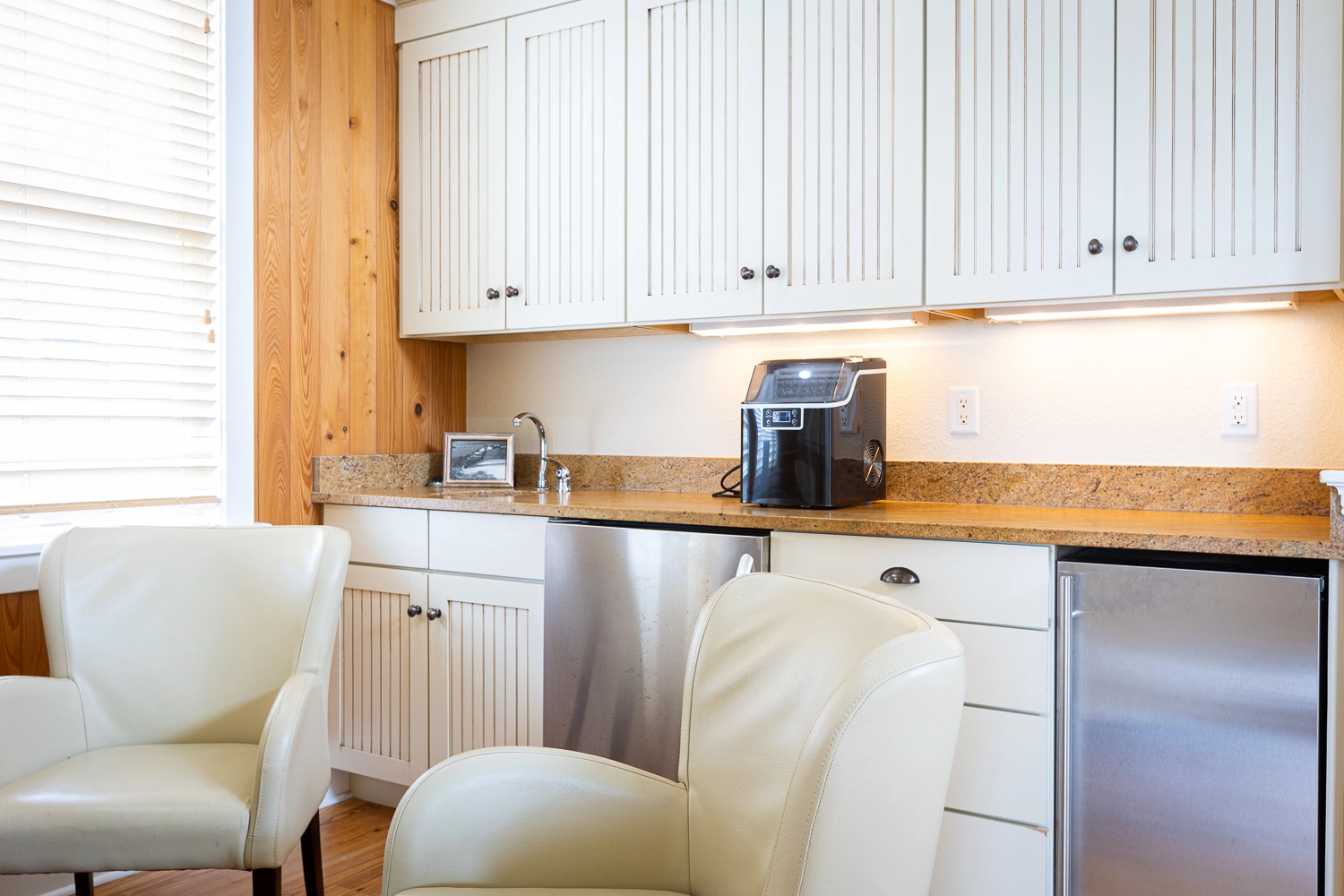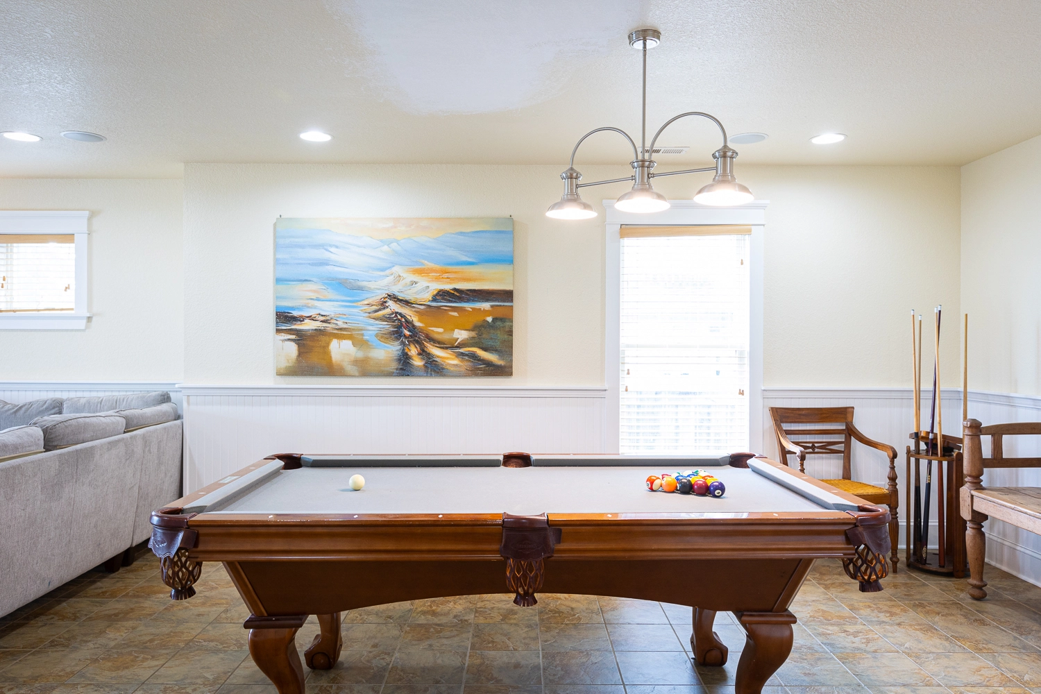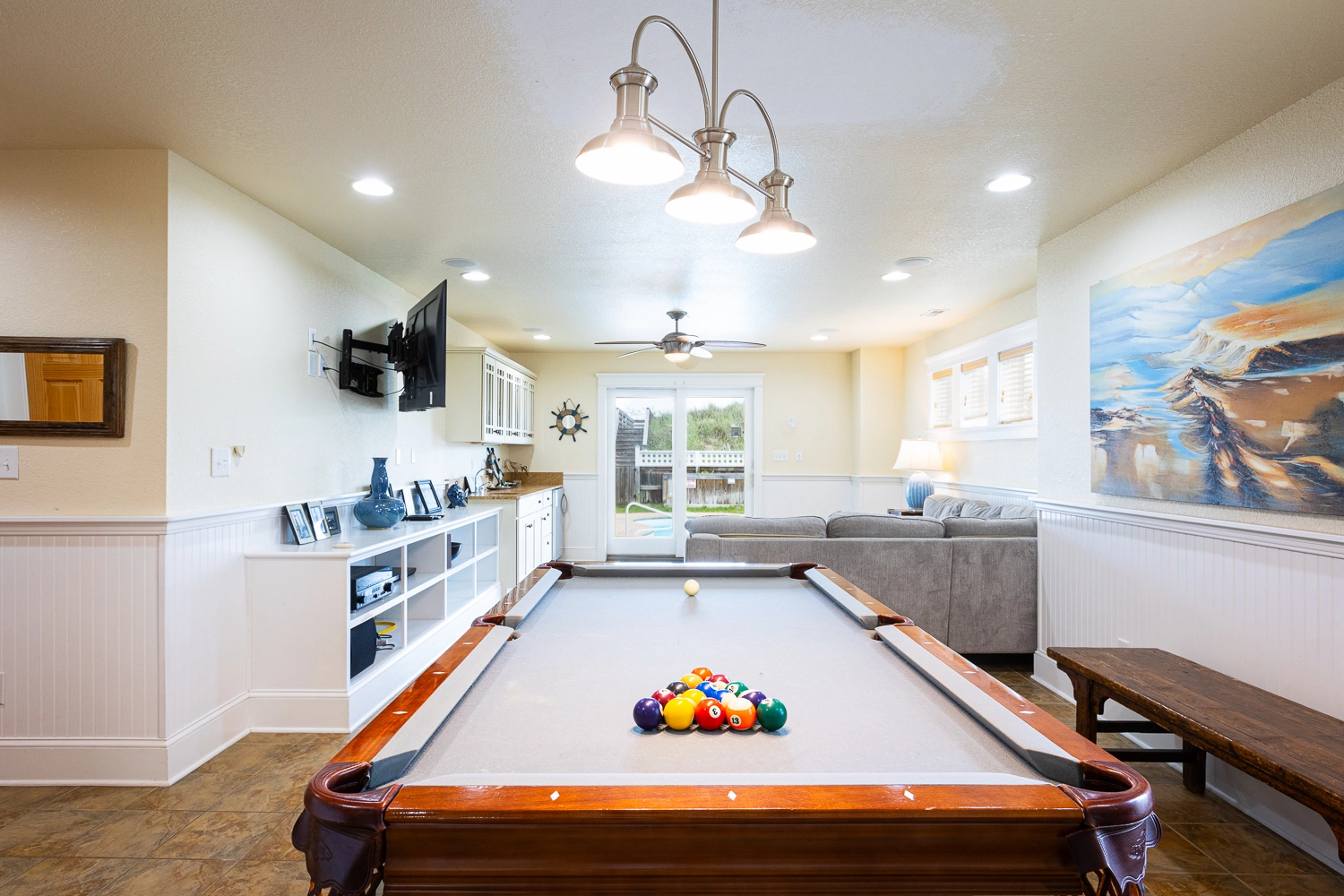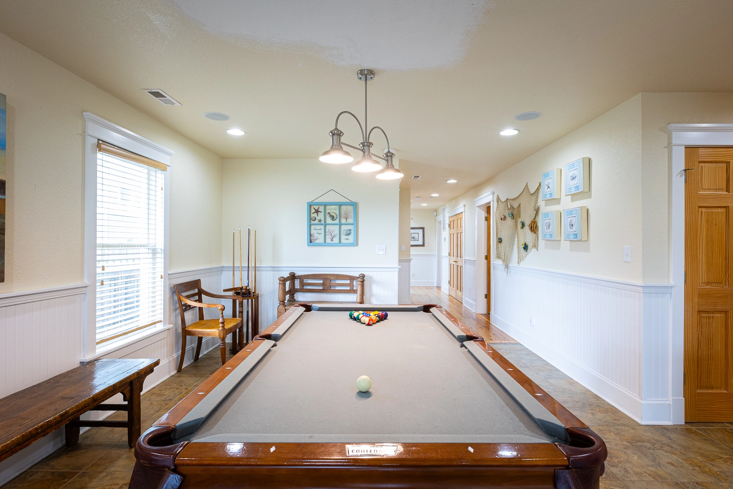 Rec room with pool table and wet bar with beverage refrigerator and ice machine. Laundry