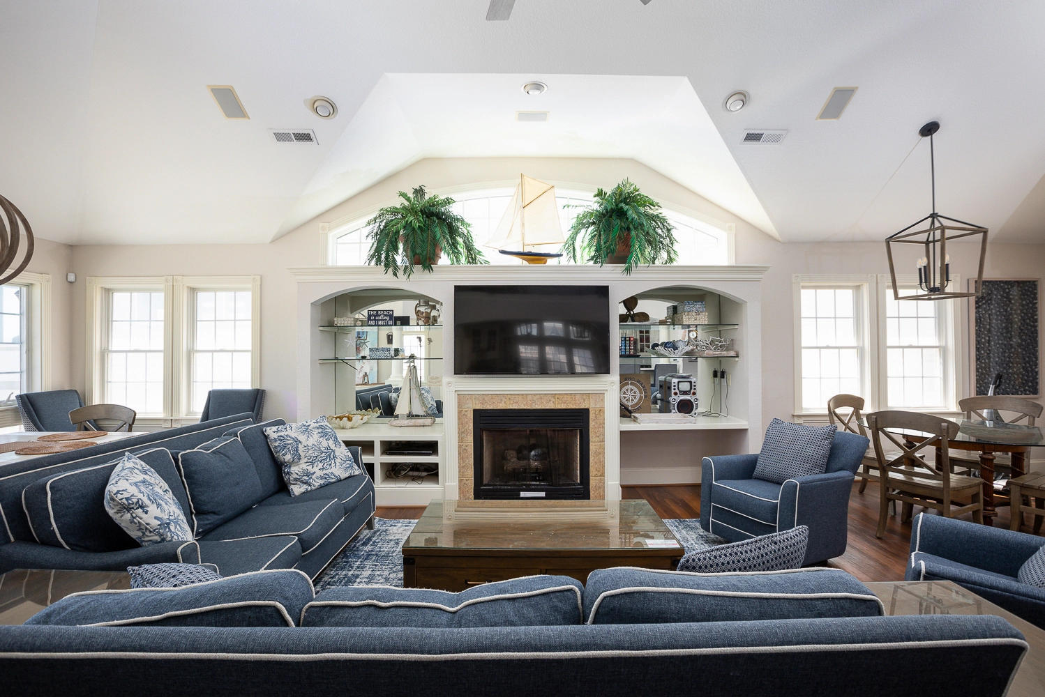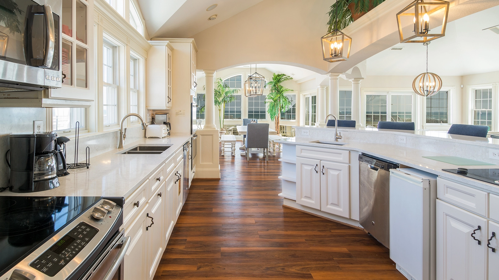 Great room with gas fireplace; kitchen with three ovens, two refrigerators, two dishwashers, and two cooktops; dining area; office.