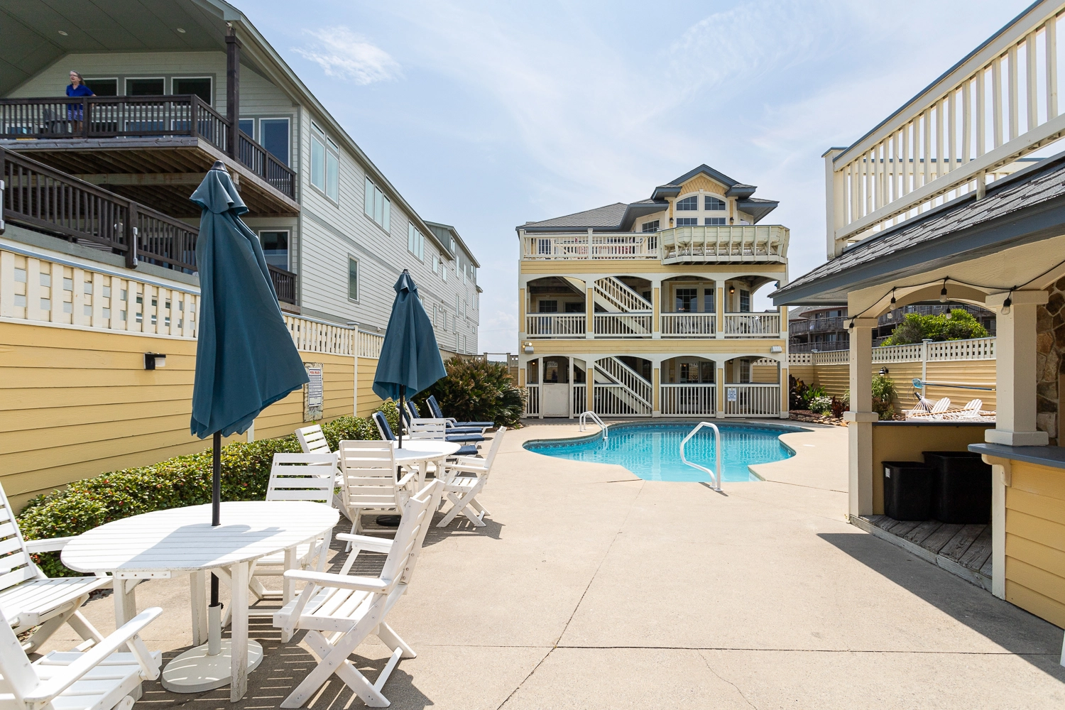 "The pool area with the hot tub and the Tiki Hut were a favorite with the family. Especially the refrigerator and bathroom. The walkover to get to the beach was also very nice for getting to the beach. Having two umbrellas and six chairs put up daily was a plus for the beach goers. The kitchen area was large enough for several people to work with getting into each other's way."