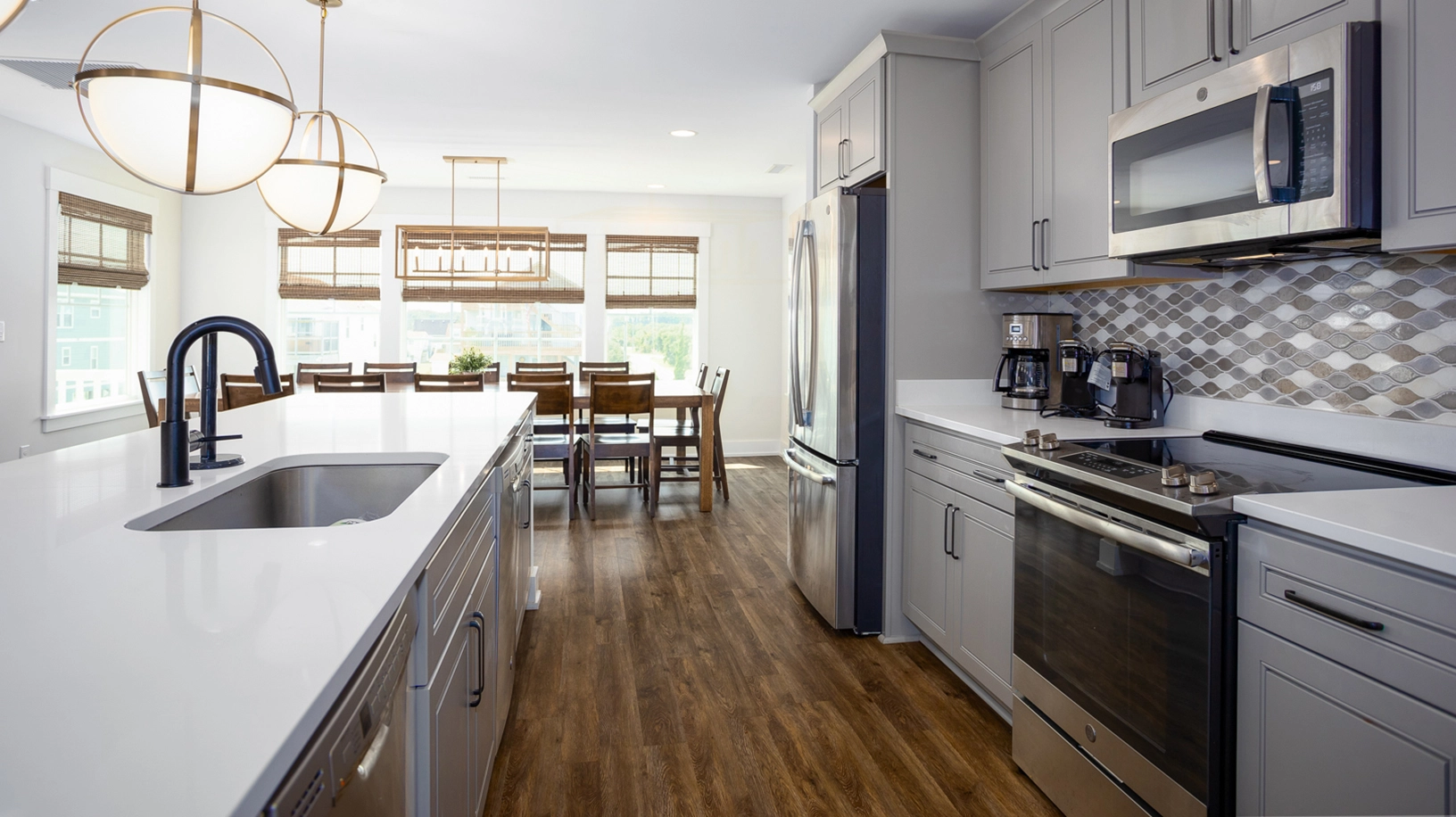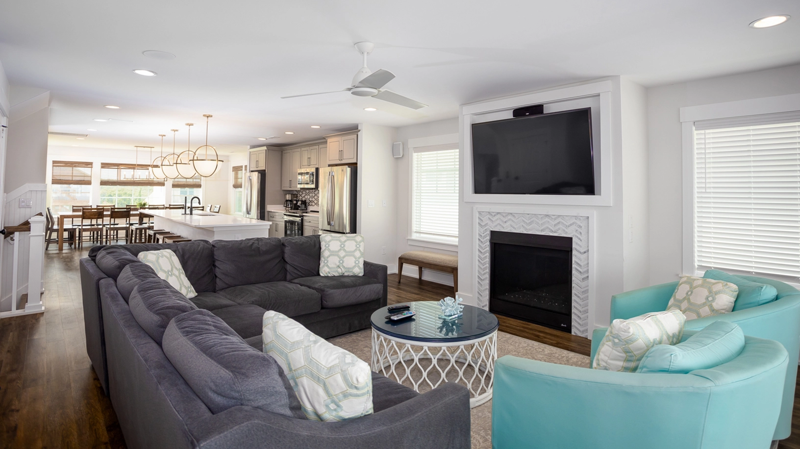 Great room with gas fireplace; kitchen with two refrigerators, two dishwashers, and wet bar; dining area.