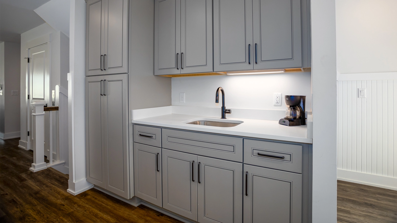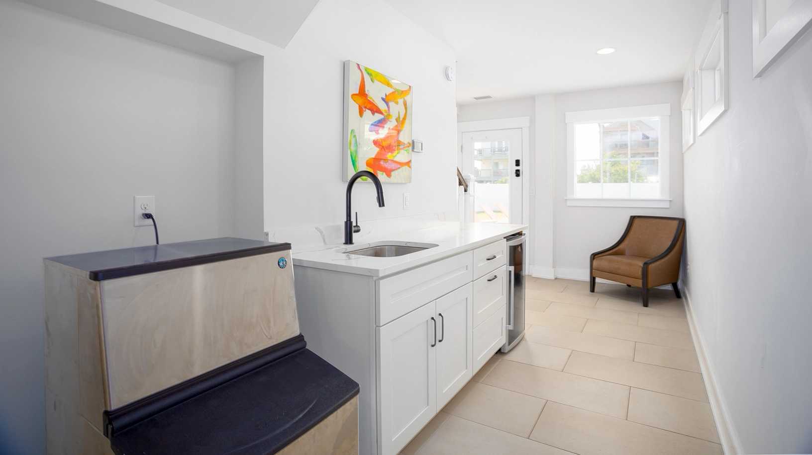 Entry with wet bar with beverage refrigerator and ice machine.