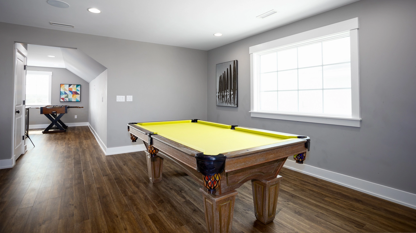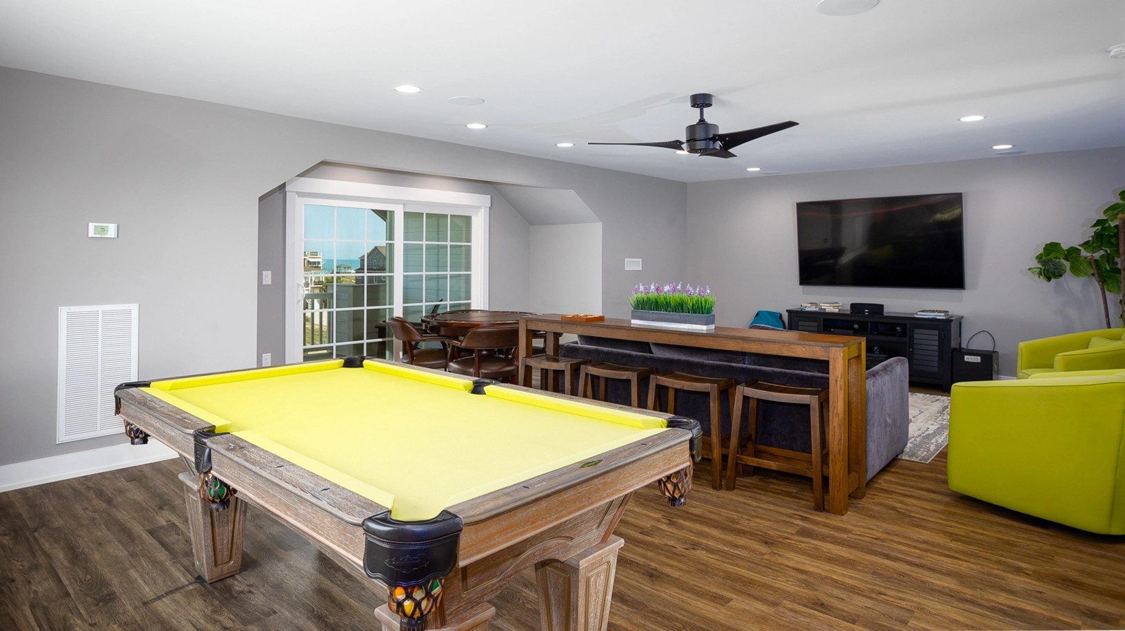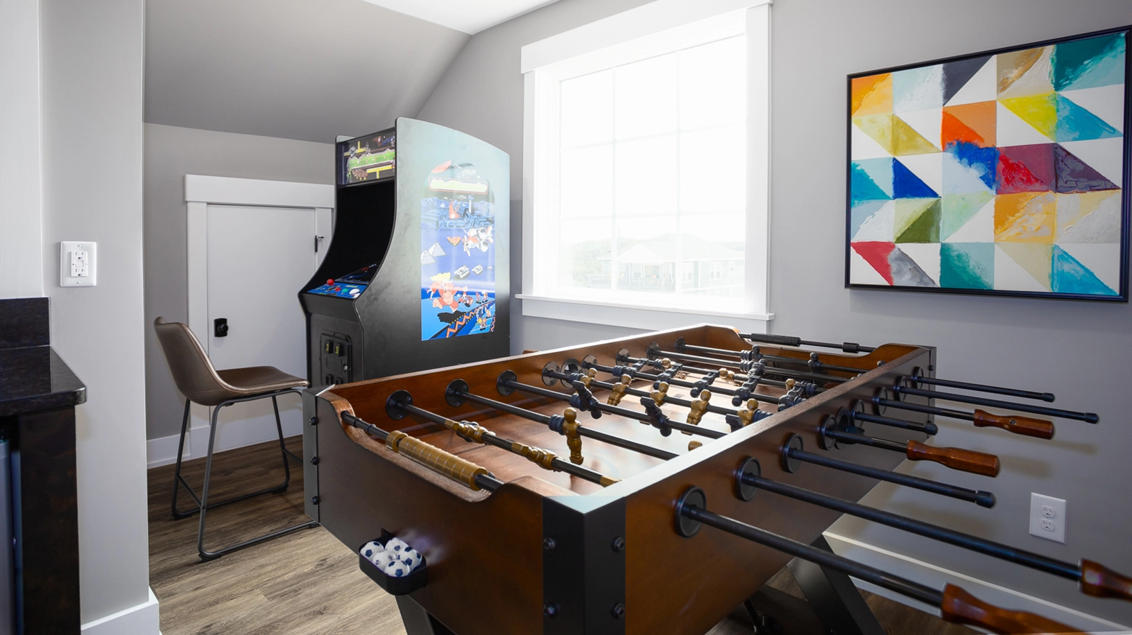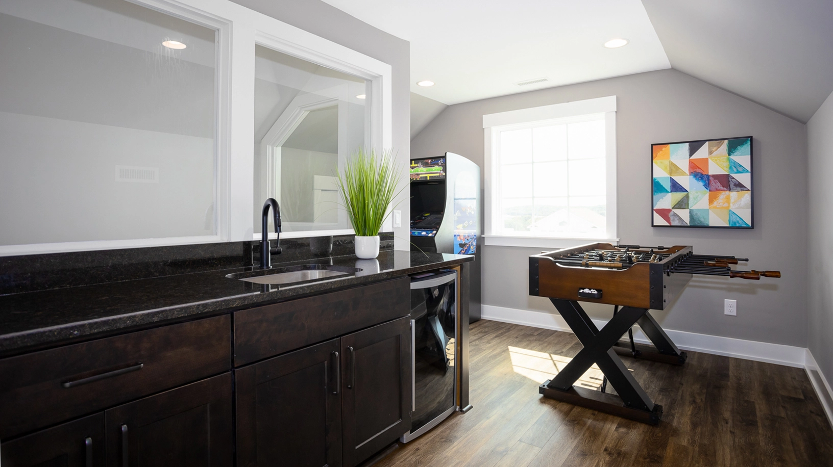 Rec room with pool table, foosball, arcade game, and wet bar with beverage refrigerator.