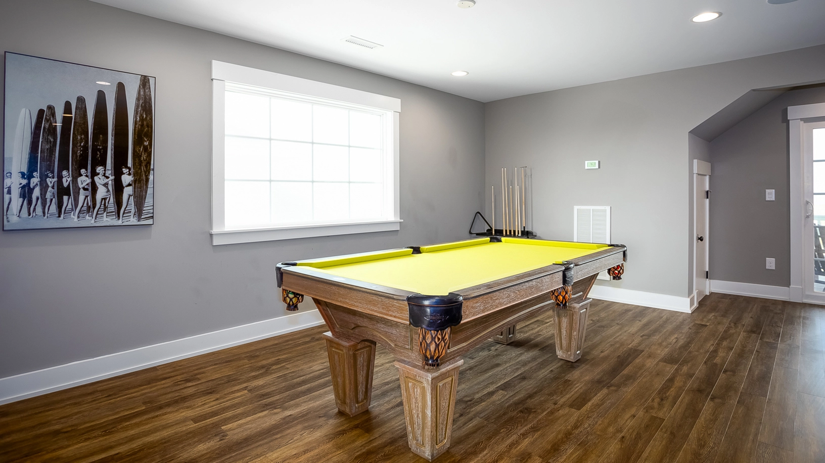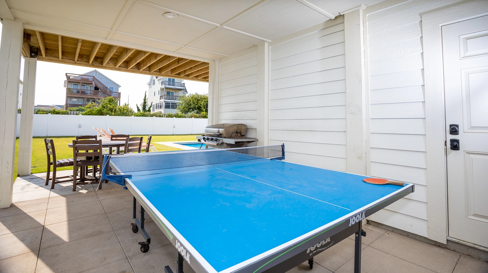 "The game room The grass yard around the pool The covered decks"