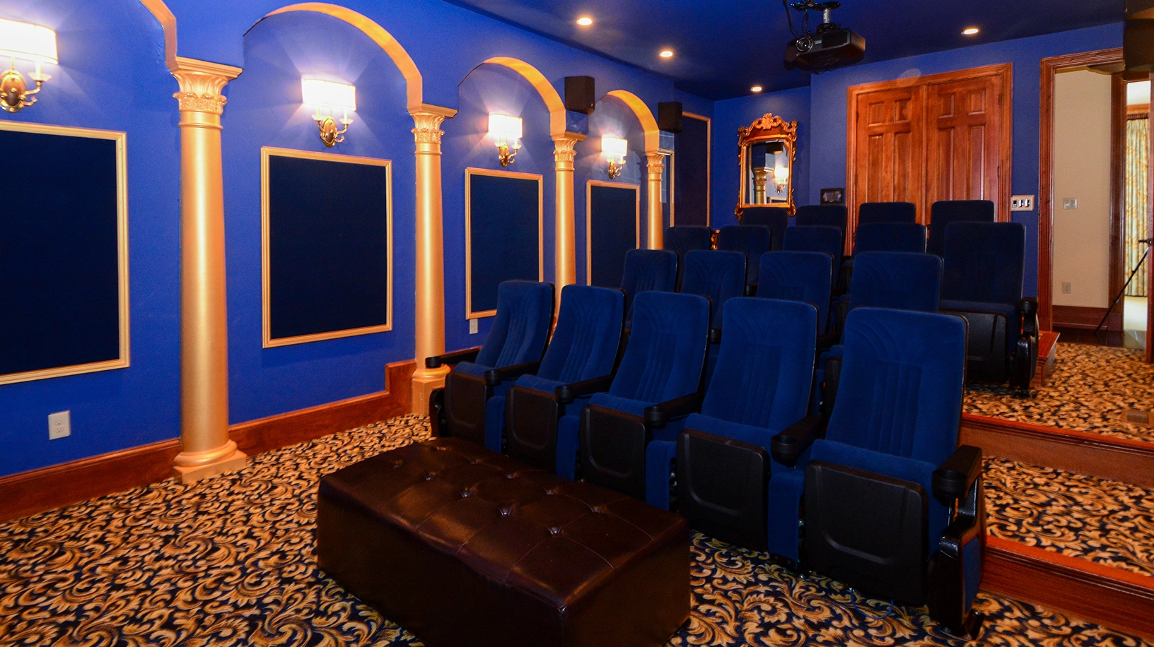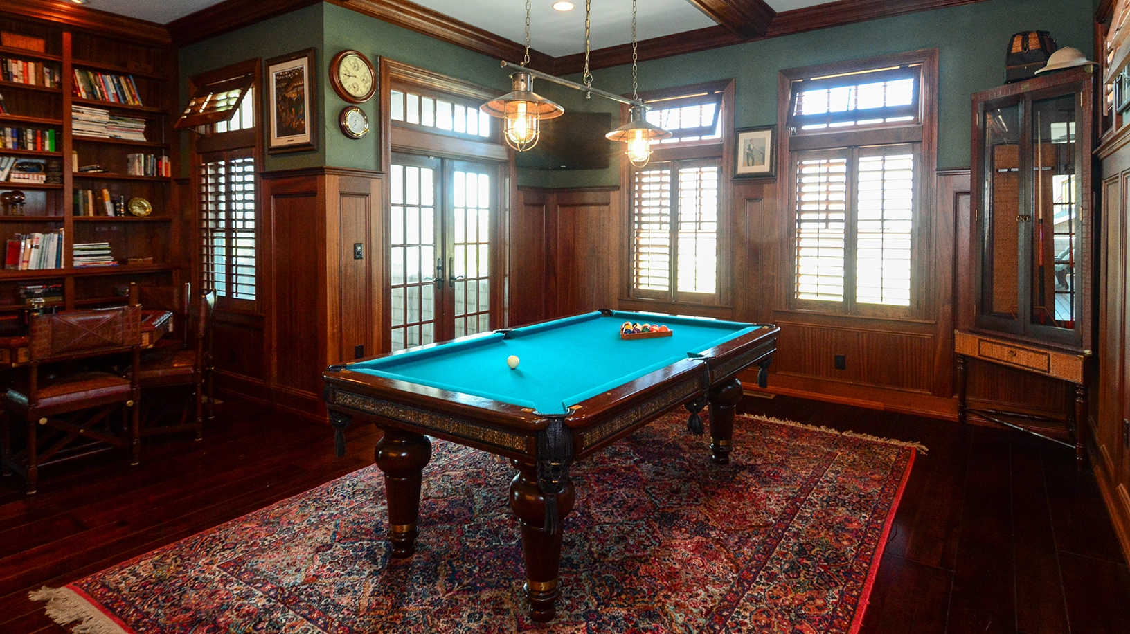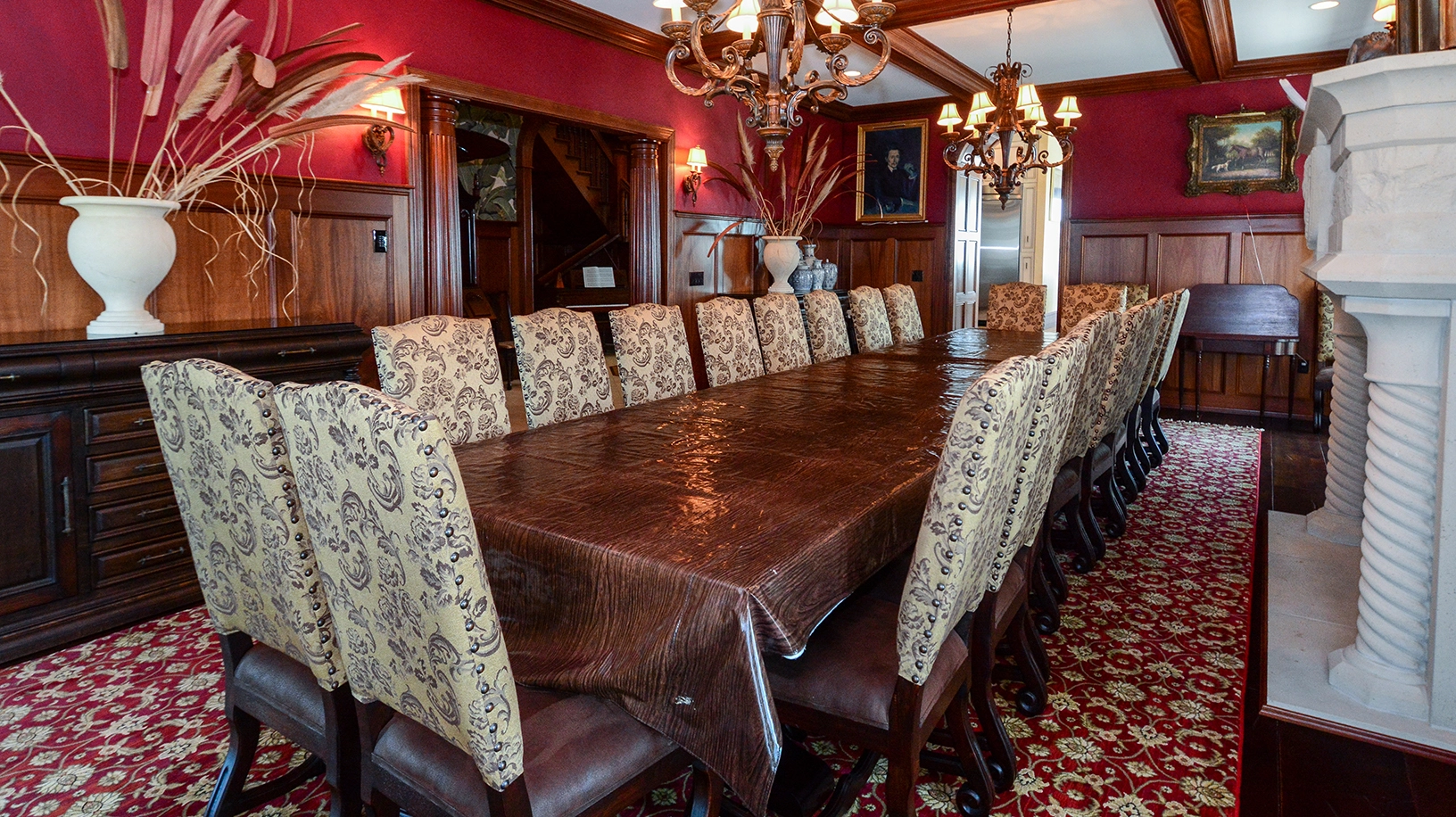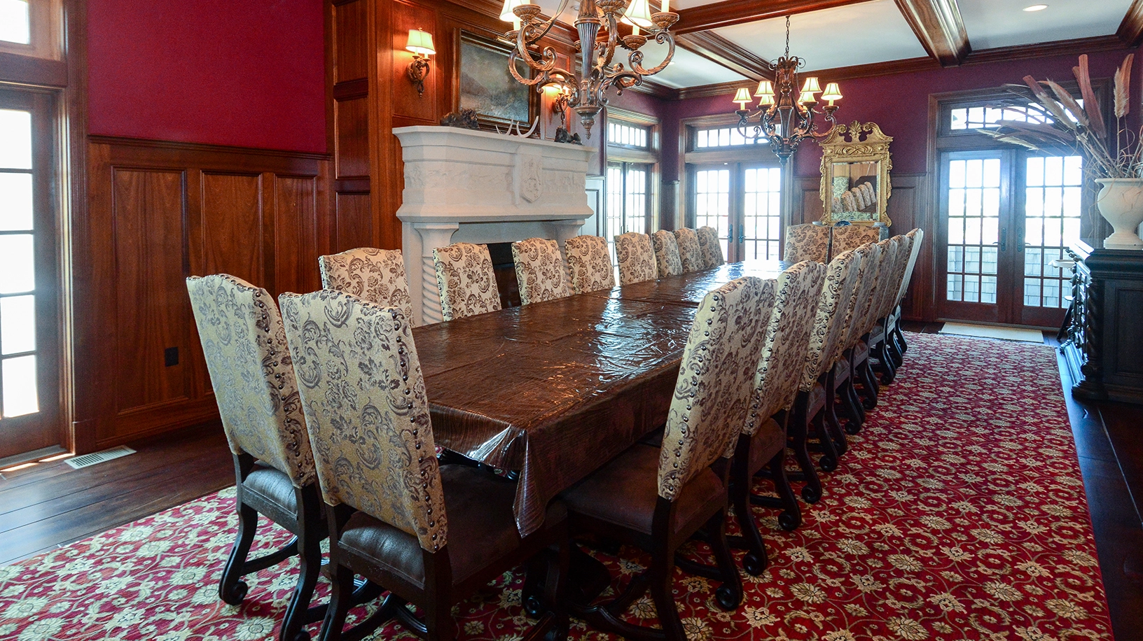 Great room; kitchen with two refrigerators, two dishwashers, two ovens, and commercial stove; dining area with gas fireplace; rec room with pool table, library and bar; theatre room with seating for 18.