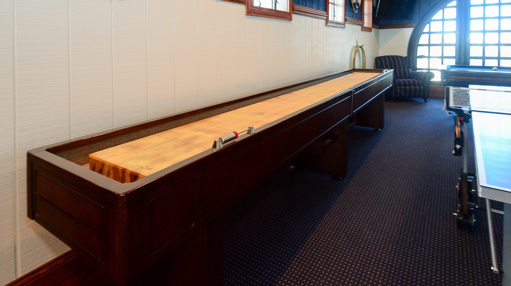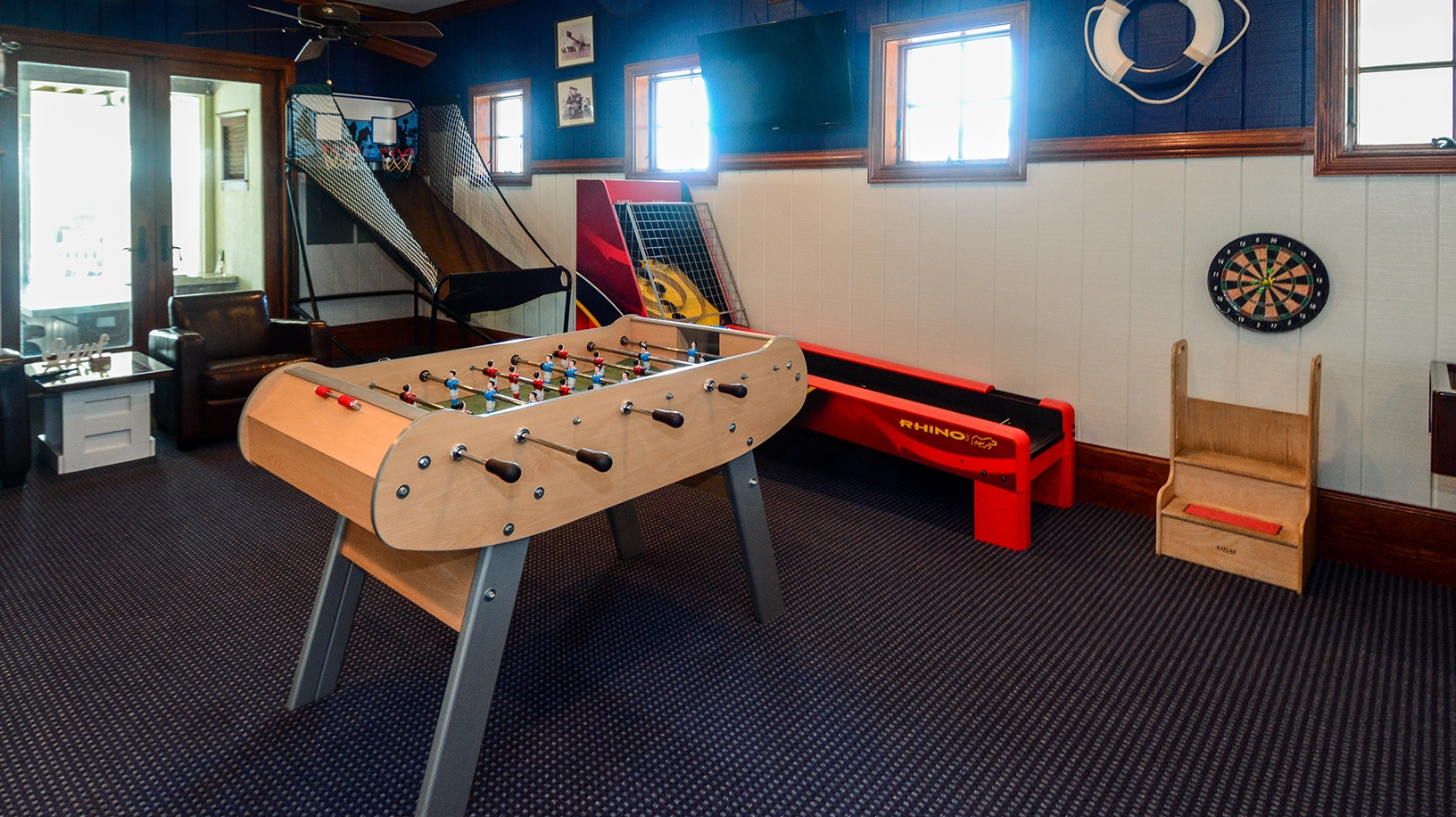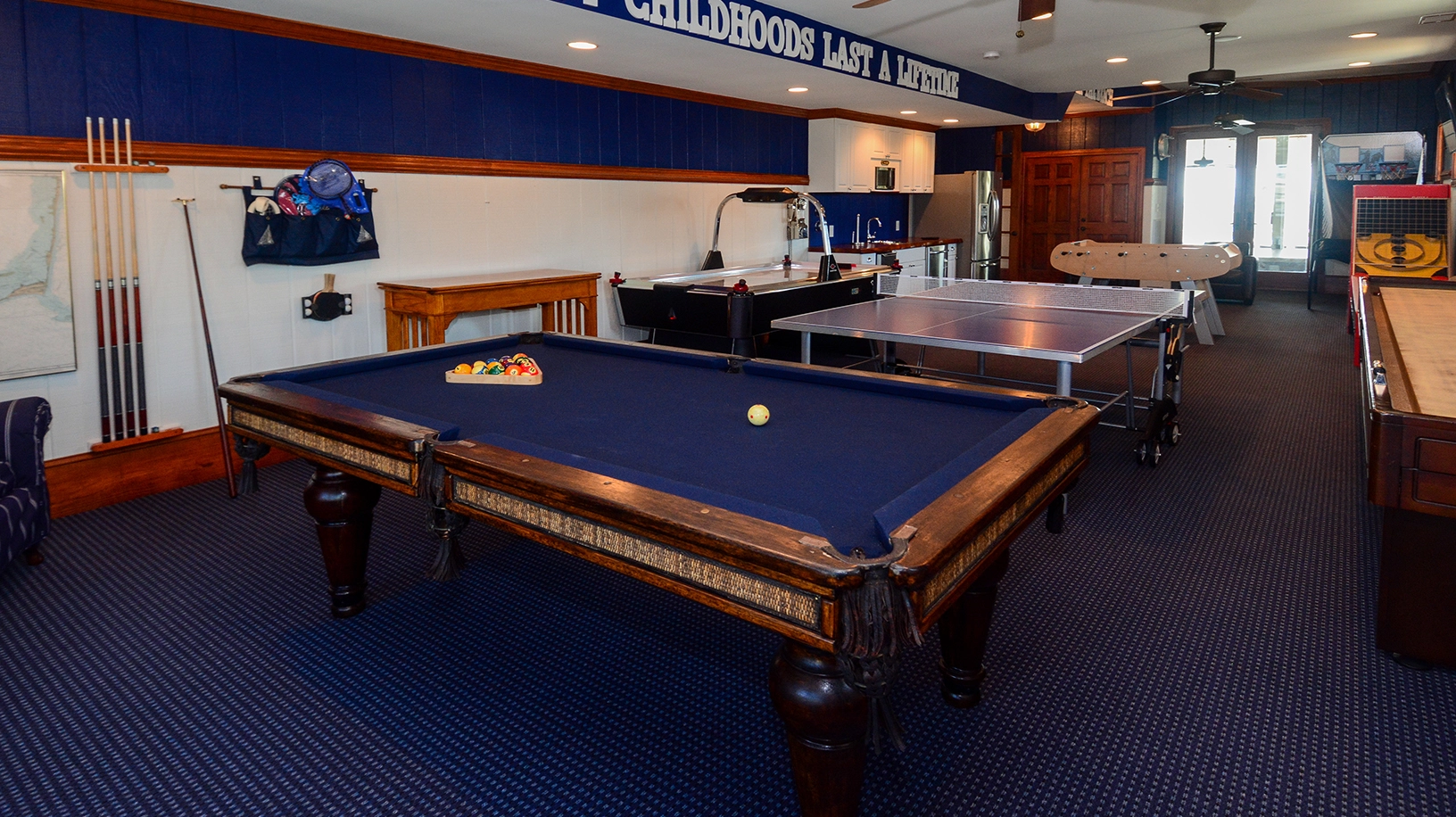 Rec room with pool table, ping pong, air hockey, foosball; shuffleboard, skeeball, and kitchenette with full-size refrigerator and dishwasher; exercise room; laundry.