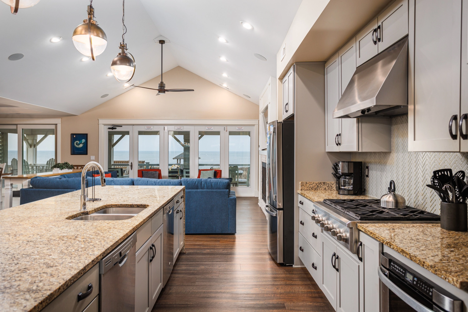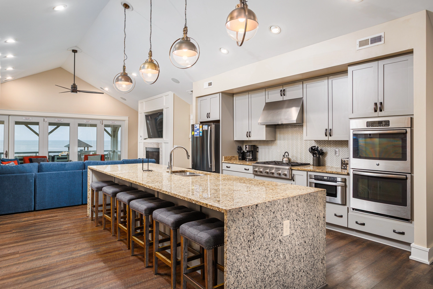 "We loved the outside living space, the pool, the covered decks, the furniture, the beach walkway and gazebo. We liked the layout of the house, the long kitchen bar, the 6 burner GAS stove, the second refrigerator on top floor, the industrial ice maker. Laundry on two floors."