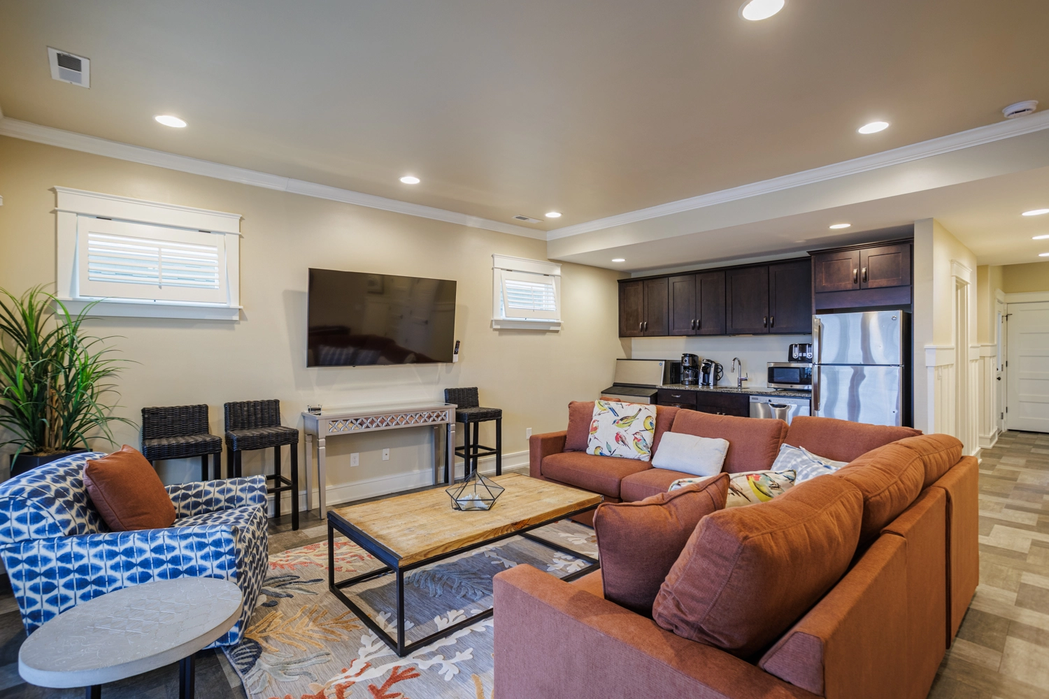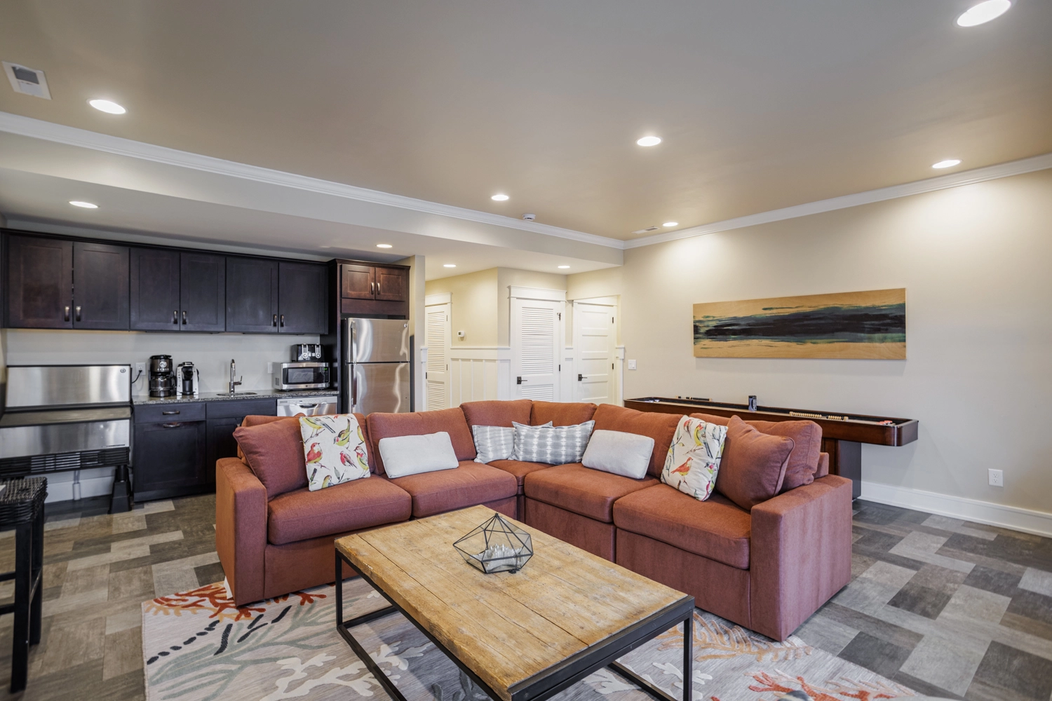 Rec room with shuffleboard and wet bar with refrigerator and dishwasher.
